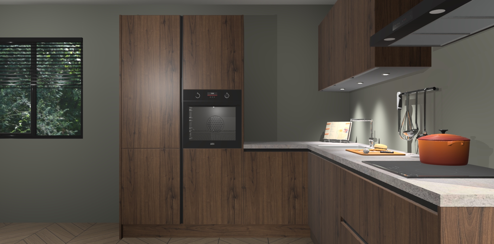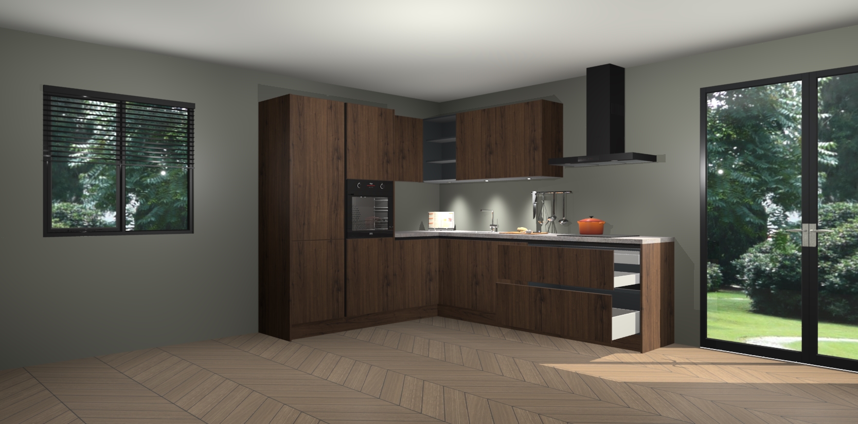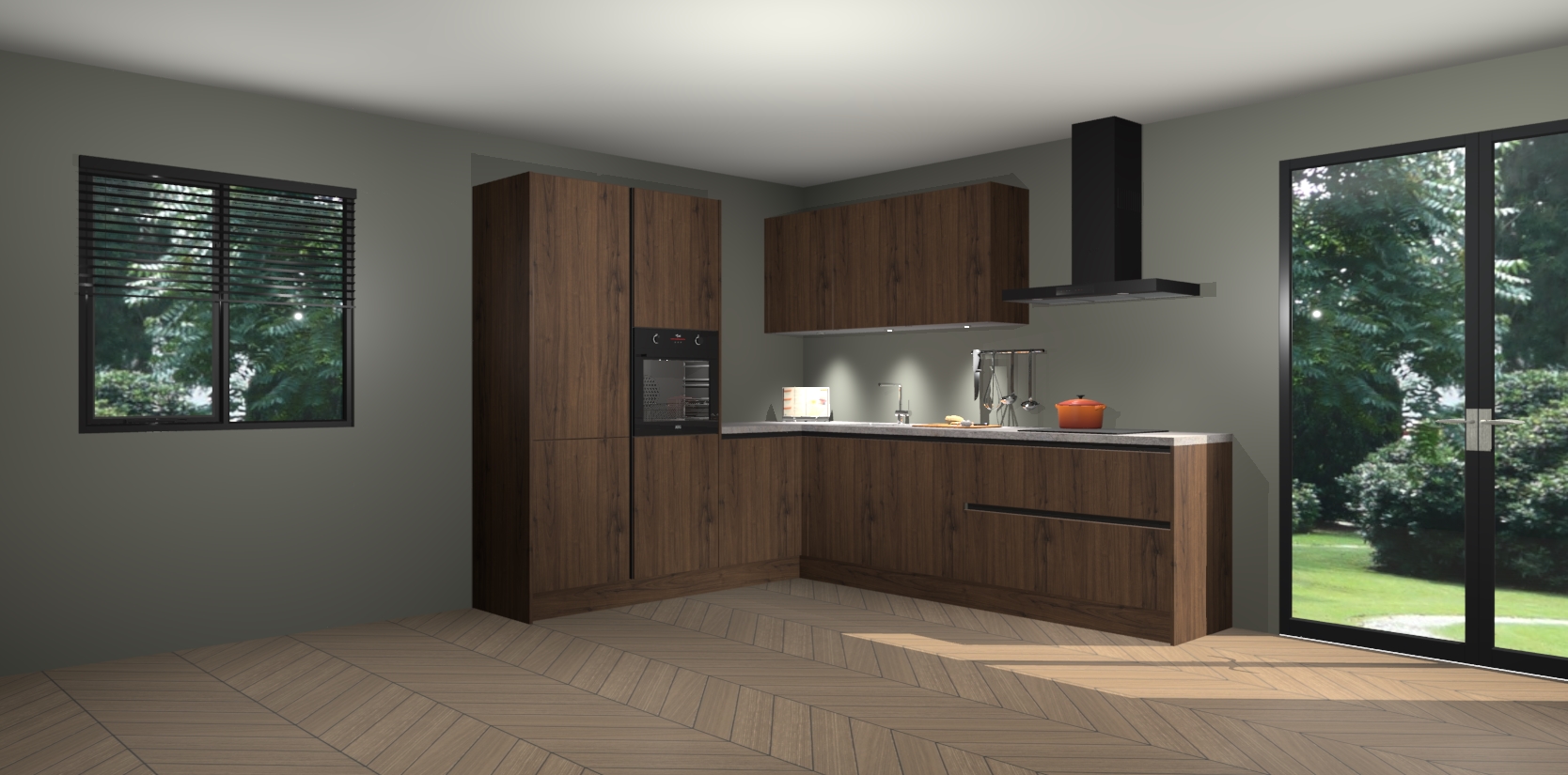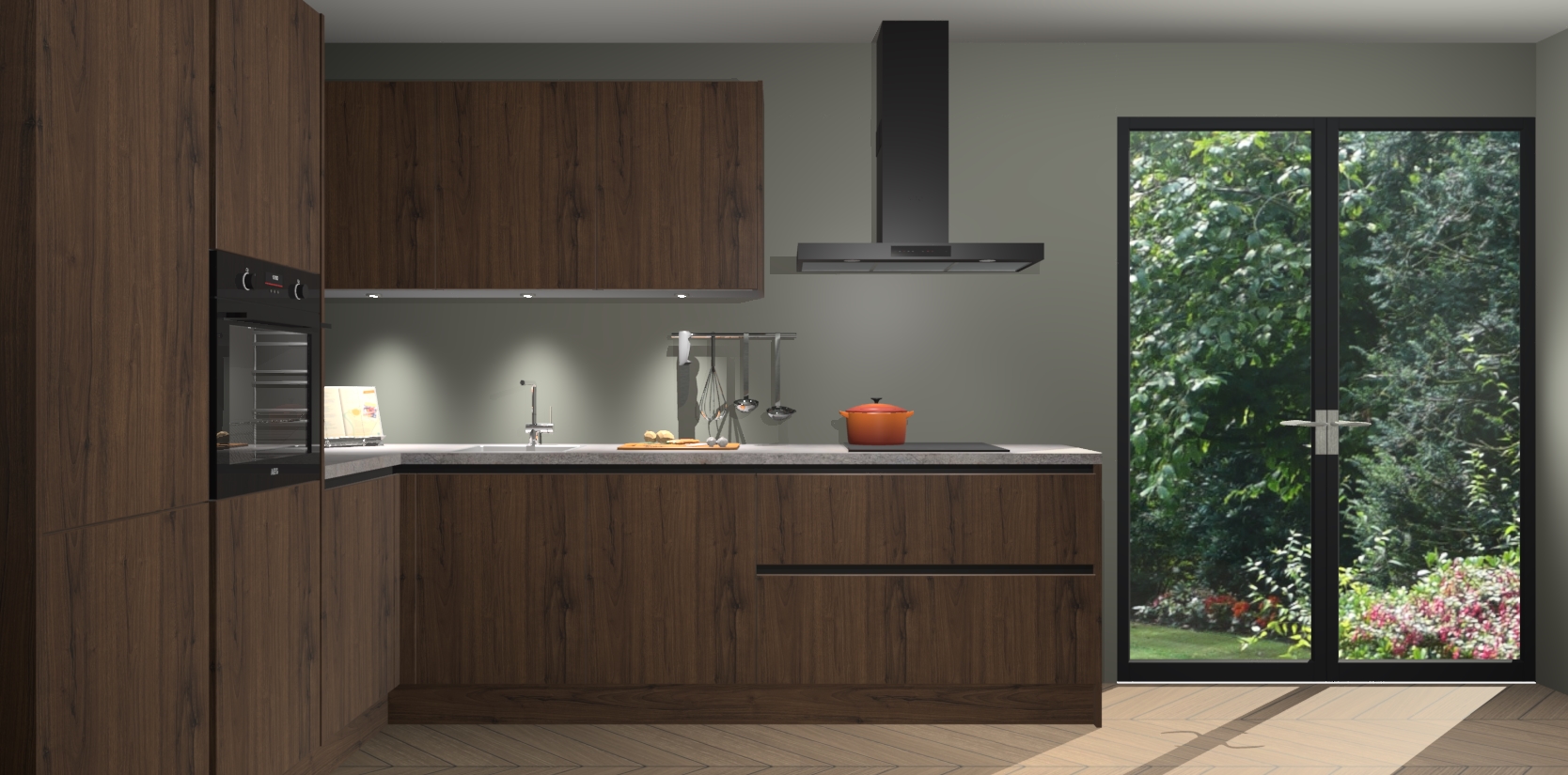 Maak kennis met de noten greeploze keuken Parla - de perfecte aanvulling voor uw moderne keuken! Ervaar tijdloos design, elegantie en een chique uitstraling met onze zwarte handgrepen, soft-close deuren en veel opbergruimte. Dit alles wordt aangeboden tegen een vaste lage prijs voor ongeëvenaarde Duitse keukenkwaliteit!
