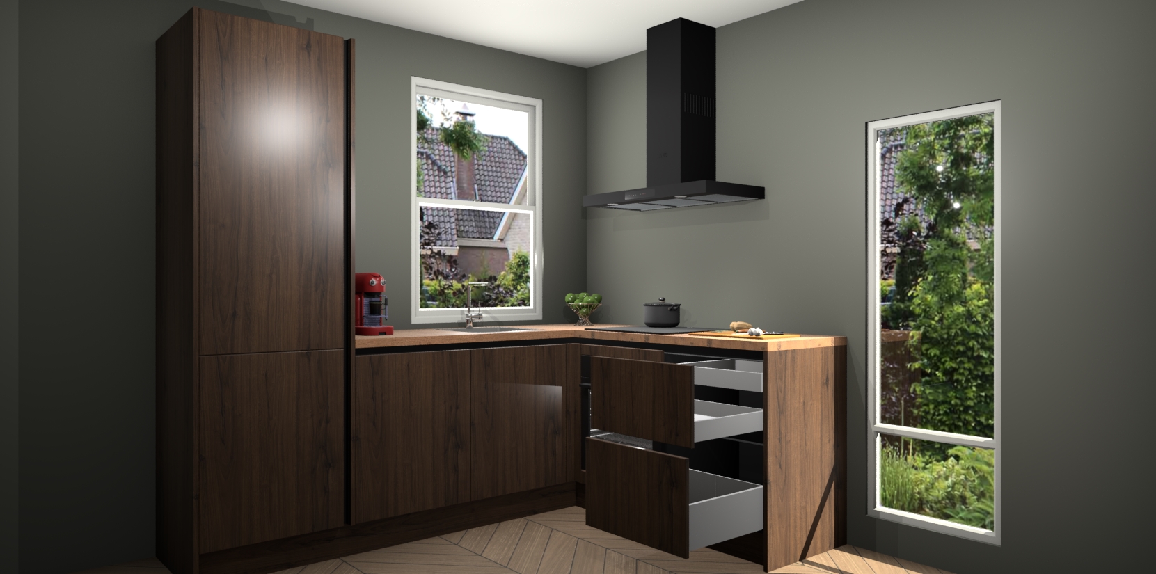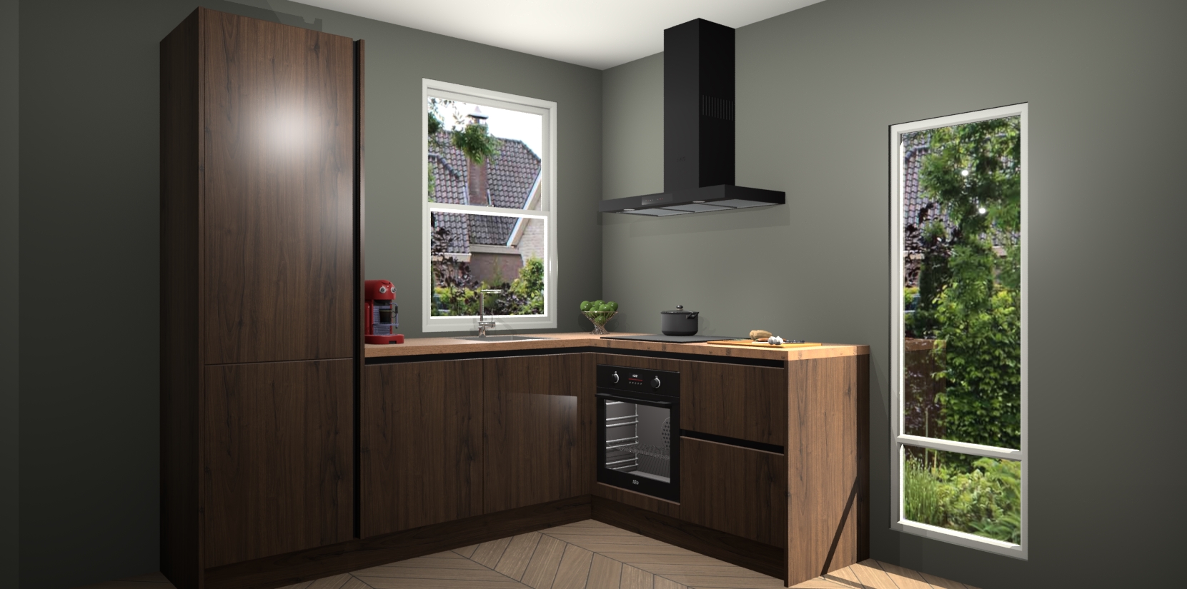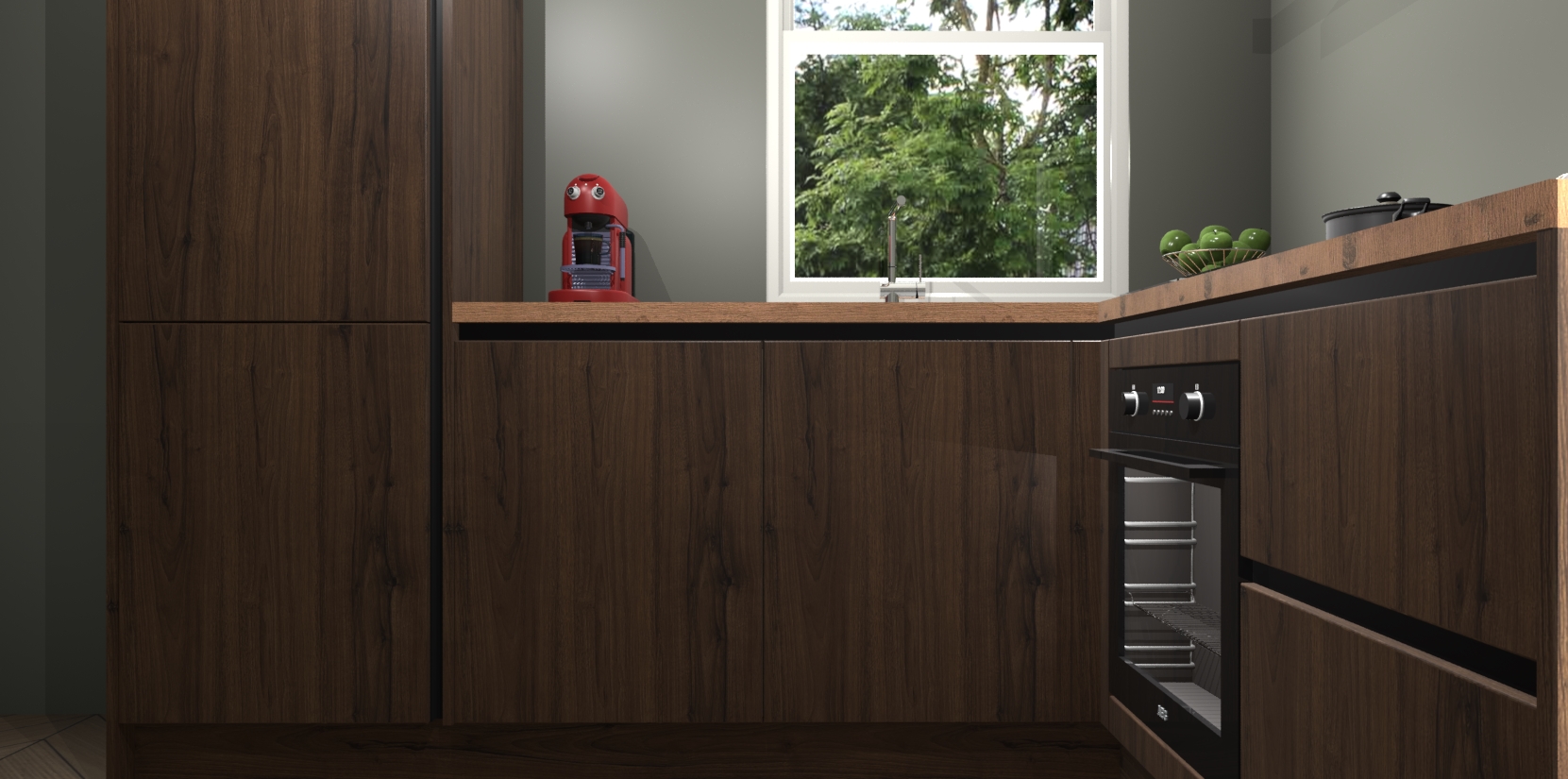 De prachtige Noten greeploze keuken Phuket is de perfecte keuze als u op zoek bent naar een moderne hoekkeuken met alle luxe en comfort die u kunt verwachten! De uitstraling in het houtlook-design draagt bij aan de warme sfeer die u nu al voelt wanneer u er naar kijkt. Heeft u genoeg van ouderwetse keukens? Probeer dan direct deze moderne, mooie hoekkeukens en laat iedereen verbluft achter!