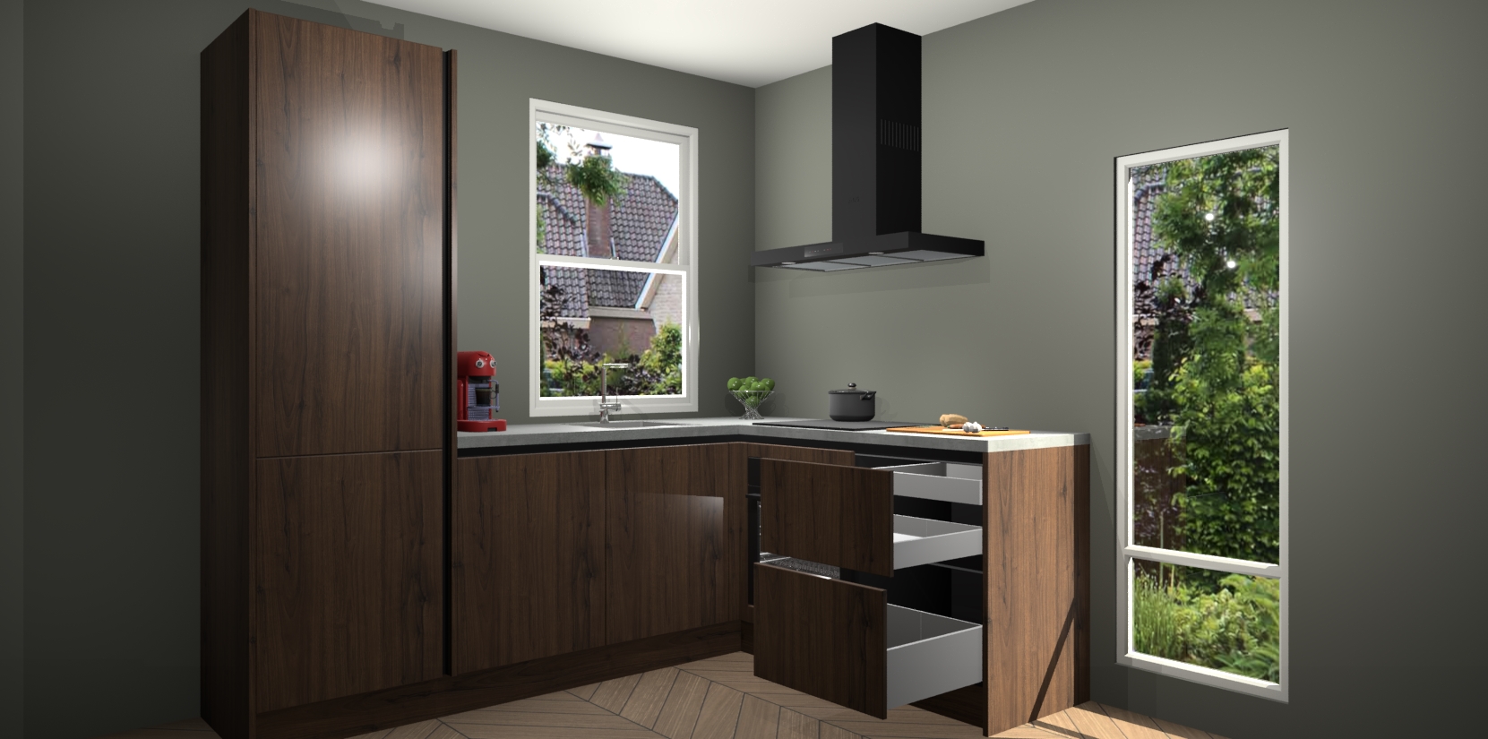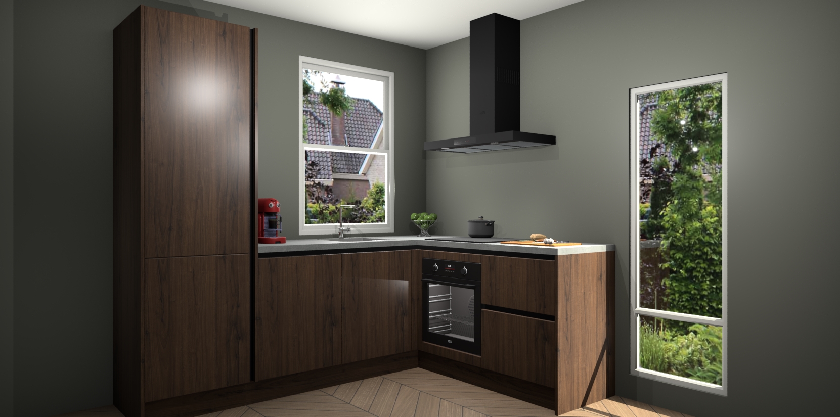 De prachtige Noten greeploze keuken Phuket is de perfecte keuze als u op zoek bent naar een moderne hoekkeuken met alle luxe en comfort die u kunt verwachten! De uitstraling in het houtlook-design draagt bij aan de warme sfeer die u nu al voelt wanneer u er naar kijkt. Heeft u genoeg van ouderwetse keukens? Probeer dan direct deze moderne, mooie hoekkeukens en laat iedereen verbluft achter!