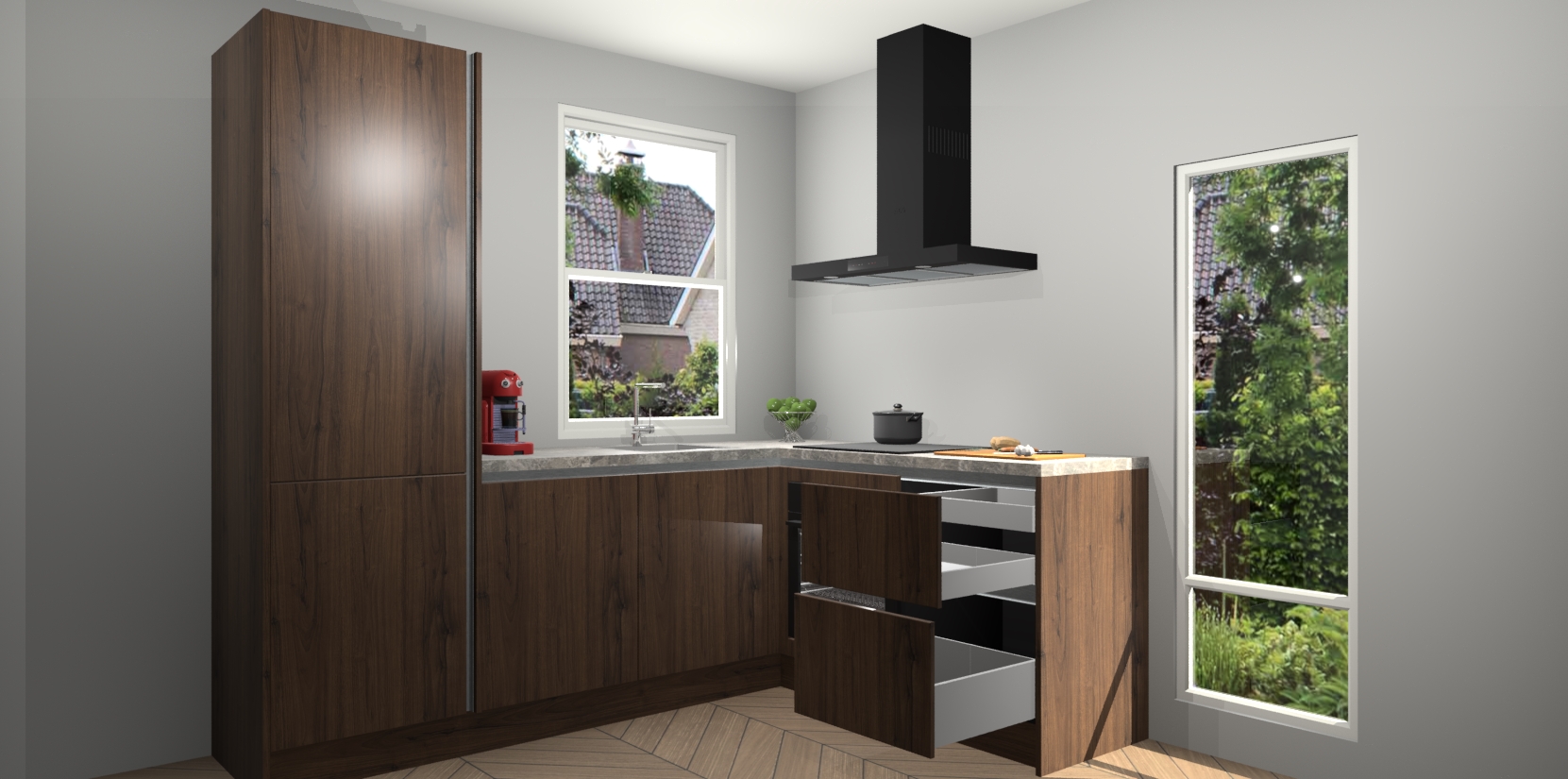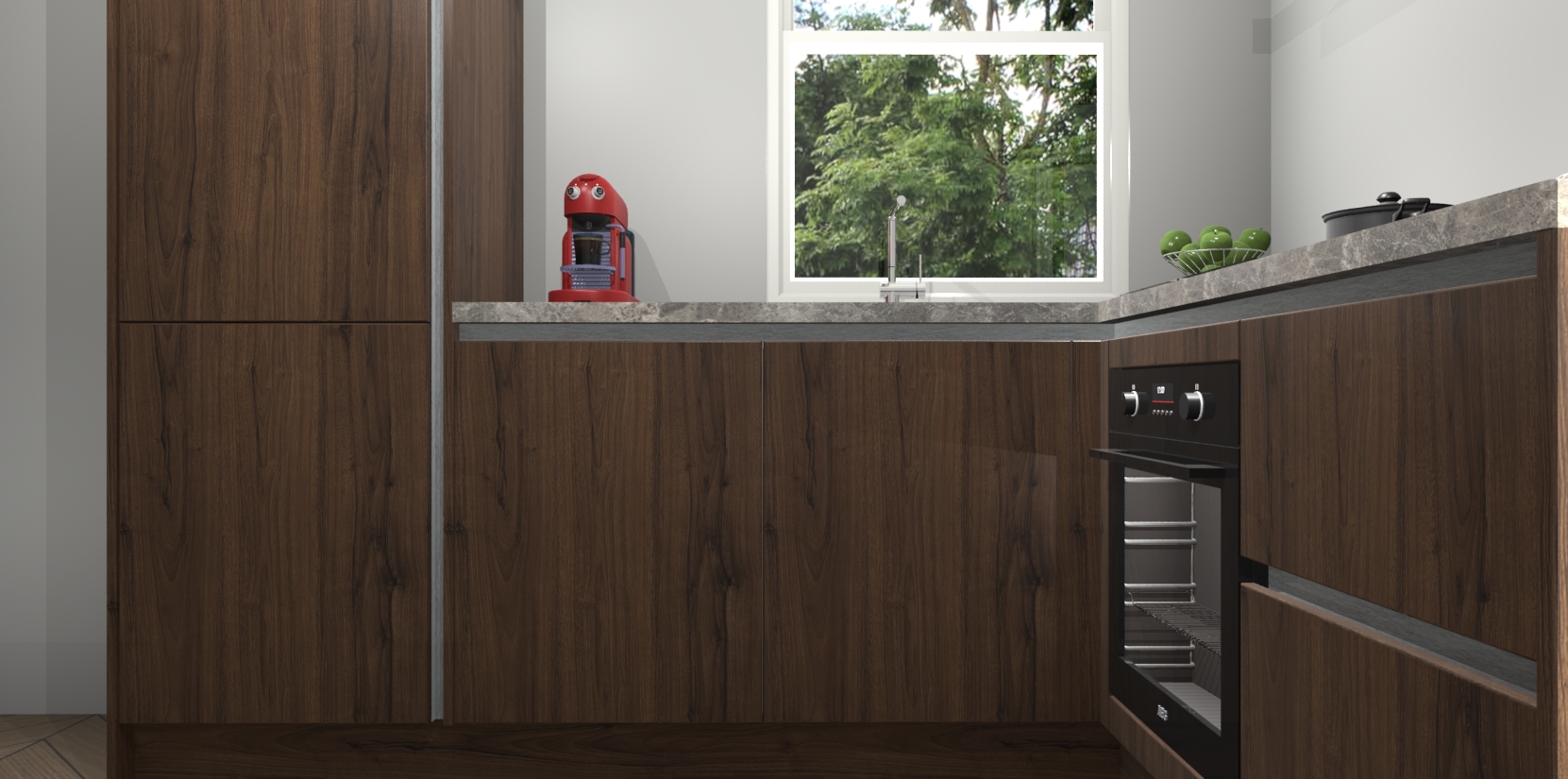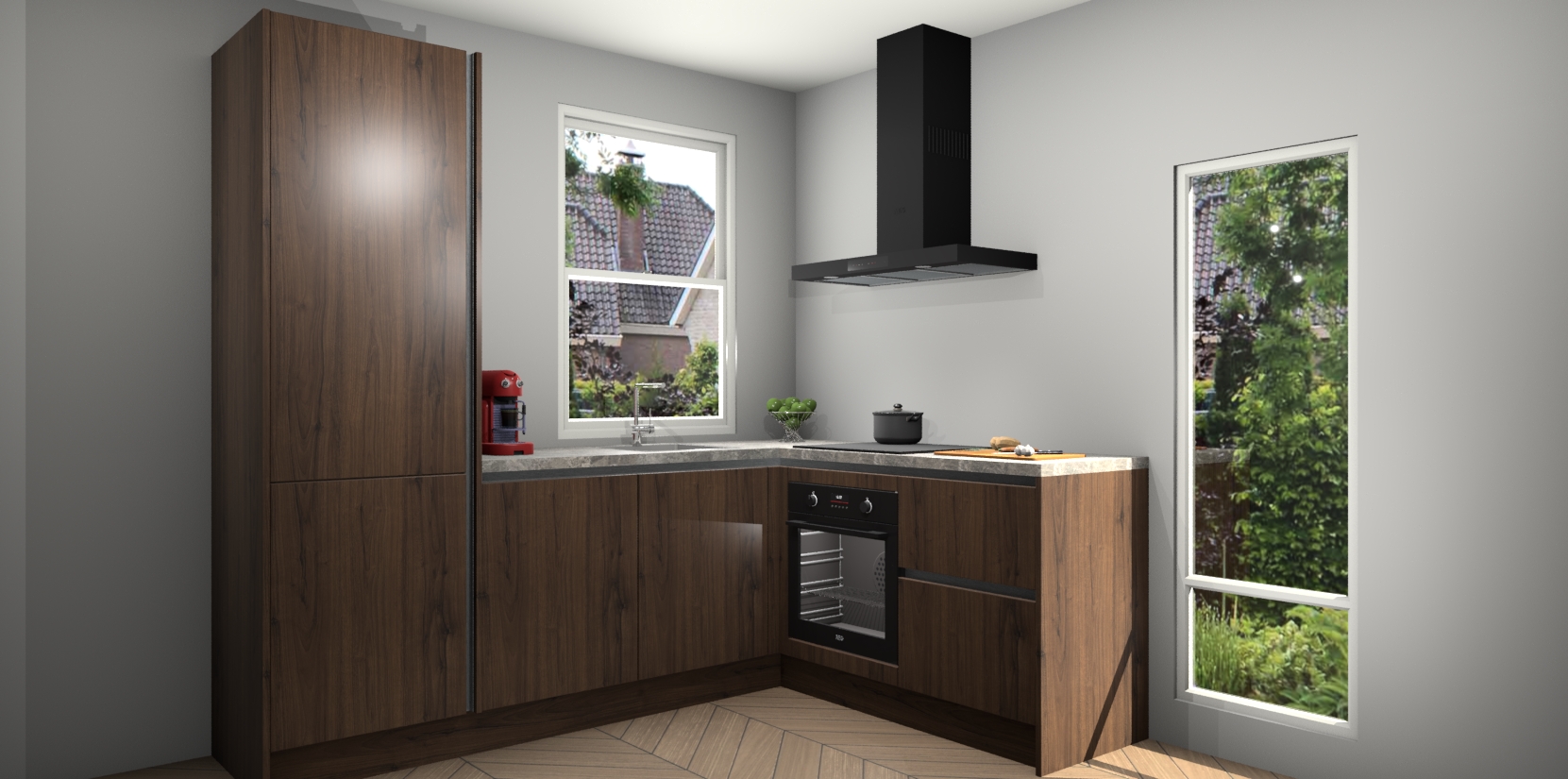 De prachtige Noten greeploze keuken Phuket is de perfecte keuze als u op zoek bent naar een moderne hoekkeuken met alle luxe en comfort die u kunt verwachten! De uitstraling in het houtlook-design draagt bij aan de warme sfeer die u nu al voelt wanneer u er naar kijkt. Heeft u genoeg van ouderwetse keukens? Probeer dan direct deze moderne, mooie hoekkeukens en laat iedereen verbluft achter!
