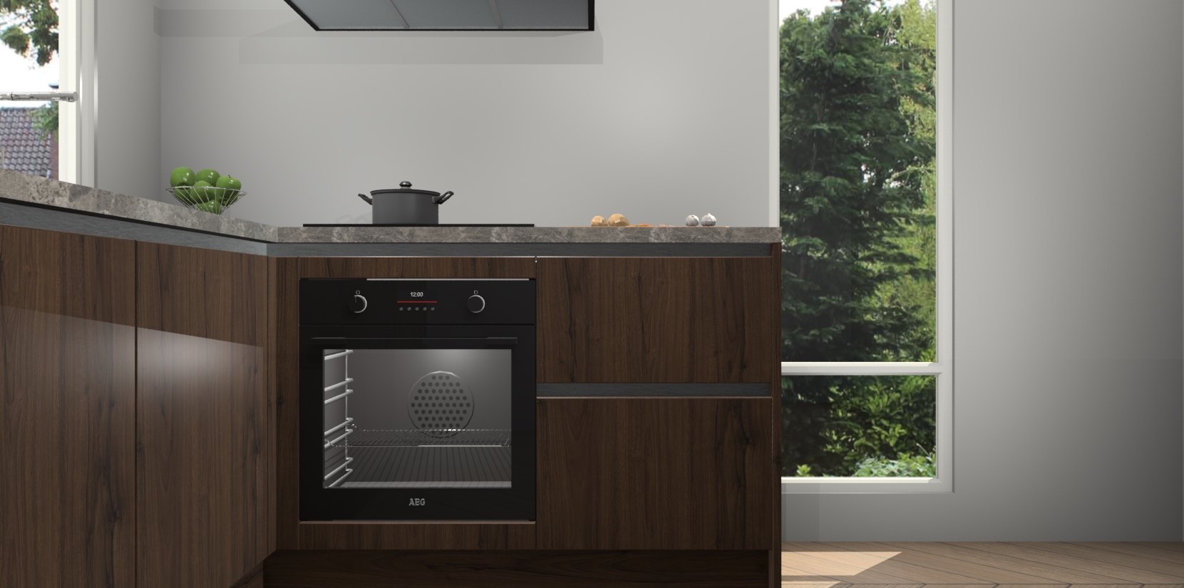 De Noten greeploze keuken Phuket heeft alles wat u maar kunt wensen. Niet alleen zijn er softclose deuren, maar ook 5 ingebouwde apparaten: een oven, inductiekookplaat, afzuigkap, vaatwasser en koelkast - waarbij u later gemakkelijk naar het AEG merk, van inductiekookplaat naar kookplaat met geïntegreerde afzuiging of van oven naar combimagnetron kunt upgraden. Dat alles tegen een vast laag tarief! Bovendien geeft de Noten greeploze keuken Phuket supersnelle levering van 7 weken. Echt iets voor u als u er niet op wilt wachten om het resultaat te zien in eigen keuken!