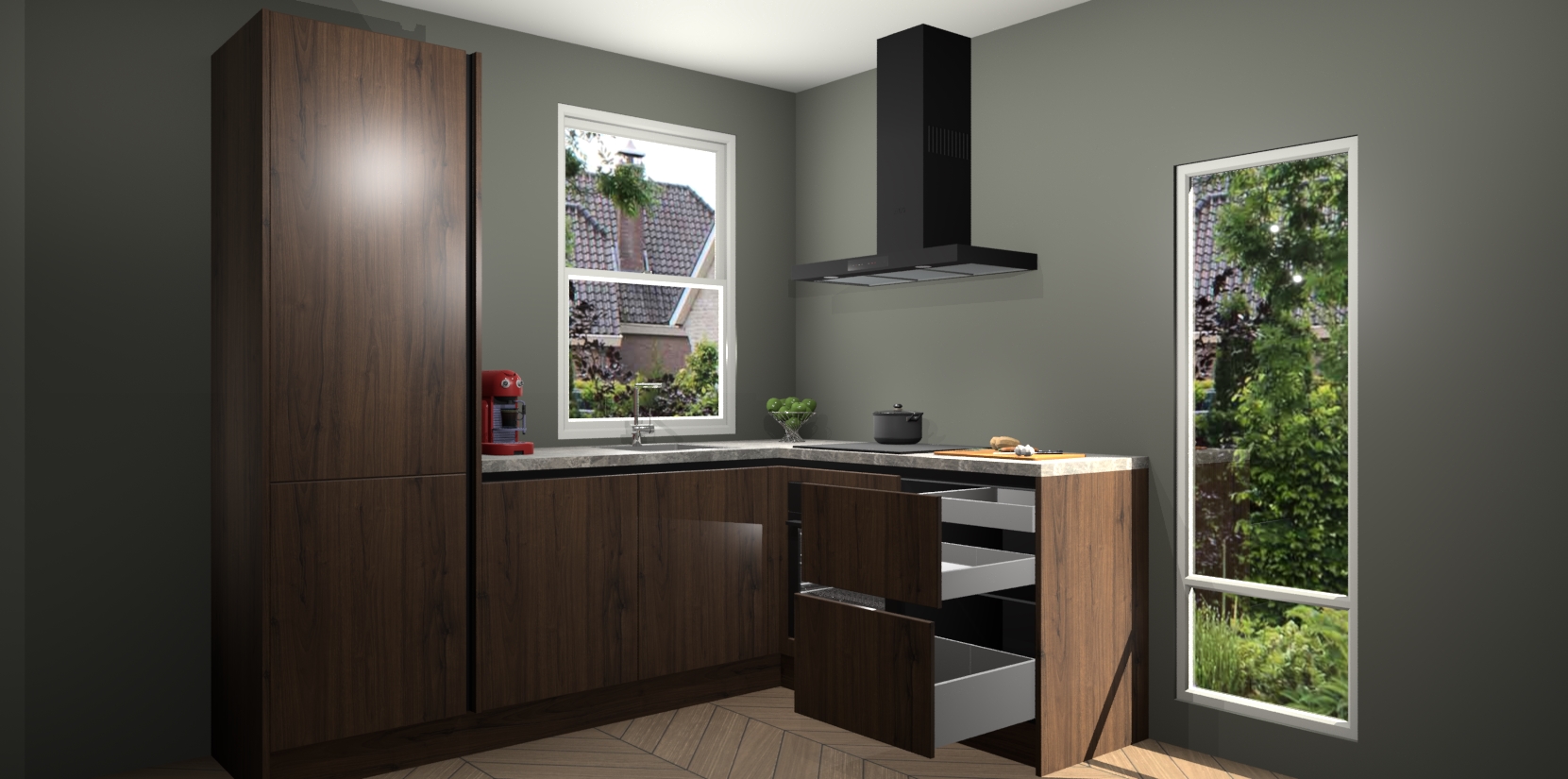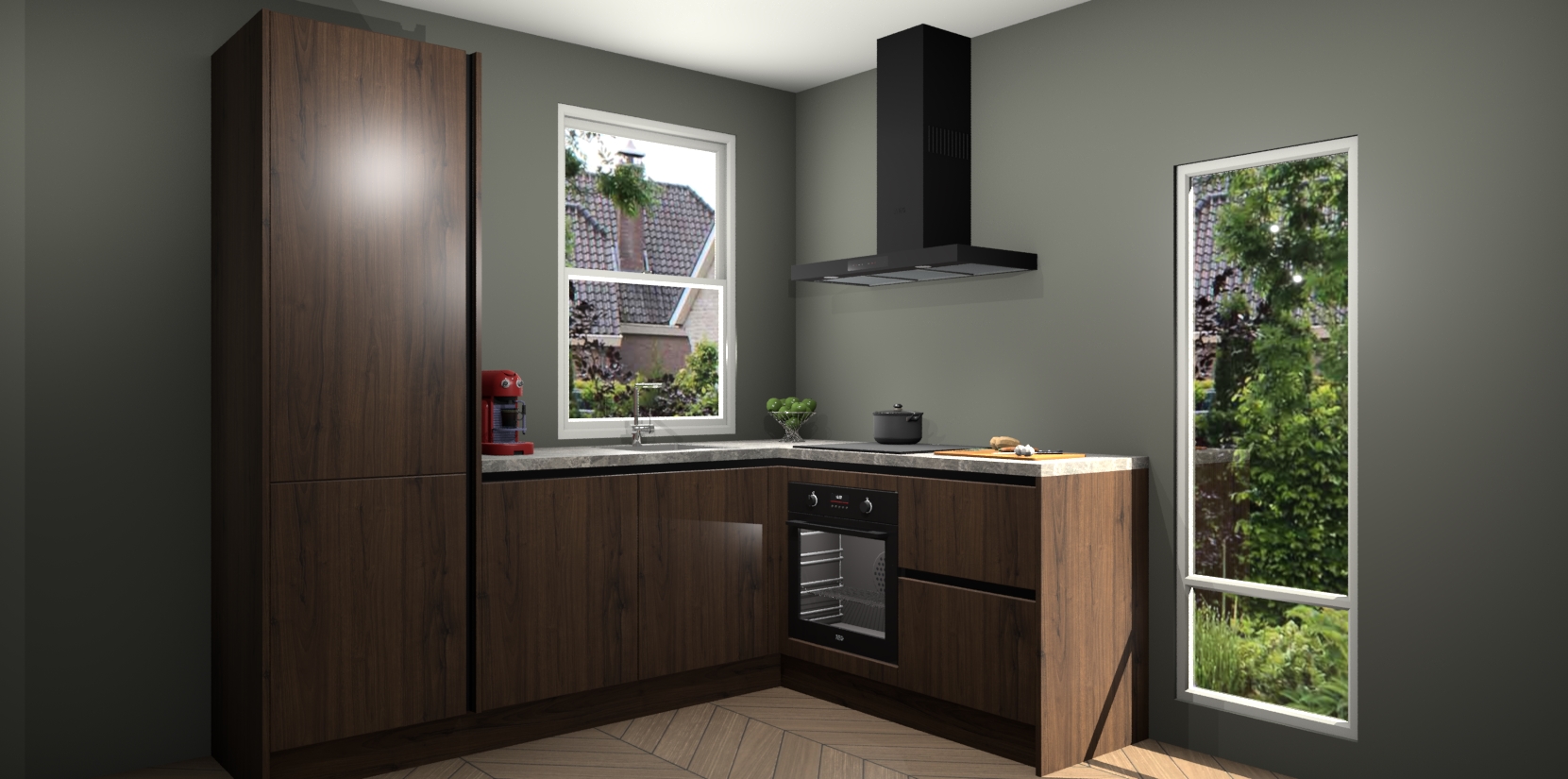 De prachtige Noten greeploze keuken Phuket is de perfecte keuze als u op zoek bent naar een moderne hoekkeuken met alle luxe en comfort die u kunt verwachten! De uitstraling in het houtlook-design draagt bij aan de warme sfeer die u nu al voelt wanneer u er naar kijkt. Heeft u genoeg van ouderwetse keukens? Probeer dan direct deze moderne, mooie hoekkeukens en laat iedereen verbluft achter!