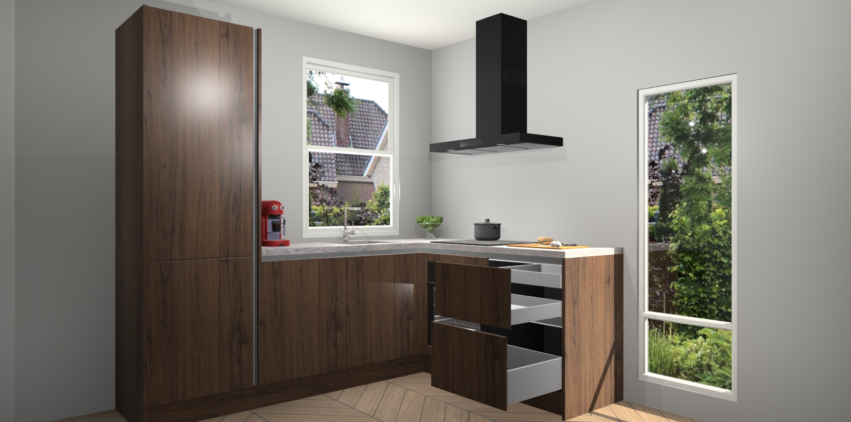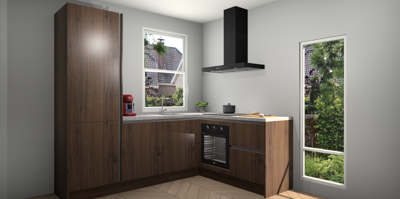 De prachtige Noten greeploze keuken Phuket is de perfecte keuze als u op zoek bent naar een moderne hoekkeuken met alle luxe en comfort die u kunt verwachten! De uitstraling in het houtlook-design draagt bij aan de warme sfeer die u nu al voelt wanneer u er naar kijkt. Heeft u genoeg van ouderwetse keukens? Probeer dan direct deze moderne, mooie hoekkeukens en laat iedereen verbluft achter!