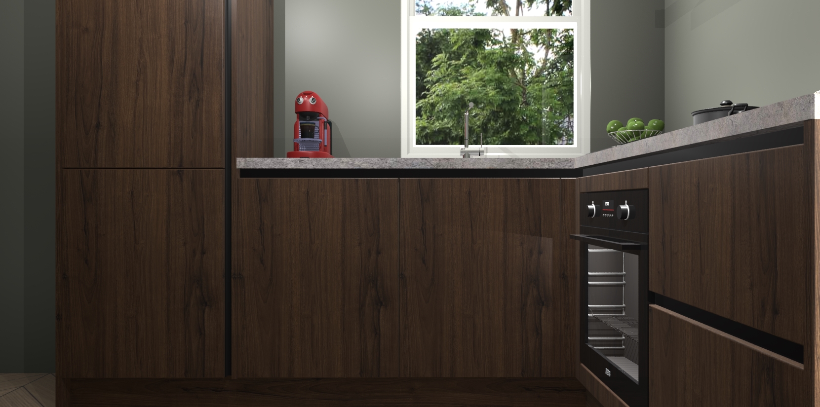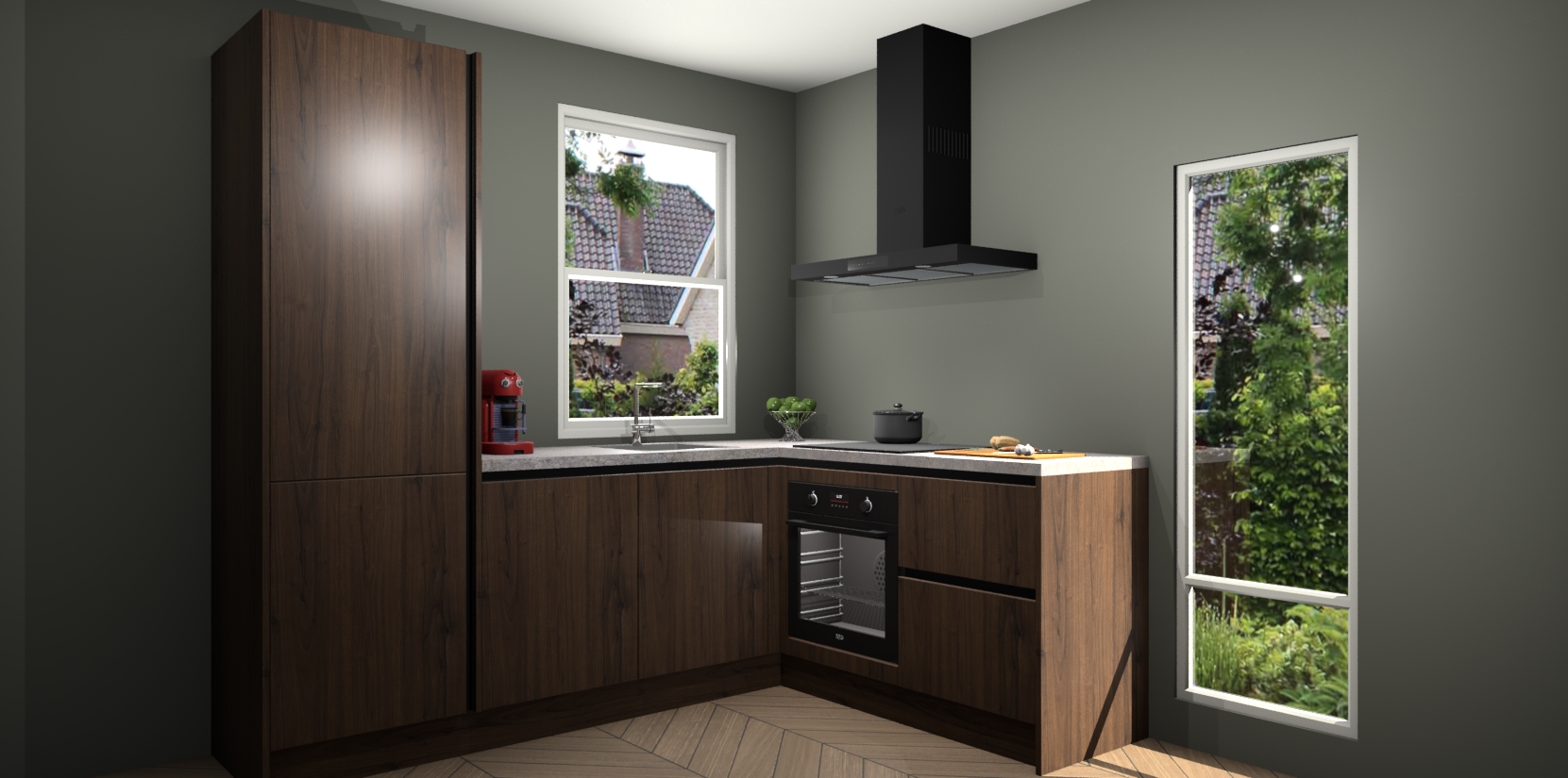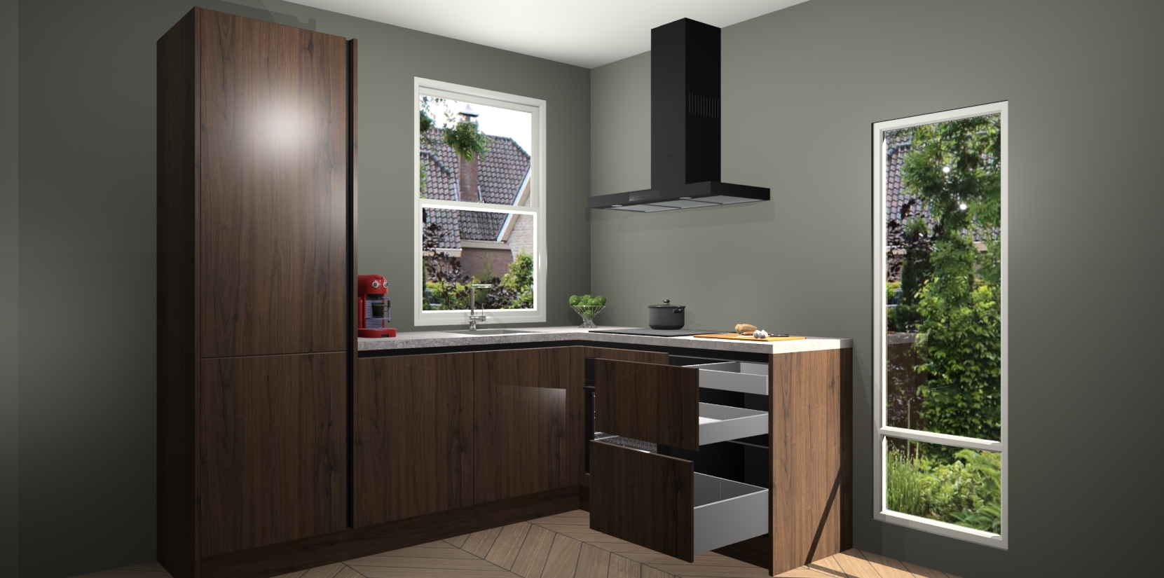 De prachtige Noten greeploze keuken Phuket is de perfecte keuze als u op zoek bent naar een moderne hoekkeuken met alle luxe en comfort die u kunt verwachten! De uitstraling in het houtlook-design draagt bij aan de warme sfeer die u nu al voelt wanneer u er naar kijkt. Heeft u genoeg van ouderwetse keukens? Probeer dan direct deze moderne, mooie hoekkeukens en laat iedereen verbluft achter!