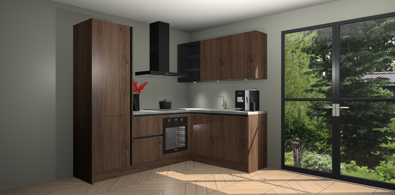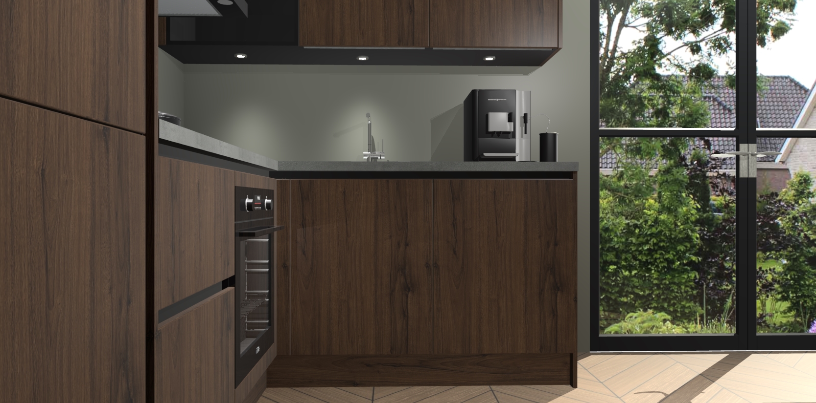 Wauw, dit is de Noten greeploze keuken Pilsen! U kunt gerust zeggen dat u elegantie combineert met functionaliteit met deze keuken. Met een modern en chique ontwerp is de keuken precies wat u nodig heeft om uw ruimte te verfraaien. De binnenzijde van de kasten is in dezelfde donkere kleur als de buitenzijde voor een uniforme look, compleet met softclose-kasten die stil sluiten.
