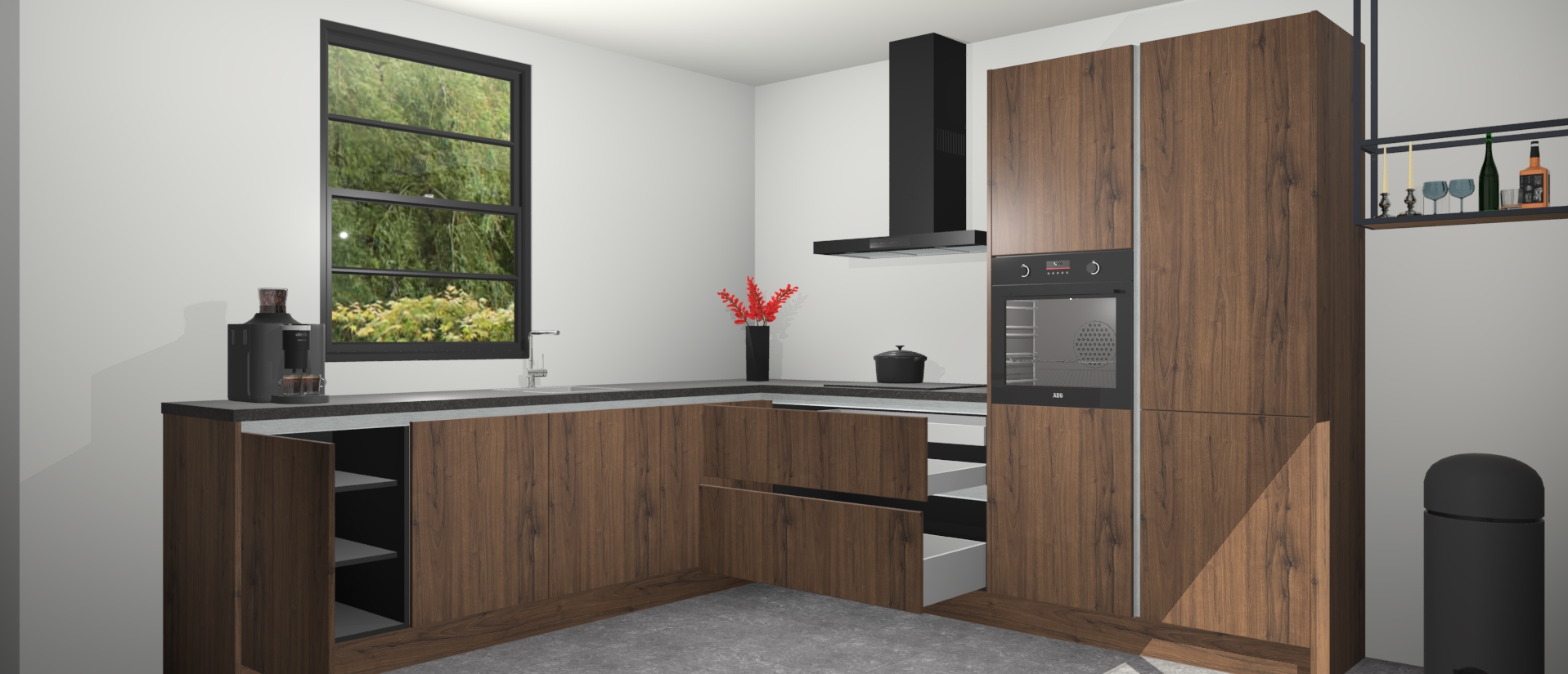 De greeploze noten keuken Porto heeft 5 ingebouwde apparaten - een oven, inductiekookplaat, afzuigkap, vaatwasser en koelkast - waarmee u in een handomdraai heerlijke gerechten bereidt. Soft-close deuren zorgen voor nog meer functionaliteit en gemak. En dit alles voor een onverslaanbaar vaste prijs. En als u nu bestelt, duurt de levering maar 7 weken! Wat nog ongelooflijker is, is dat onze kasten voor gemonteerd worden geleverd.