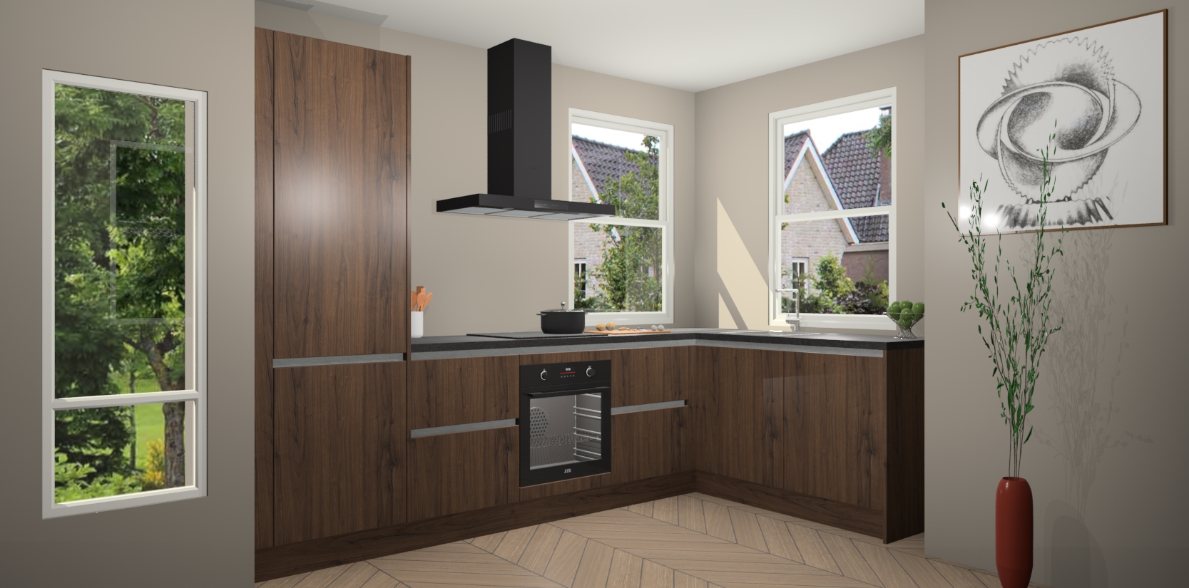 Wat maakt deze keuken zo bijzonder? Ten eerste geeft het houten werkblad uw ruimte een onmiskenbaar klassieke uitstraling. De natuurlijke afwerking roept warmte en elegantie op die nooit uit de mode zullen raken. Bovendien is het gemakkelijk schoon te houden en te onderhouden, zodat je er jarenlang plezier van kunt hebben. Als u op zoek bent naar extra gemak in uw keuken, dan heeft u bij het plaatsen van een bestelling bij ons ook de optie om uw toestellen te upgraden naar AEG-modellen - zo haalt u moderne innovatie van topmerken in apparatentechnologie rechtstreeks in huis.