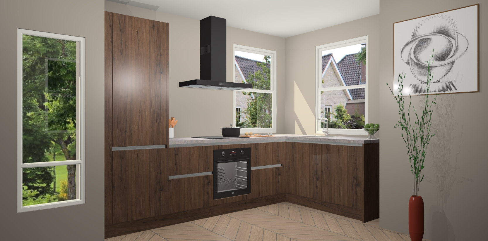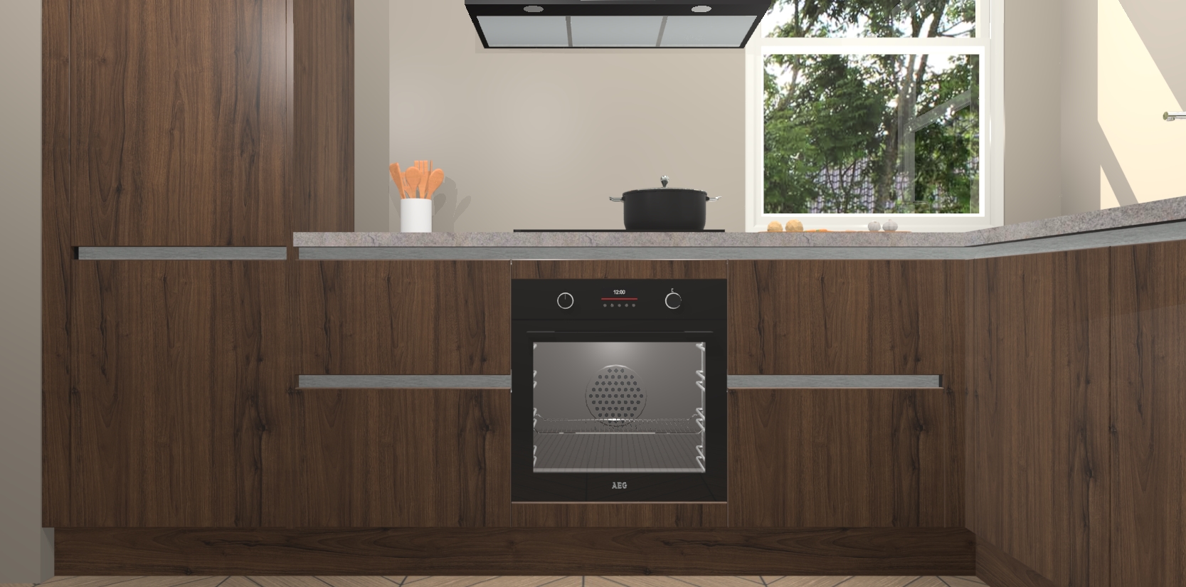 Wat maakt deze keuken zo bijzonder? Ten eerste geeft het houten werkblad uw ruimte een onmiskenbaar klassieke uitstraling. De natuurlijke afwerking roept warmte en elegantie op die nooit uit de mode zullen raken. Bovendien is het gemakkelijk schoon te houden en te onderhouden, zodat je er jarenlang plezier van kunt hebben. Als u op zoek bent naar extra gemak in uw keuken, dan heeft u bij het plaatsen van een bestelling bij ons ook de optie om uw toestellen te upgraden naar AEG-modellen - zo haalt u moderne innovatie van topmerken in apparatentechnologie rechtstreeks in huis.