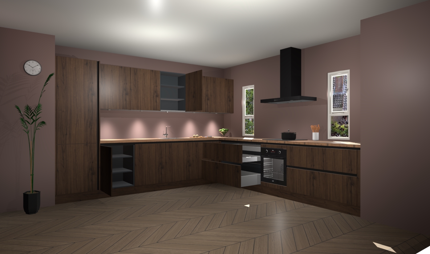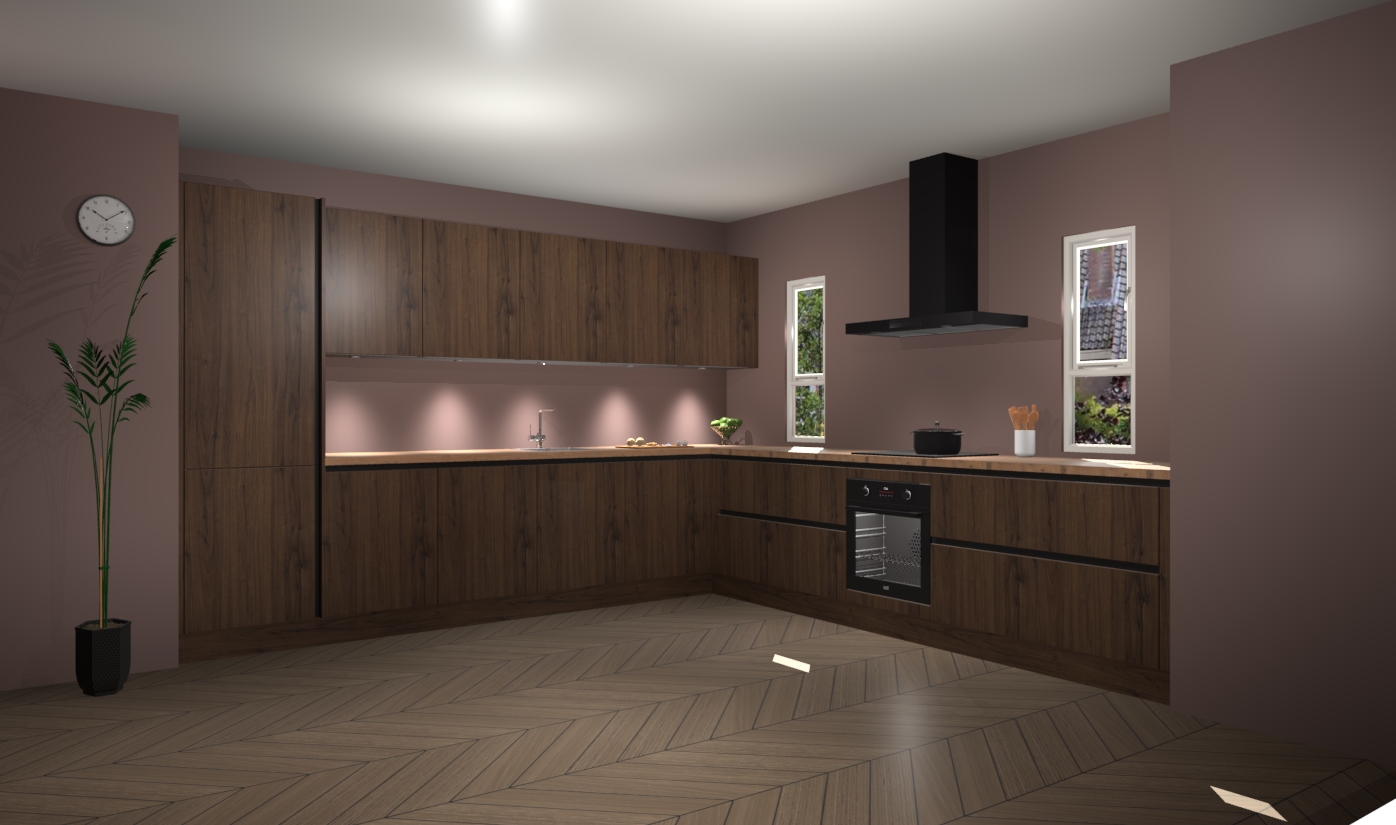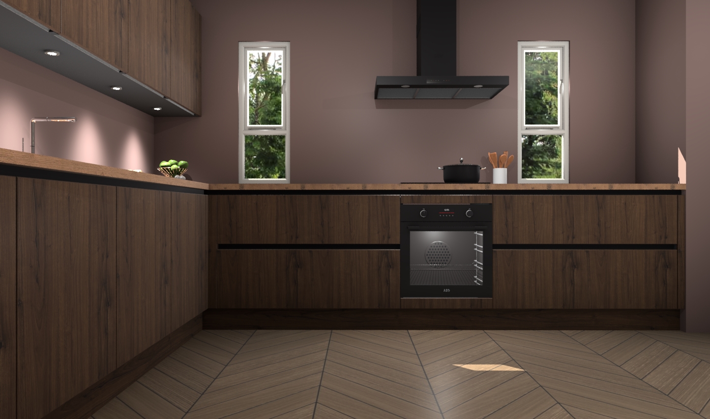 De noten greeploze keuken is een ideale hoekkeuken en heeft alle functies en apparatuur die u maar nodig kunt hebben. Bij de bestelling krijgt u een oven, inductiekookplaat, afzuigkap, vaatwasser en koelkast - deze kunnen desgewenst eenvoudig worden uitgebreid naar AEG na bestellen. Elke kast wordt ook voor gemonteerd geleverd met soft close deuren die jarenlang gebruik beloven. Stelt u zich voor dat u geen gedoe heeft met vervelende montage - vanaf het moment dat u uw bestelling plaats, duurt het slechts 7 weken voor het bij u thuis geleverd wordt.