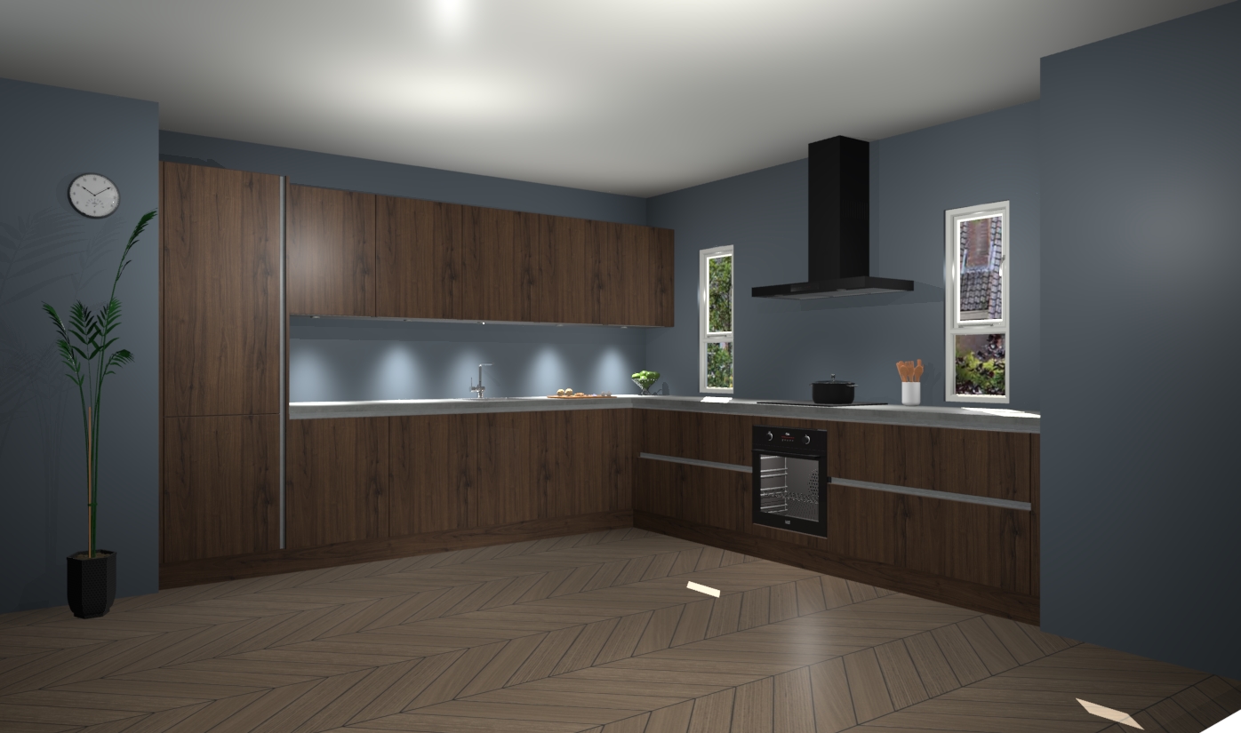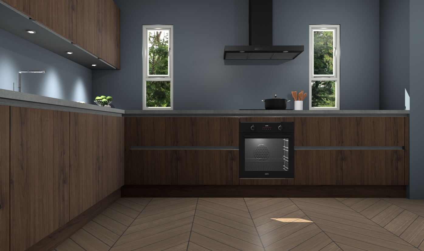 De noten greeploze keuken is een ideale hoekkeuken en heeft alle functies en apparatuur die u maar nodig kunt hebben. Bij de bestelling krijgt u een oven, inductiekookplaat, afzuigkap, vaatwasser en koelkast - deze kunnen desgewenst eenvoudig worden uitgebreid naar AEG na bestellen. Elke kast wordt ook voor gemonteerd geleverd met soft close deuren die jarenlang gebruik beloven. Stelt u zich voor dat u geen gedoe heeft met vervelende montage - vanaf het moment dat u uw bestelling plaats, duurt het slechts 7 weken voor het bij u thuis geleverd wordt.