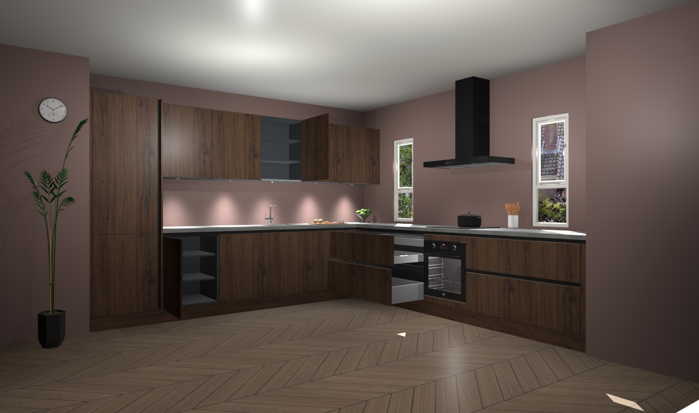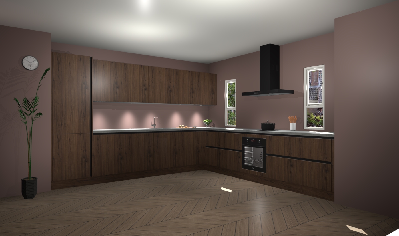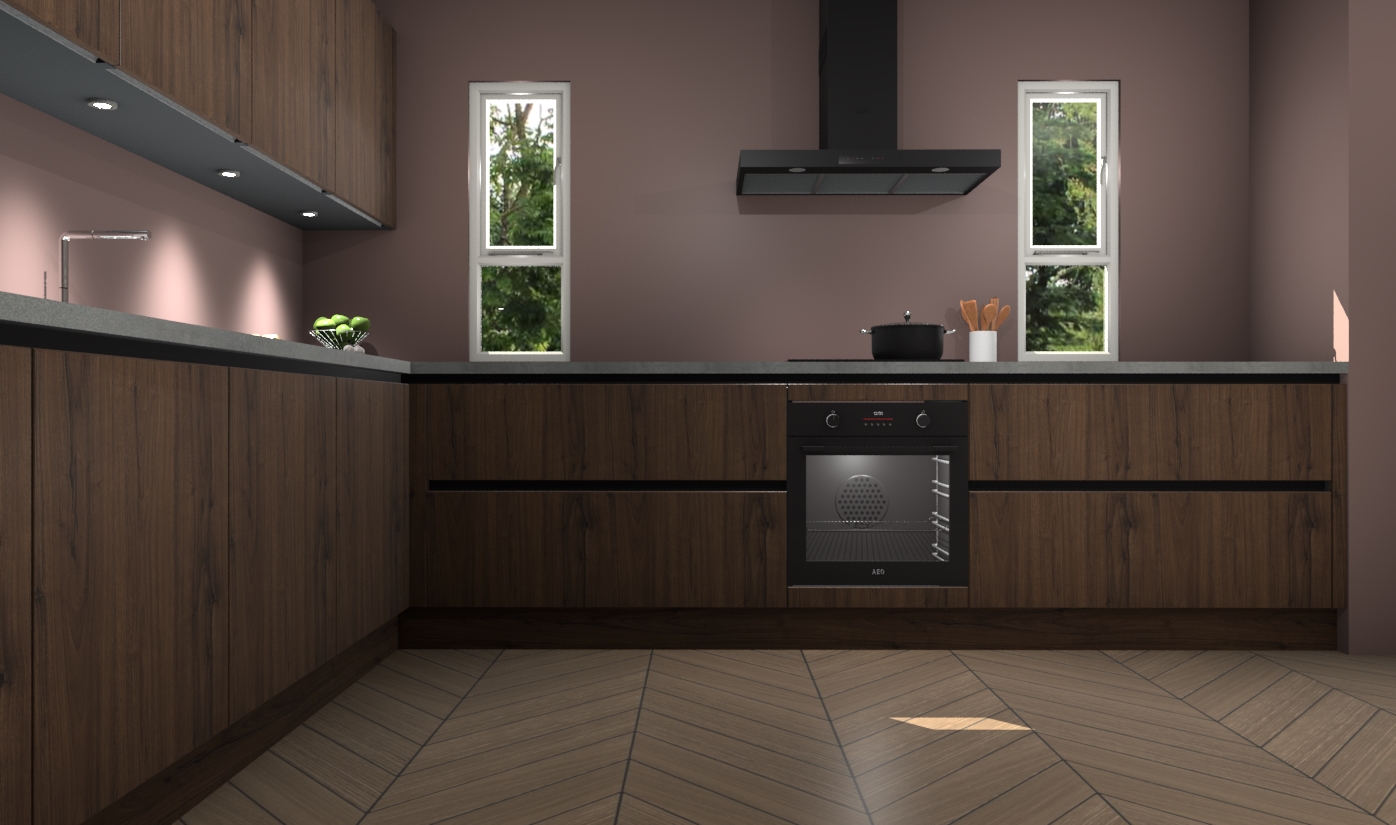 De noten greeploze keuken is een ideale hoekkeuken en heeft alle functies en apparatuur die u maar nodig kunt hebben. Bij de bestelling krijgt u een oven, inductiekookplaat, afzuigkap, vaatwasser en koelkast - deze kunnen desgewenst eenvoudig worden uitgebreid naar AEG na bestellen. Elke kast wordt ook voor gemonteerd geleverd met soft close deuren die jarenlang gebruik beloven. Stelt u zich voor dat u geen gedoe heeft met vervelende montage - vanaf het moment dat u uw bestelling plaats, duurt het slechts 7 weken voor het bij u thuis geleverd wordt.