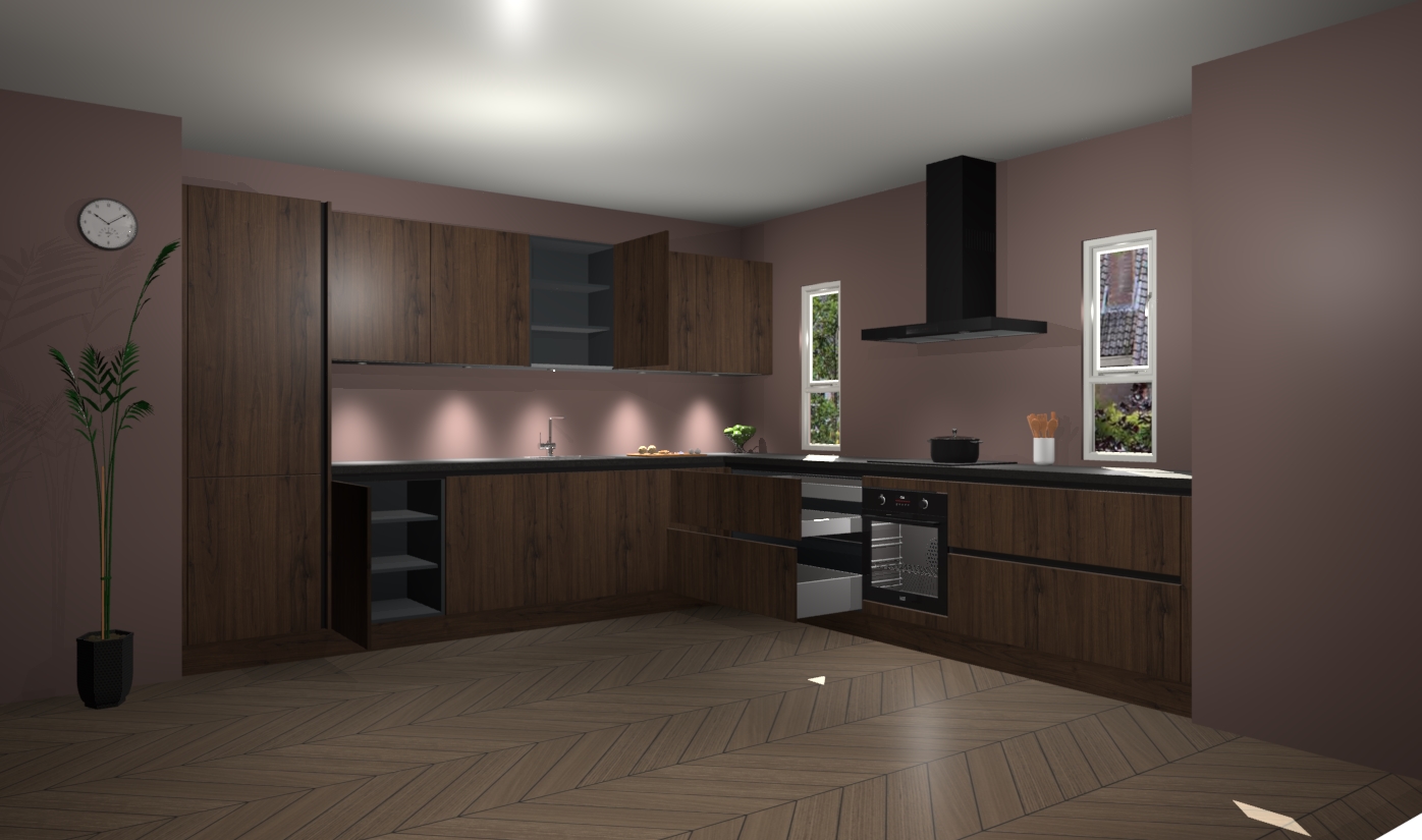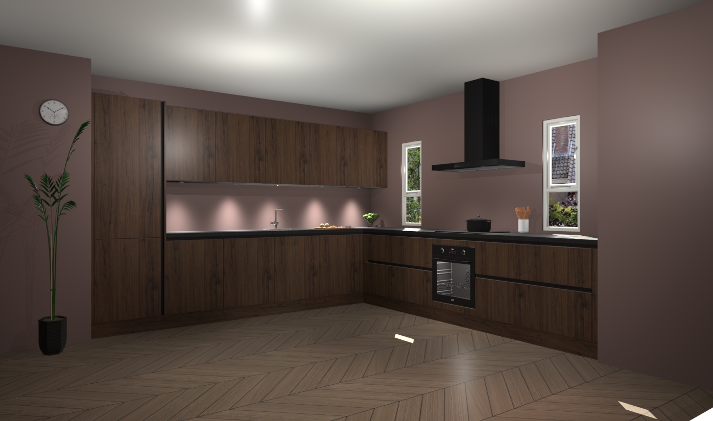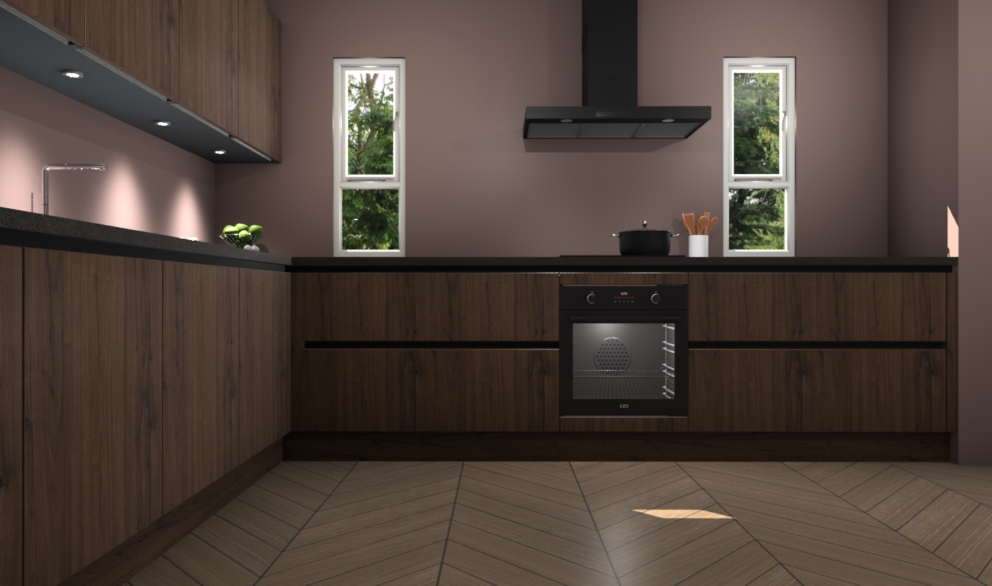 De noten greeploze keuken is een ideale hoekkeuken en heeft alle functies en apparatuur die u maar nodig kunt hebben. Bij de bestelling krijgt u een oven, inductiekookplaat, afzuigkap, vaatwasser en koelkast - deze kunnen desgewenst eenvoudig worden uitgebreid naar AEG na bestellen. Elke kast wordt ook voor gemonteerd geleverd met soft close deuren die jarenlang gebruik beloven. Stelt u zich voor dat u geen gedoe heeft met vervelende montage - vanaf het moment dat u uw bestelling plaats, duurt het slechts 7 weken voor het bij u thuis geleverd wordt.