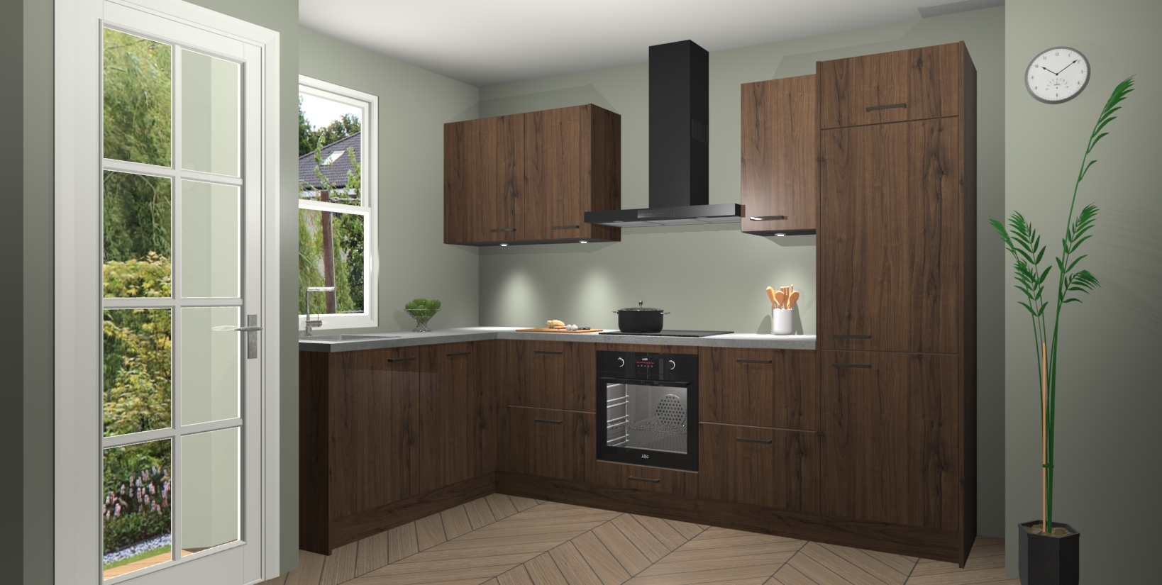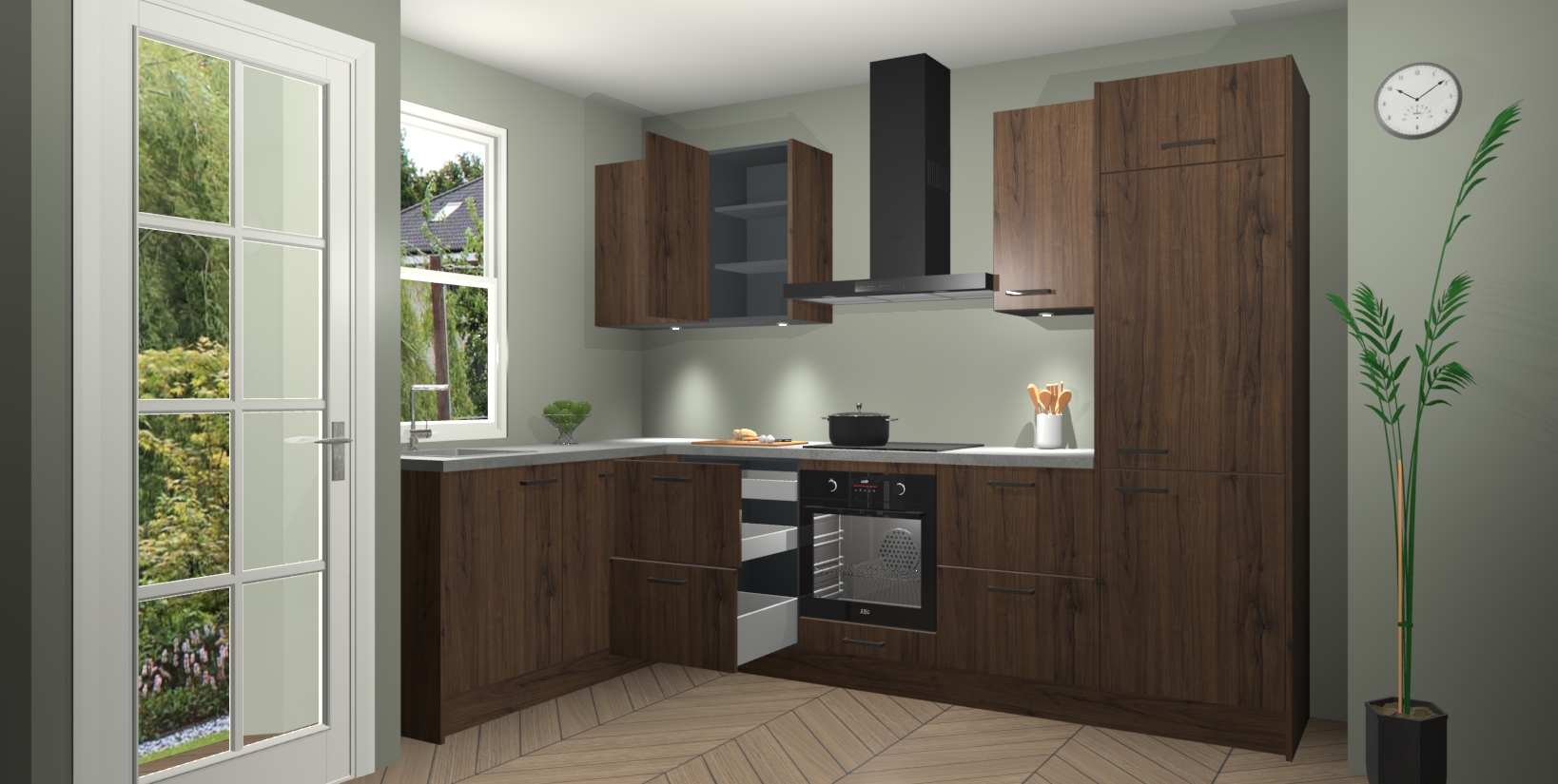 Bent u op zoek naar een strakke, moderne hoekkeuken die uw huis oppept en een moderne uitstraling geeft? Kijk dan niet verder dan de noten keuken Beijing. Deze verbluffende hoekkeuken tilt hedendaags design naar een hoger niveau. Qua stijl is deze chique hoekkeuken voorzien van noten accenten, om een strakke maar opvallende look te creëren. De binnenkant van de kasten is afgewerkt in dezelfde prachtige noten kleur voor extra esthetische aantrekkingskracht.