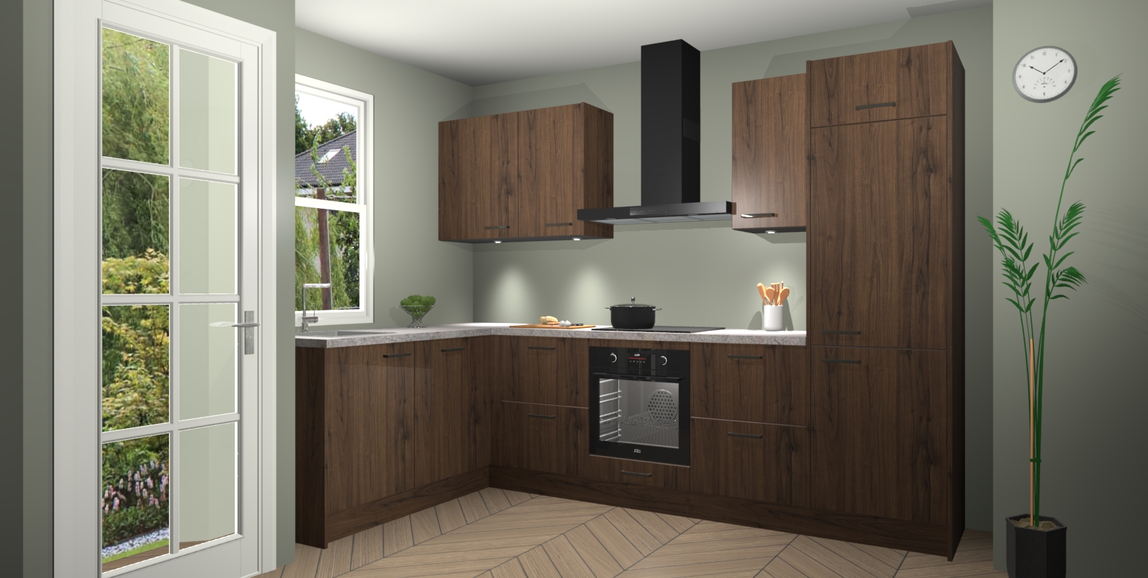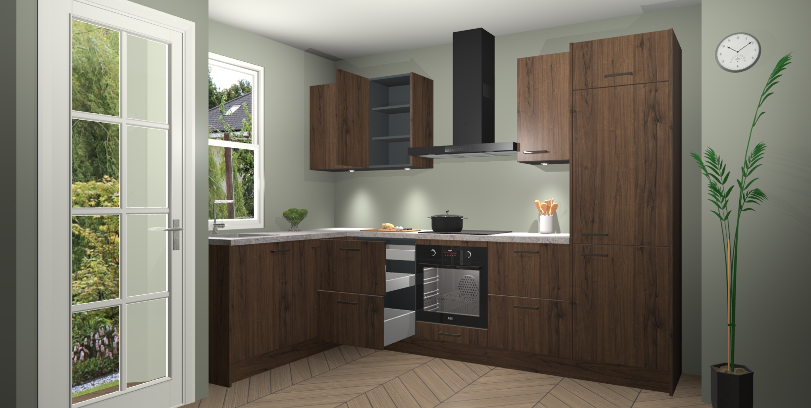 Bent u op zoek naar een strakke, moderne hoekkeuken die uw huis oppept en een moderne uitstraling geeft? Kijk dan niet verder dan de noten keuken Beijing. Deze verbluffende hoekkeuken tilt hedendaags design naar een hoger niveau. Qua stijl is deze chique hoekkeuken voorzien van noten accenten, om een strakke maar opvallende look te creëren. De binnenkant van de kasten is afgewerkt in dezelfde prachtige noten kleur voor extra esthetische aantrekkingskracht.