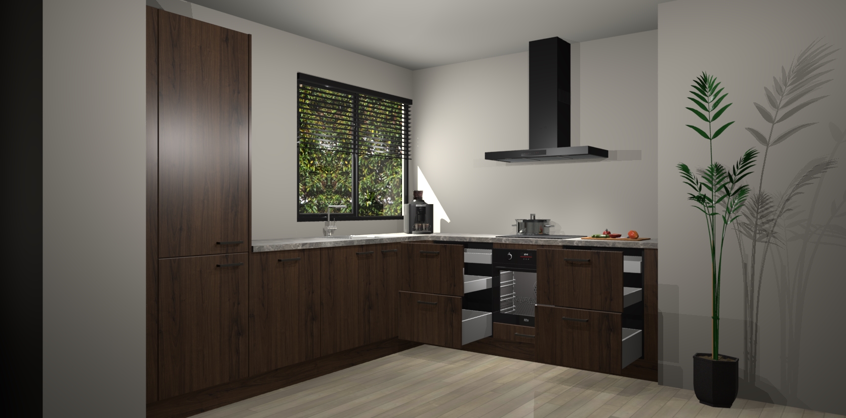 Met een modern, tijdloos design en ruime opslagruimte, zult u zich in no-time thuis voelen in uw nieuwe keuken. Uw leven wordt eenvoudiger met de soft-close deuren die voor het ultieme stille comfort zorgen - geen geluid dat u stoort terwijl u kookt. Ook is de keuken voorzien van 5 ingebouwde apparaten: een oven, inductie kookplaat, afzuigkap, vaatwasser en koelkast. Deze kunnen gemakkelijk na bestelling worden bijgewerkt naar AEG - waardoor uw luxe ervaring compleet is.