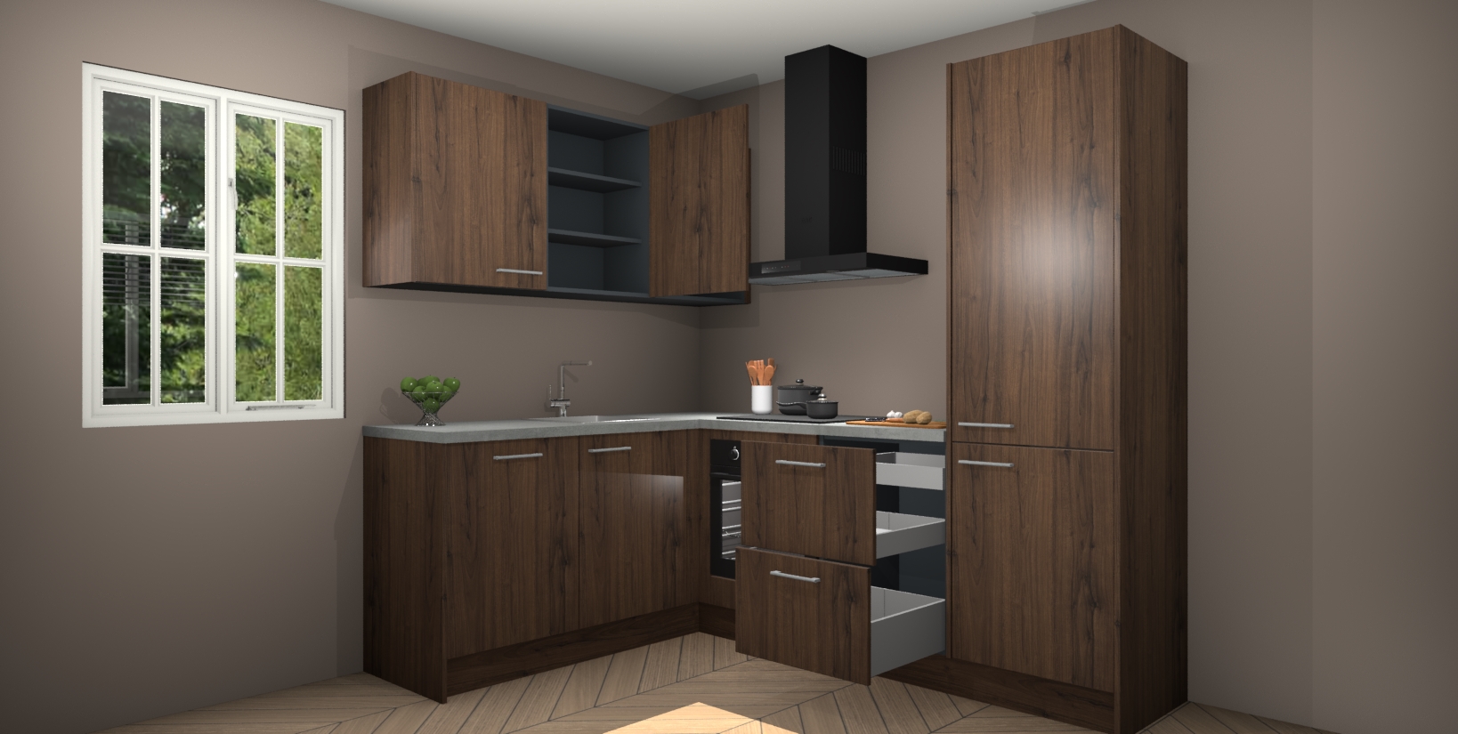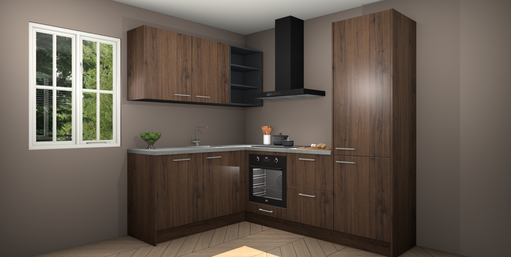 Maak kennis met de Noten keuken Boekarest, een moderne hoekkeuken waar al uw vrienden en familie jaloers op zullen zijn! Het verbluffende mooie ontwerp past in elk interieur en is een ideale keuze voor wie op zoek is naar een klassieke, maar verfijnde look.
