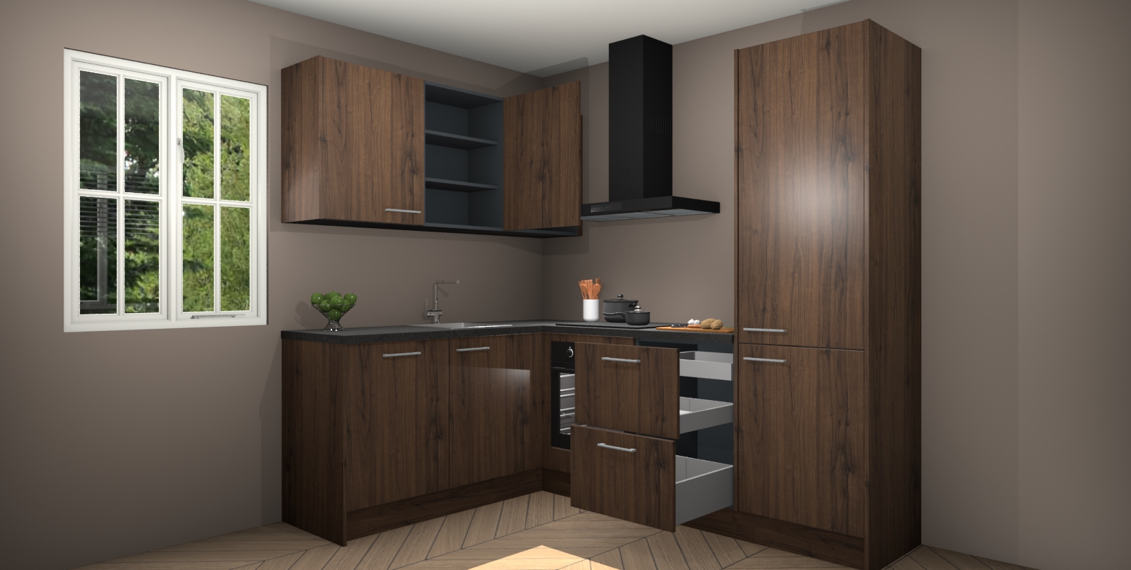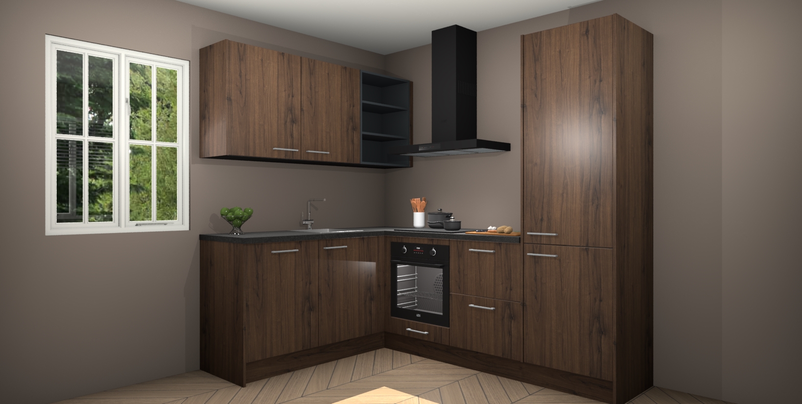 Maak kennis met de Noten keuken Boekarest, een moderne hoekkeuken waar al uw vrienden en familie jaloers op zullen zijn! Het verbluffende mooie ontwerp past in elk interieur en is een ideale keuze voor wie op zoek is naar een klassieke, maar verfijnde look.
