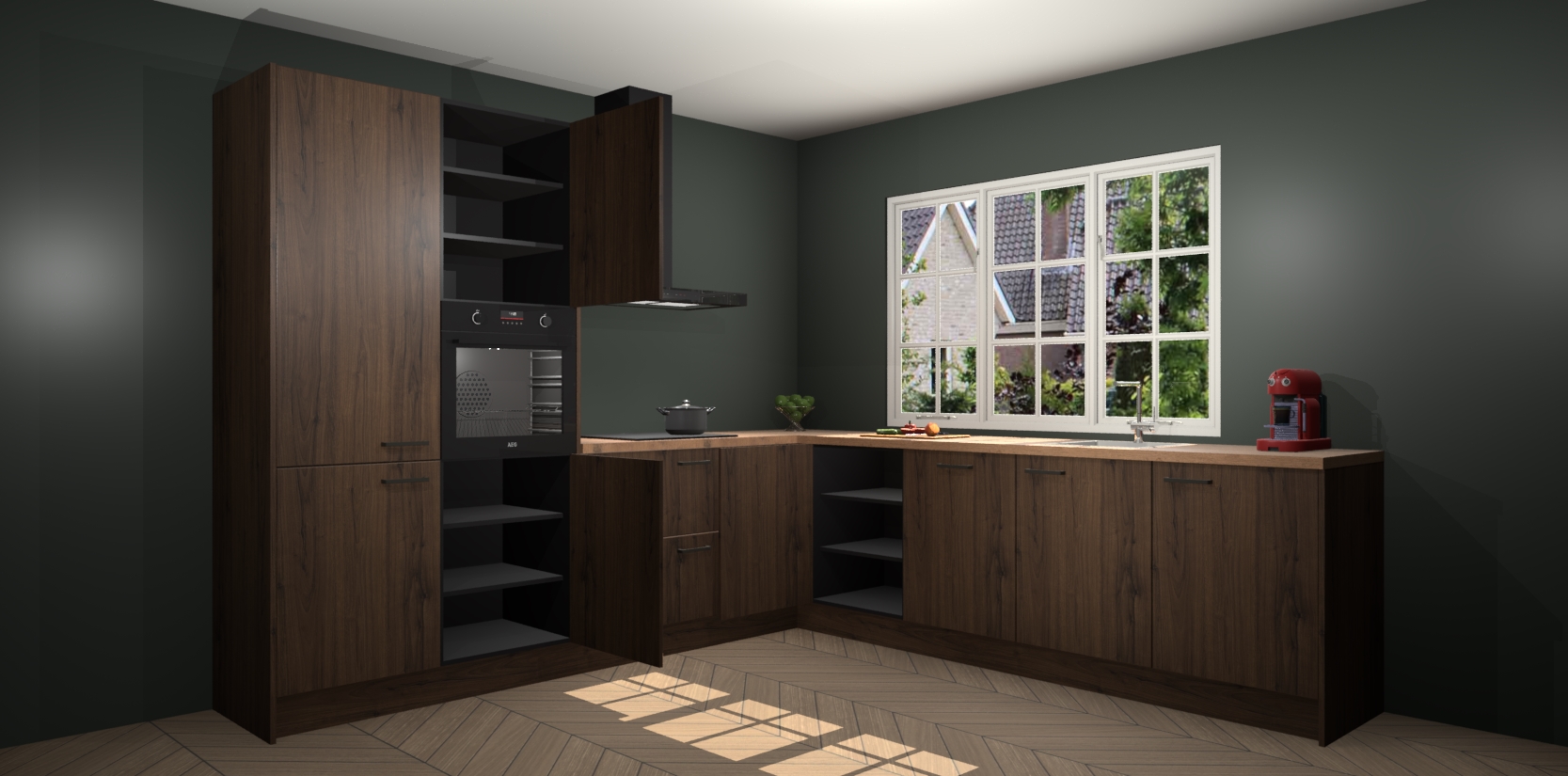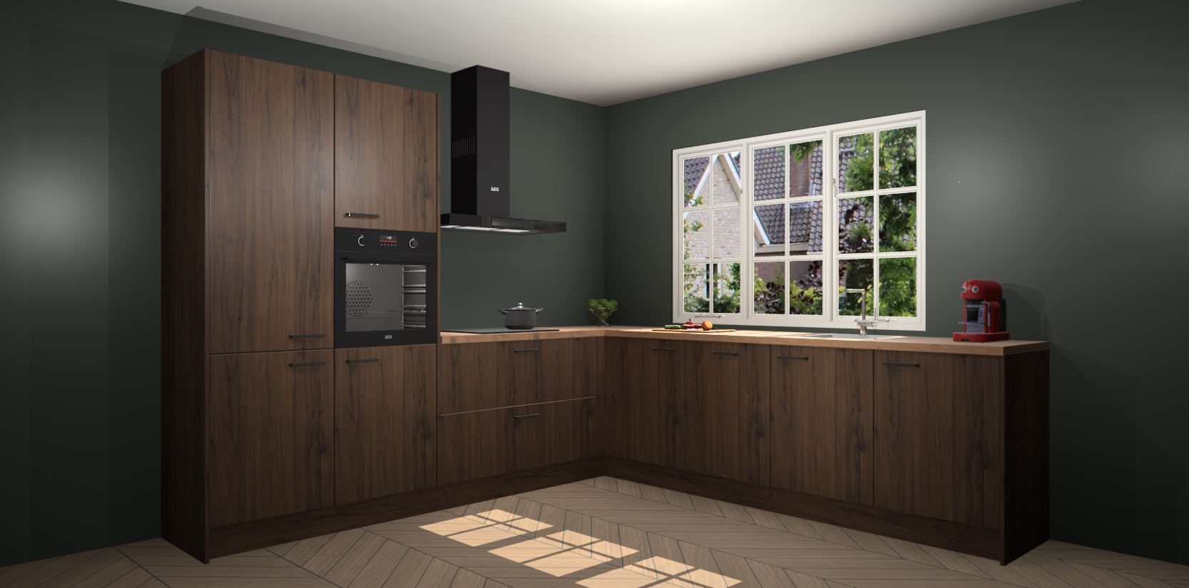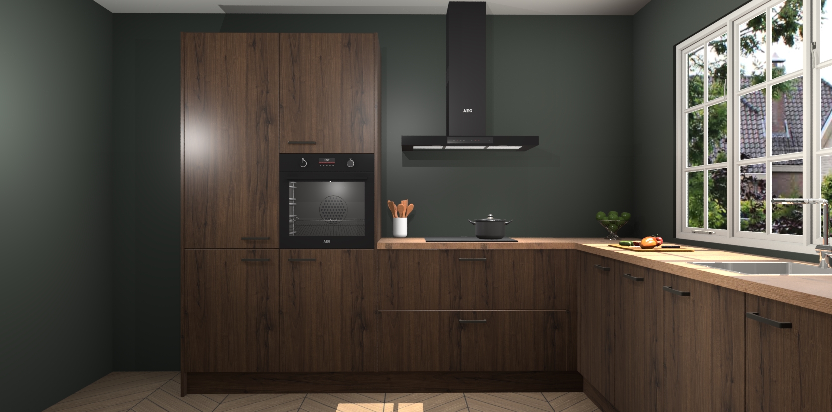 De keuken heeft veel opbergruimte, waardoor u alle ingrediënten gemakkelijk bereikbaar hebt staan. En daarnaast bevat deze volledig uitgeruste keuken ook 5 ingebouwde apparaten: een oven, inductiekookplaat, afzuigkap, vaatwasser en koelkast. Deze zijn heel eenvoudig na bestellen te upgraden naar AEG als u dit wilt. Bovendien zijn de softclose-kastdeuren ideaal; geef ze gewoon even een tikje en ze sluiten automatisch met geruisloze precisie.