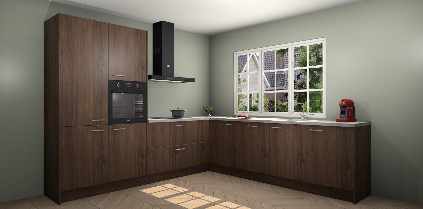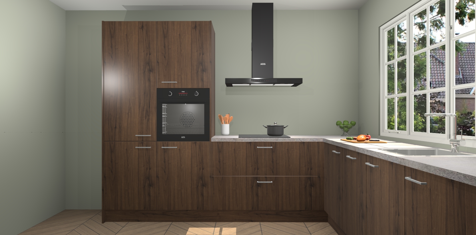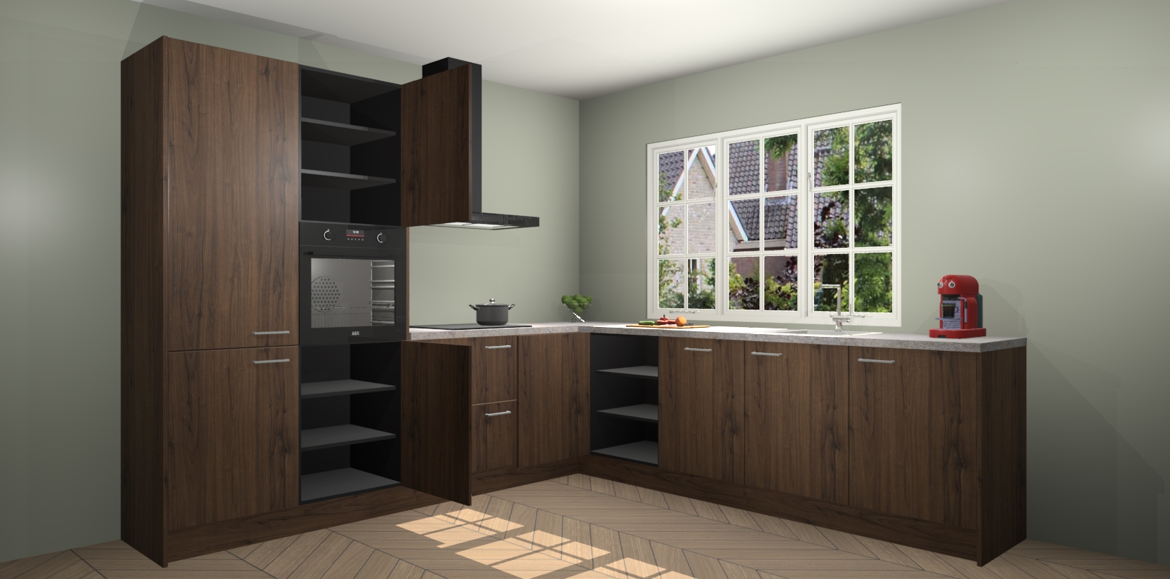 De keuken heeft veel opbergruimte, waardoor u alle ingrediënten gemakkelijk bereikbaar hebt staan. En daarnaast bevat deze volledig uitgeruste keuken ook 5 ingebouwde apparaten: een oven, inductiekookplaat, afzuigkap, vaatwasser en koelkast. Deze zijn heel eenvoudig na bestellen te upgraden naar AEG als u dit wilt. Bovendien zijn de softclose-kastdeuren ideaal; geef ze gewoon even een tikje en ze sluiten automatisch met geruisloze precisie.