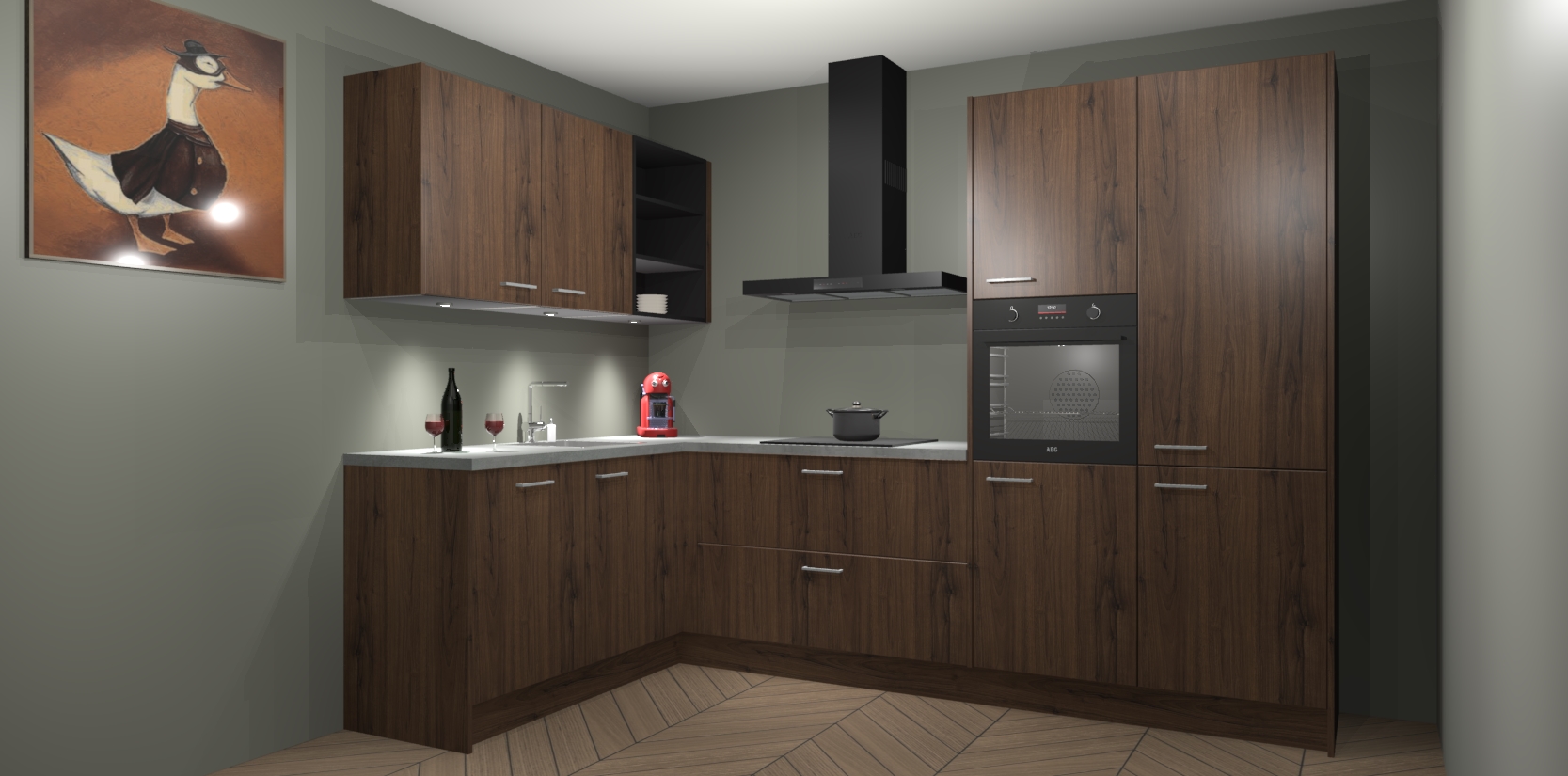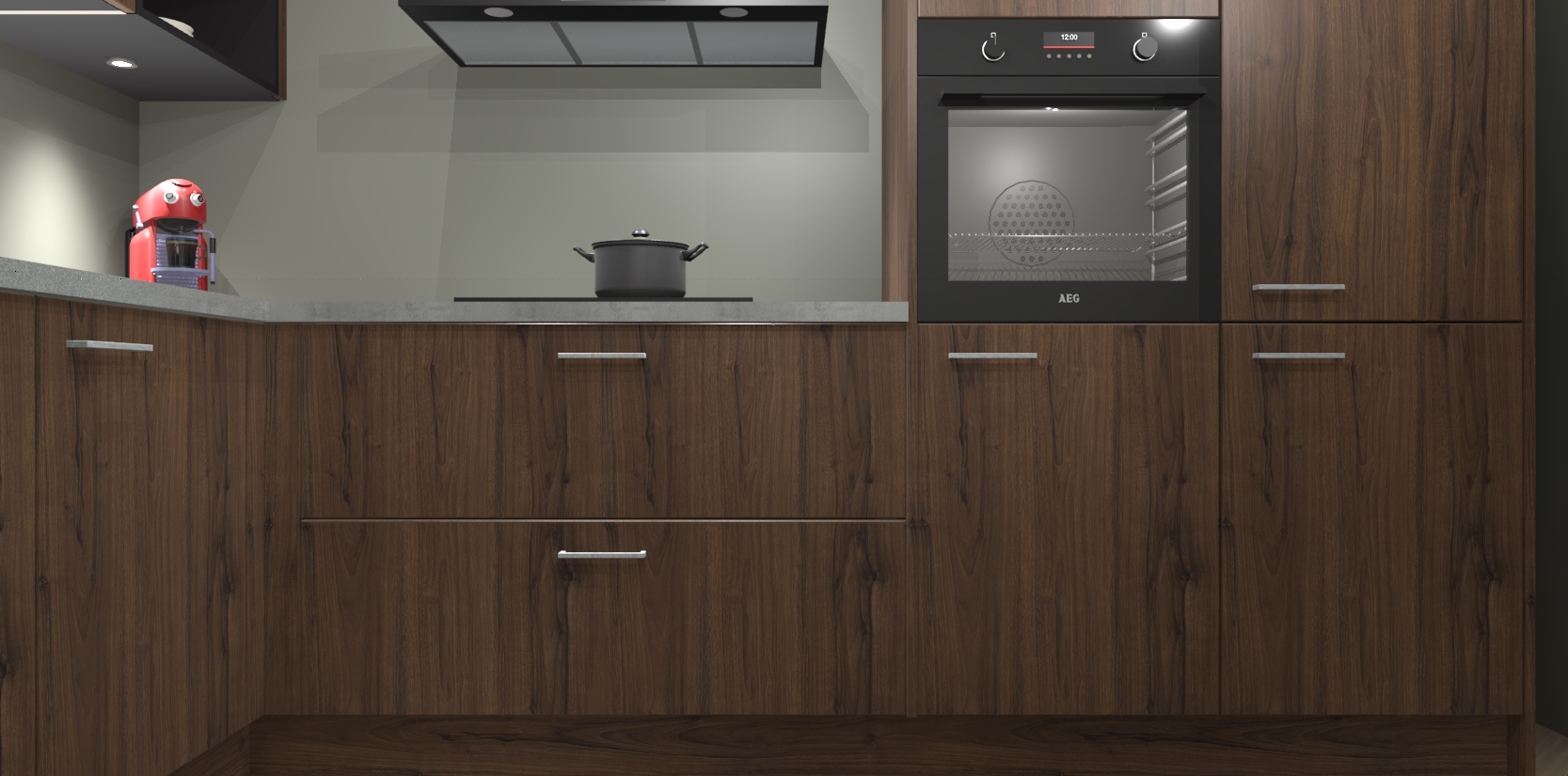 De Noten keuken Cognac is een adembenemend ontwerp met een modern en tijdloos uiterlijk. Deze luxe keuken straalt echt aristocratisch uit, waardoor uw koken plezieriger zal worden! Het prachtige design begint bij de hoekkeuken, wat perfect past bij elk type interieur. Bovendien bevat deze hoogwaardige set vijf inbouwapparaten - van oven tot koelkast - die via bestelling naar AEG geüpgraded kunnen worden!