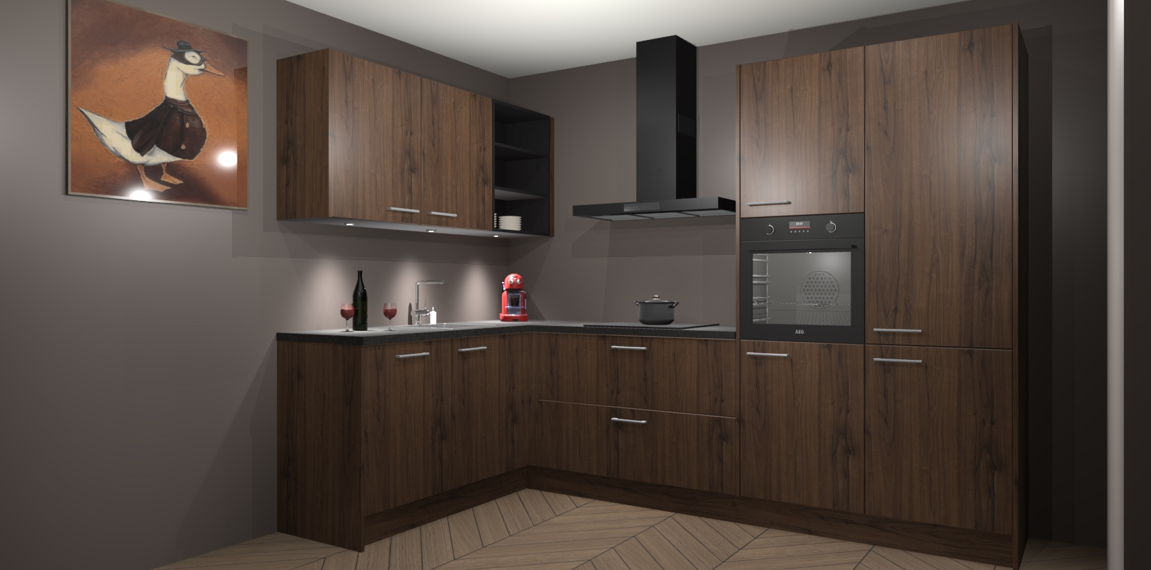 De Noten keuken Cognac is een adembenemend ontwerp met een modern en tijdloos uiterlijk. Deze luxe keuken straalt echt aristocratisch uit, waardoor uw koken plezieriger zal worden! Het prachtige design begint bij de hoekkeuken, wat perfect past bij elk type interieur. Bovendien bevat deze hoogwaardige set vijf inbouwapparaten - van oven tot koelkast - die via bestelling naar AEG geüpgraded kunnen worden!