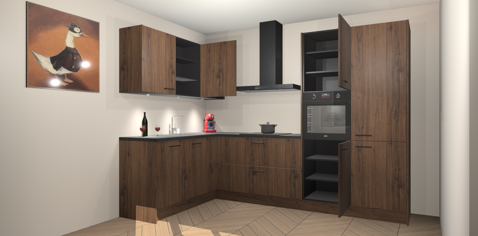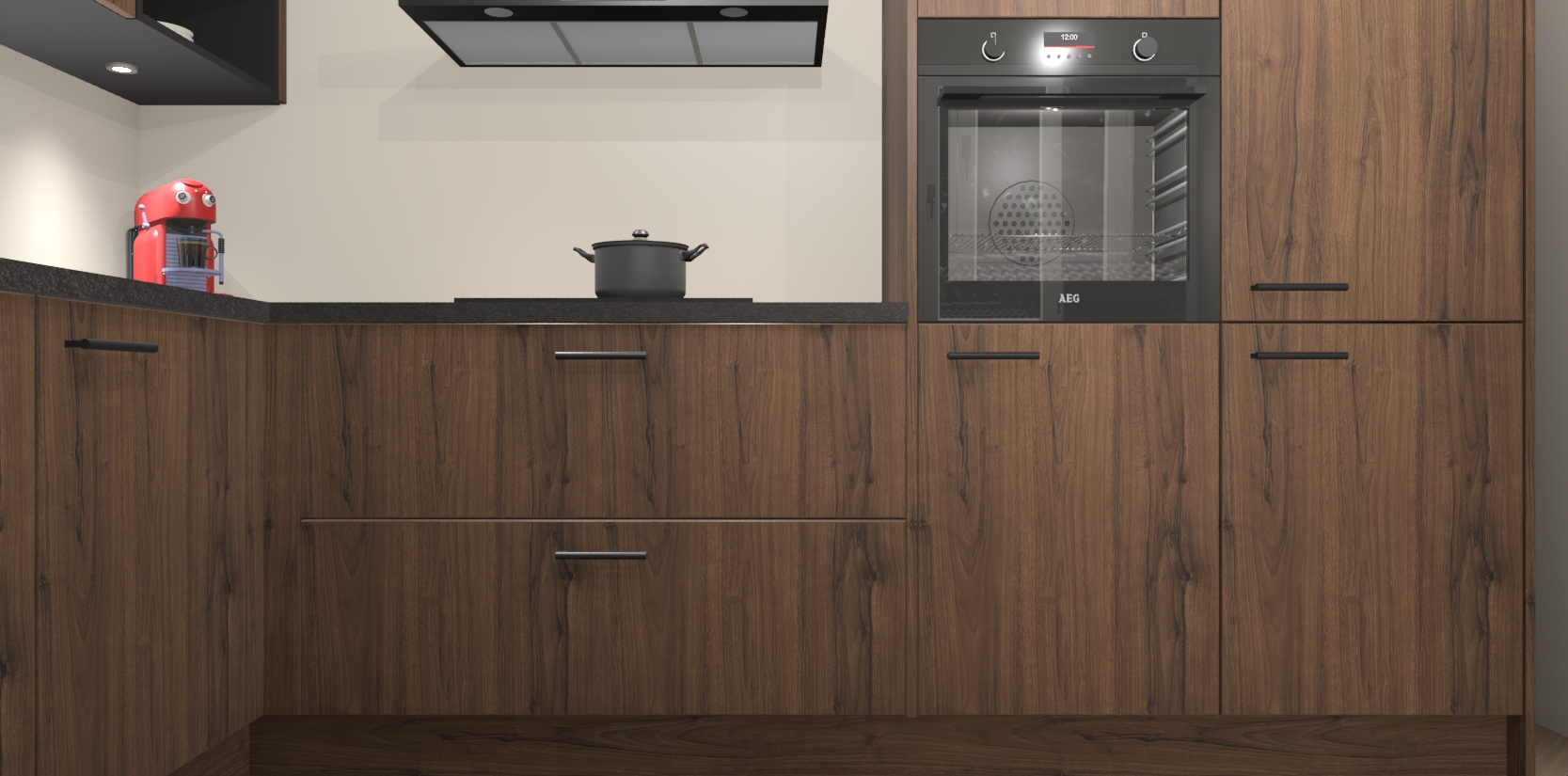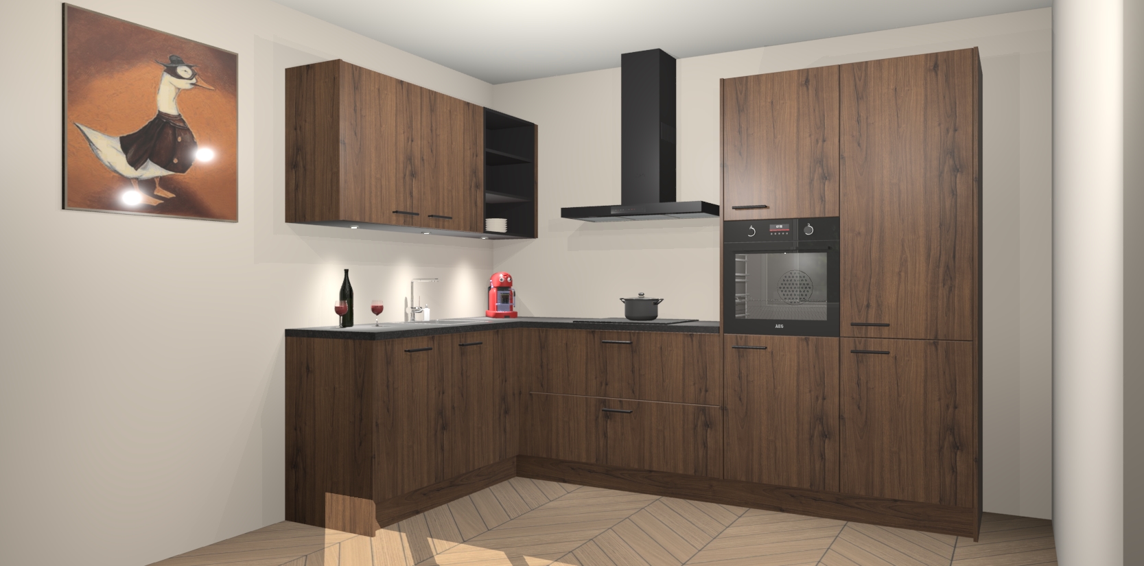 De Noten keuken Cognac is een adembenemend ontwerp met een modern en tijdloos uiterlijk. Deze luxe keuken straalt echt aristocratisch uit, waardoor uw koken plezieriger zal worden! Het prachtige design begint bij de hoekkeuken, wat perfect past bij elk type interieur. Bovendien bevat deze hoogwaardige set vijf inbouwapparaten - van oven tot koelkast - die via bestelling naar AEG geüpgraded kunnen worden!