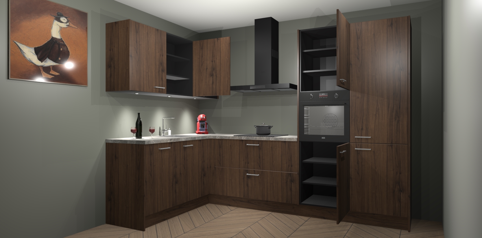De Noten keuken Cognac is een adembenemend ontwerp met een modern en tijdloos uiterlijk. Deze luxe keuken straalt echt aristocratisch uit, waardoor uw koken plezieriger zal worden! Het prachtige design begint bij de hoekkeuken, wat perfect past bij elk type interieur. Bovendien bevat deze hoogwaardige set vijf inbouwapparaten - van oven tot koelkast - die via bestelling naar AEG geüpgraded kunnen worden!