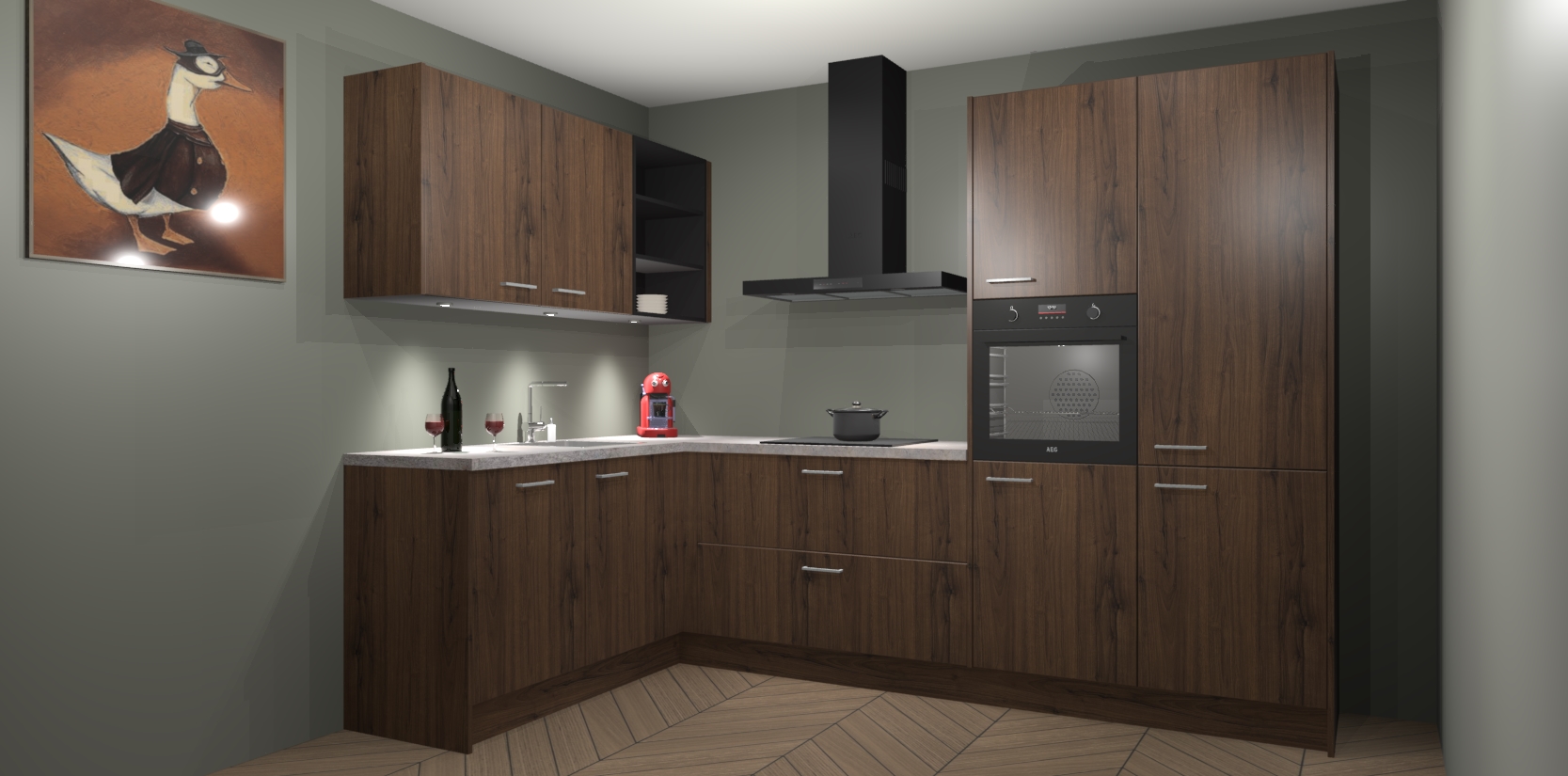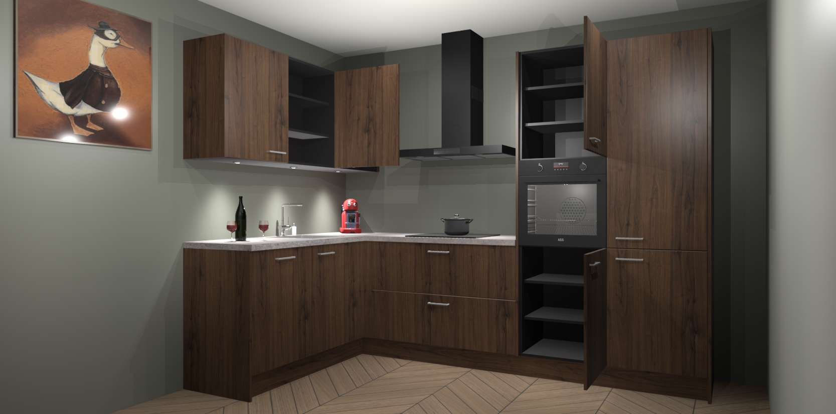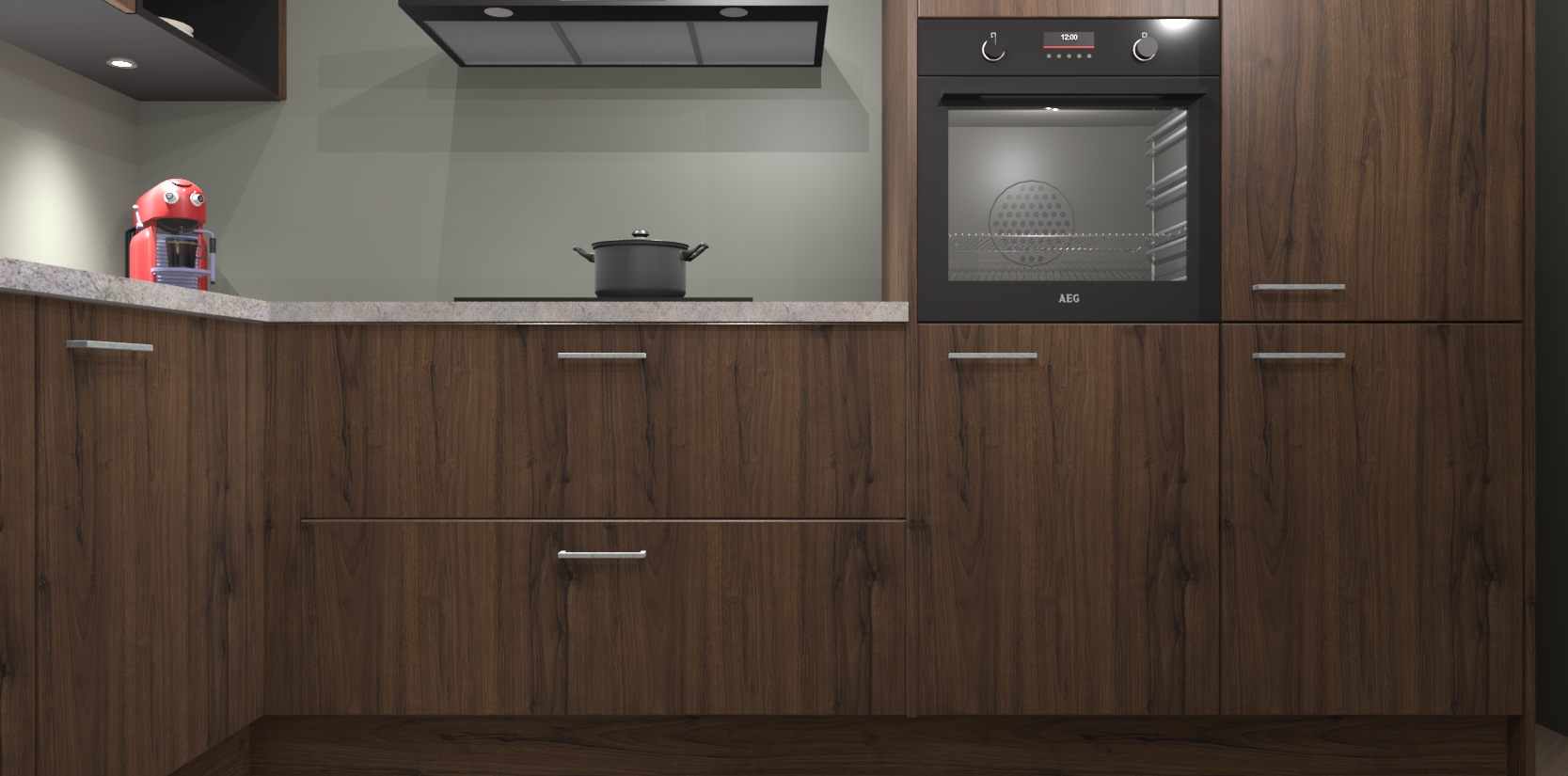 De Noten keuken Cognac is een adembenemend ontwerp met een modern en tijdloos uiterlijk. Deze luxe keuken straalt echt aristocratisch uit, waardoor uw koken plezieriger zal worden! Het prachtige design begint bij de hoekkeuken, wat perfect past bij elk type interieur. Bovendien bevat deze hoogwaardige set vijf inbouwapparaten - van oven tot koelkast - die via bestelling naar AEG geüpgraded kunnen worden!