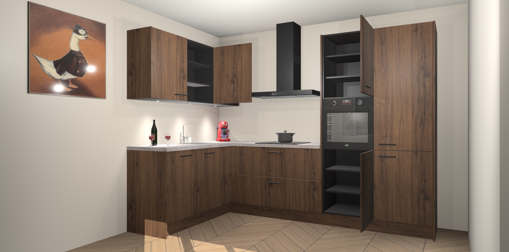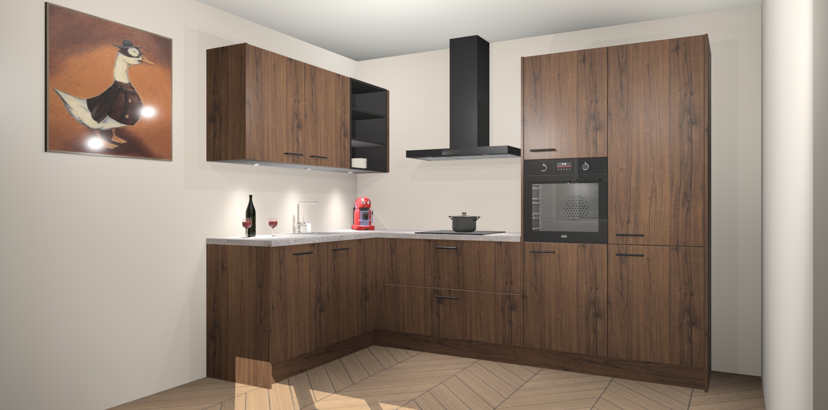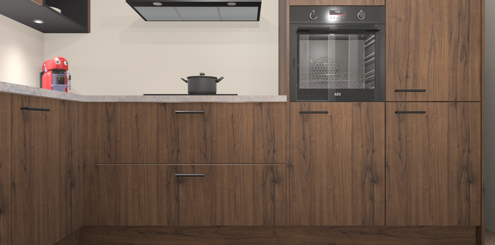 De Noten keuken Cognac is een adembenemend ontwerp met een modern en tijdloos uiterlijk. Deze luxe keuken straalt echt aristocratisch uit, waardoor uw koken plezieriger zal worden! Het prachtige design begint bij de hoekkeuken, wat perfect past bij elk type interieur. Bovendien bevat deze hoogwaardige set vijf inbouwapparaten - van oven tot koelkast - die via bestelling naar AEG geüpgraded kunnen worden!