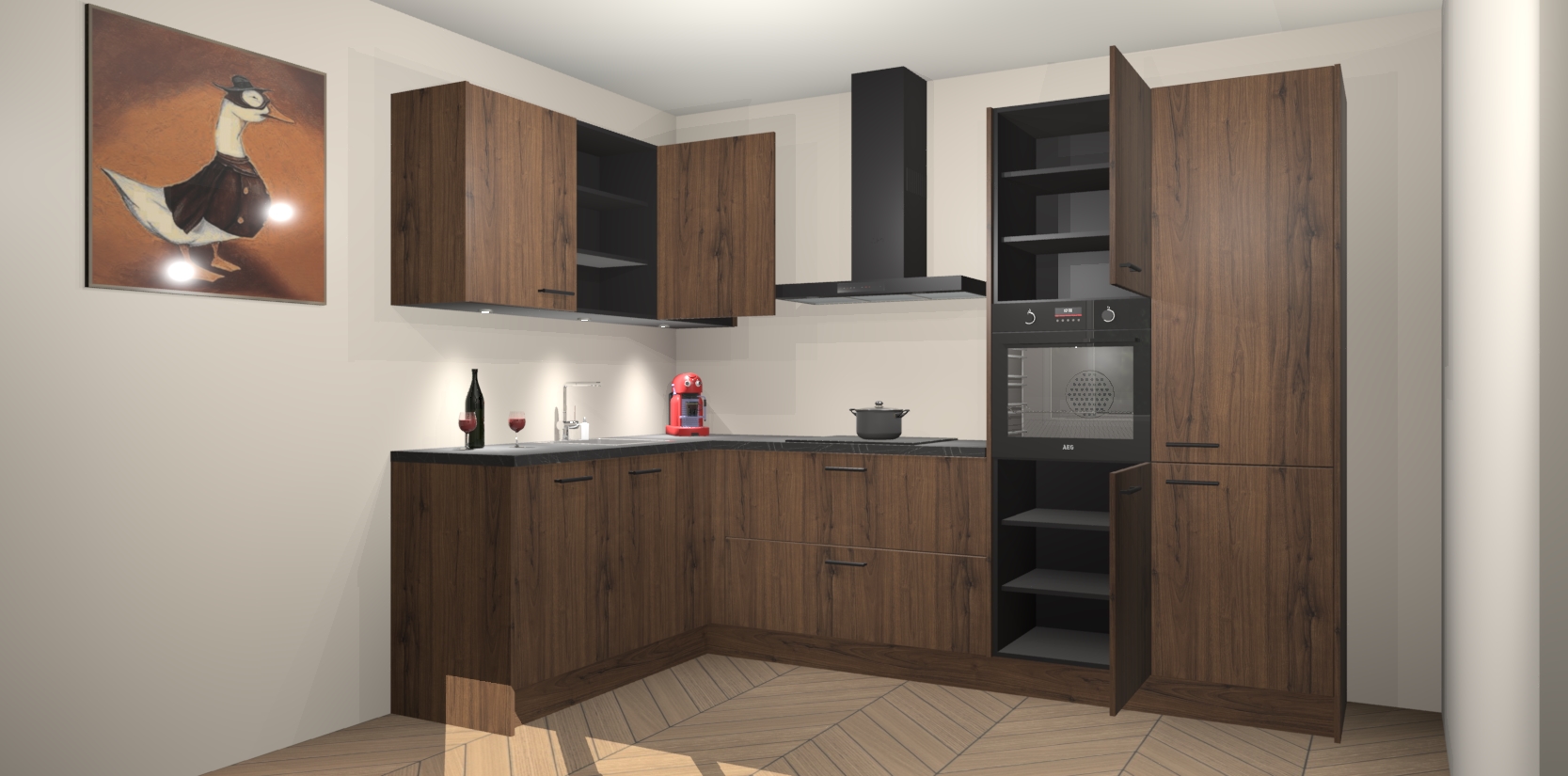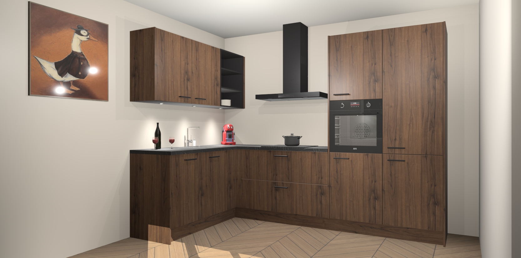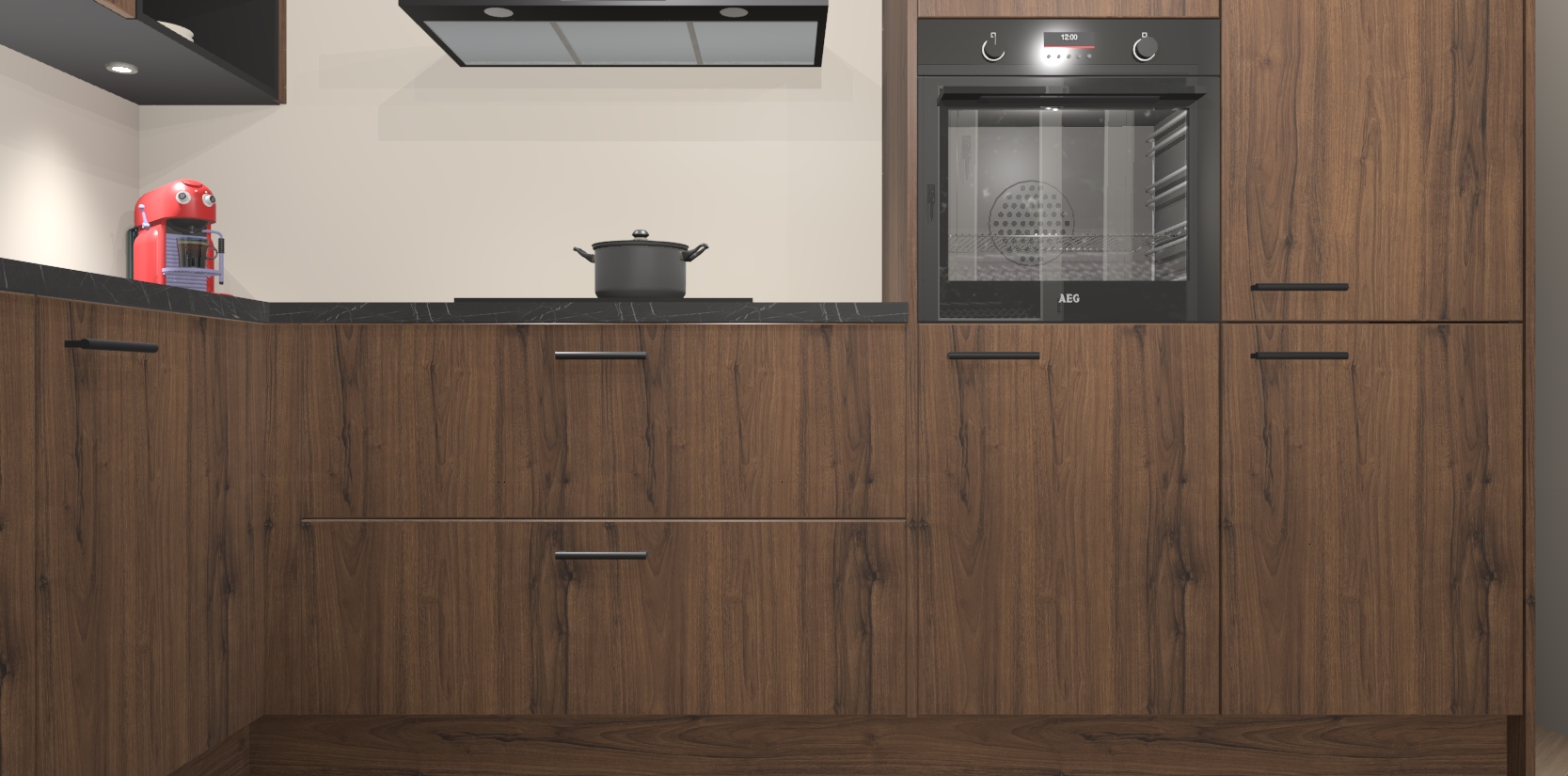 De Noten keuken Cognac is een adembenemend ontwerp met een modern en tijdloos uiterlijk. Deze luxe keuken straalt echt aristocratisch uit, waardoor uw koken plezieriger zal worden! Het prachtige design begint bij de hoekkeuken, wat perfect past bij elk type interieur. Bovendien bevat deze hoogwaardige set vijf inbouwapparaten - van oven tot koelkast - die via bestelling naar AEG geüpgraded kunnen worden!
