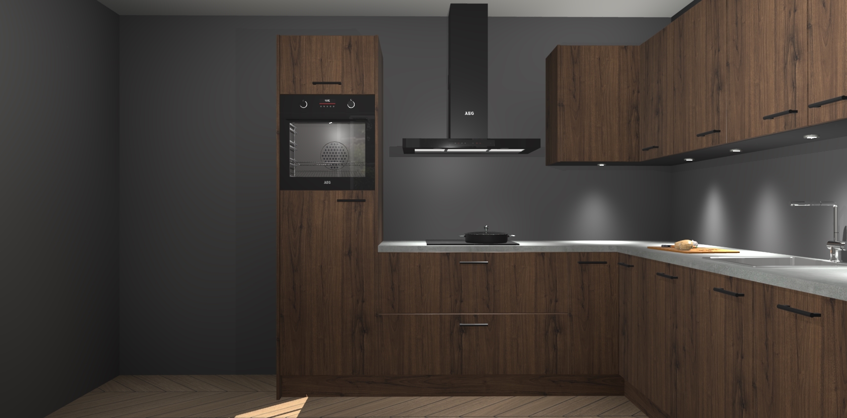 De Noten keuken Debar is uitgerust met vijf inbouwapparaten die elke kooktaak handig en efficiënt maken. Een oven, inductiekookplaat, afzuigkap, vaatwasser en koelkast zijn standaard, maar kunnen na bestelling eenvoudig worden geupgrade naar AEG. Profiteer vervolgens van de softclose deuren voor snelle toegang en geruisloze toegang.