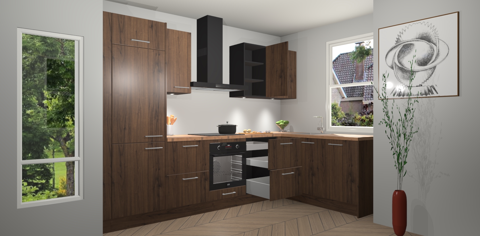 Bent u op zoek naar een moderne en tijdloze keuken die schoonheid in uw huis brengt? Zoek dan niet verder dan de Noten keuken Geneve - de perfecte keuken voor al uw wensen. Deze hoekkeuken biedt de hoogste Duitse kwaliteit voor een vaste lage prijs en is zeker een blikvanger in uw huis!
