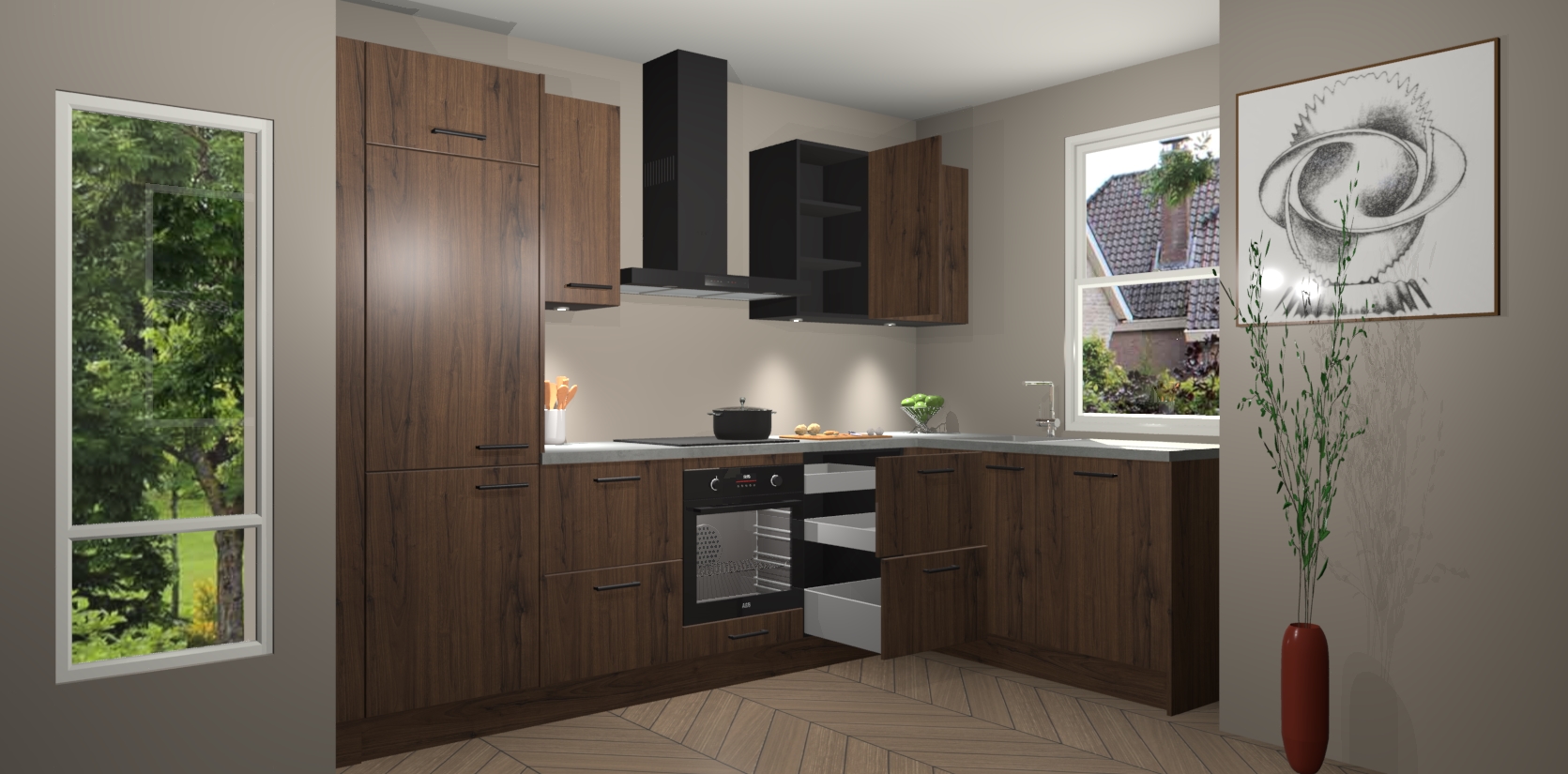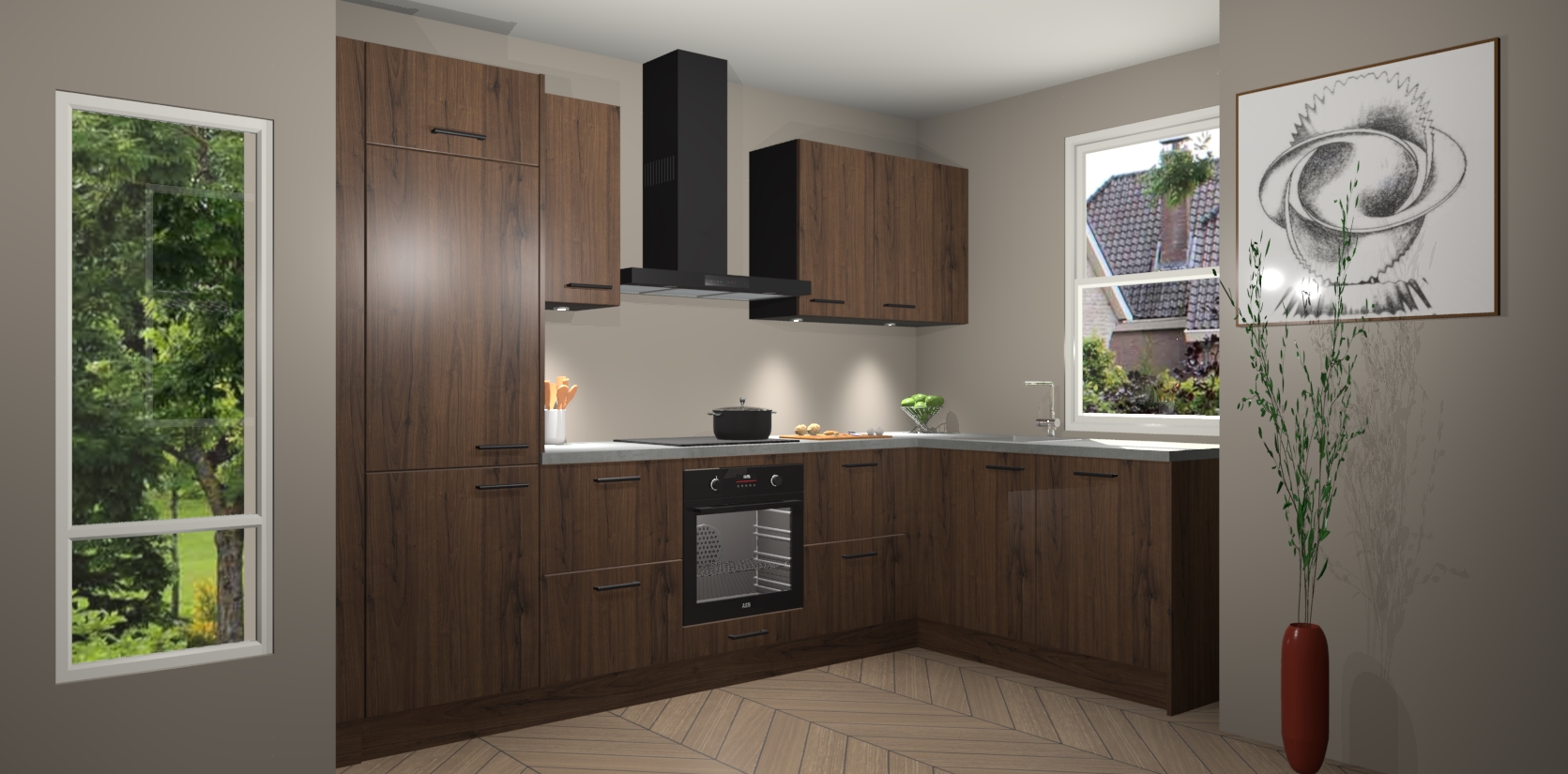 Bent u op zoek naar een moderne en tijdloze keuken die schoonheid in uw huis brengt? Zoek dan niet verder dan de Noten keuken Geneve - de perfecte keuken voor al uw wensen. Deze hoekkeuken biedt de hoogste Duitse kwaliteit voor een vaste lage prijs en is zeker een blikvanger in uw huis!