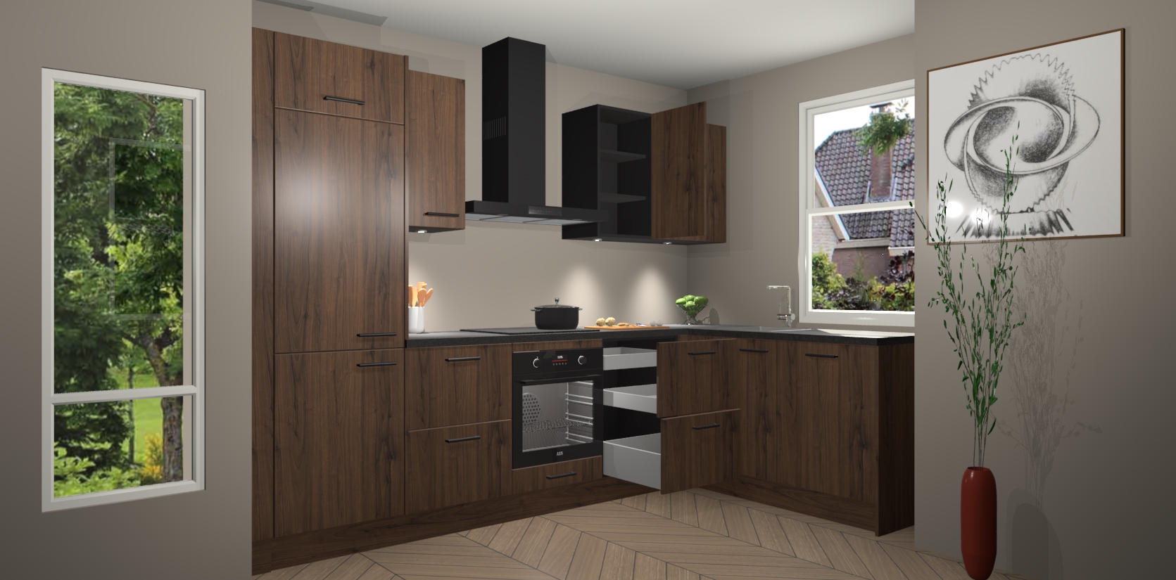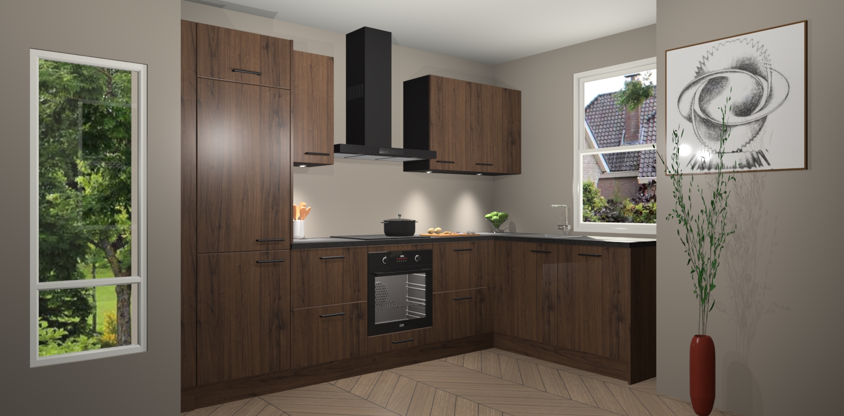 Bent u op zoek naar een moderne en tijdloze keuken die schoonheid in uw huis brengt? Zoek dan niet verder dan de Noten keuken Geneve - de perfecte keuken voor al uw wensen. Deze hoekkeuken biedt de hoogste Duitse kwaliteit voor een vaste lage prijs en is zeker een blikvanger in uw huis!
