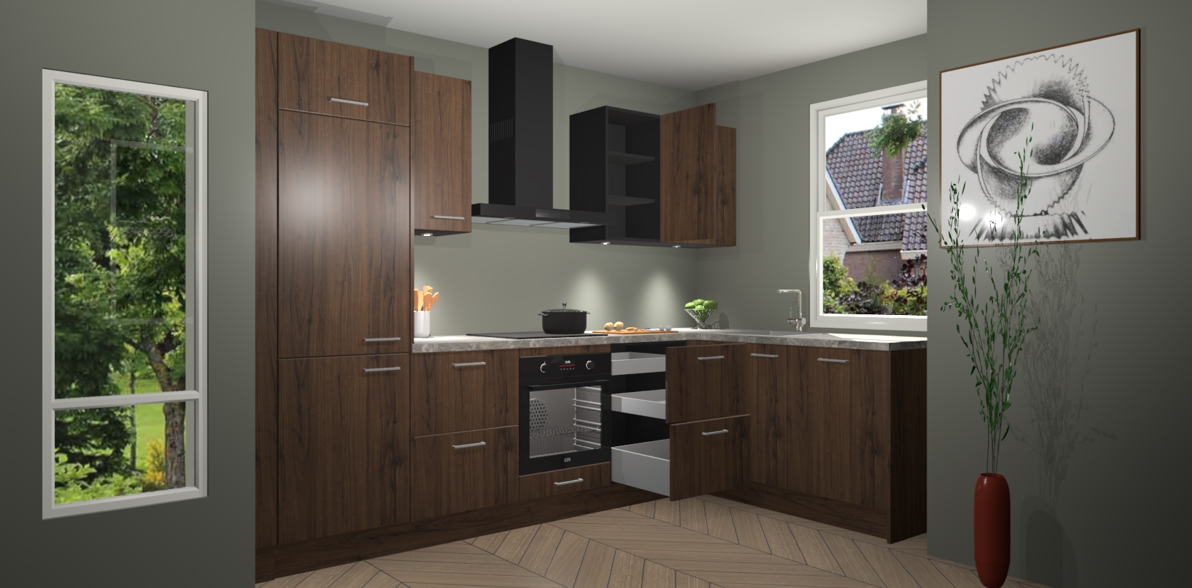 De Noten keuken Geneve is uitgerust met 5 inbouwapparaten - een oven, inductiekookplaat, afzuigkap, vaatwasser en koelkast - voor al uw kook- en bewaarbehoeftes. U kunt deze apparaten desgewenst eenvoudig upgraden naar AEG of de oven omruilen voor een combimagnetron na het plaatsen van uw bestelling. En met de soft close deuren, voldoende opbergruimte en kasten die voorgemonteerd worden geleverd, bent u in een mum van tijd klaar om heerlijke maaltijden te bereiden!