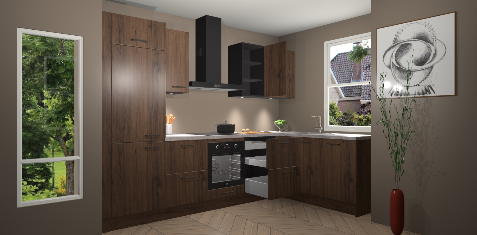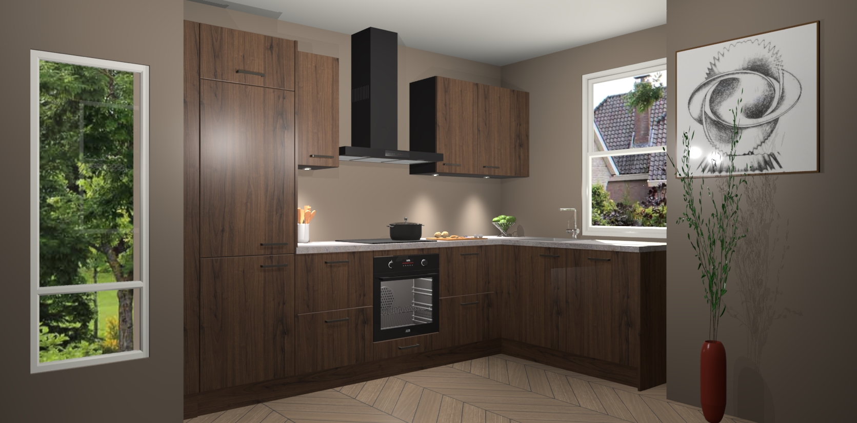 Bent u op zoek naar een moderne en tijdloze keuken die schoonheid in uw huis brengt? Zoek dan niet verder dan de Noten keuken Geneve - de perfecte keuken voor al uw wensen. Deze hoekkeuken biedt de hoogste Duitse kwaliteit voor een vaste lage prijs en is zeker een blikvanger in uw huis!