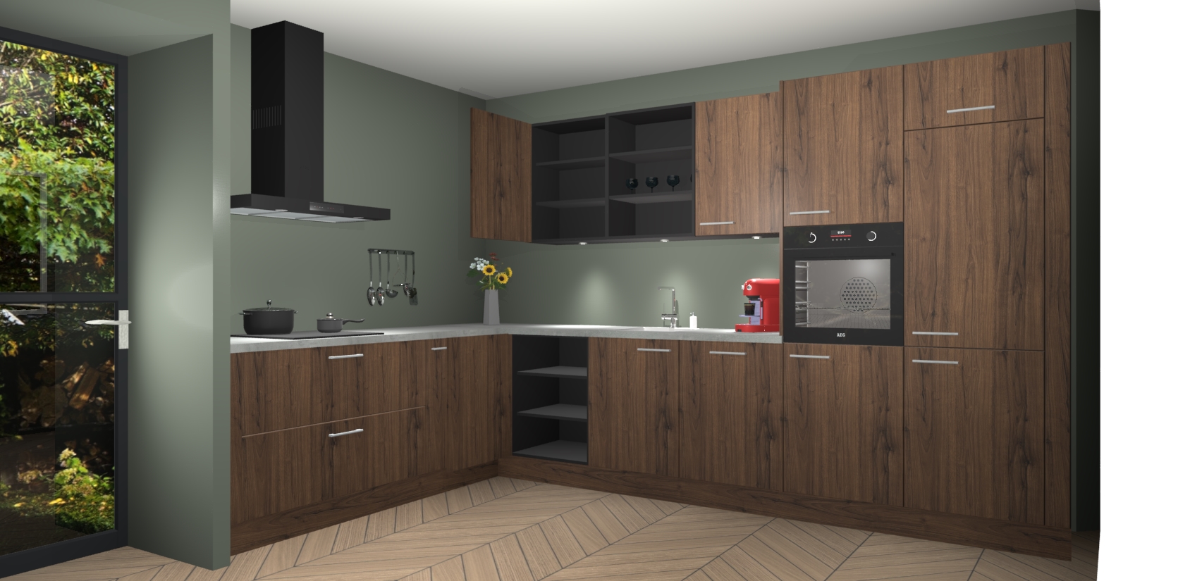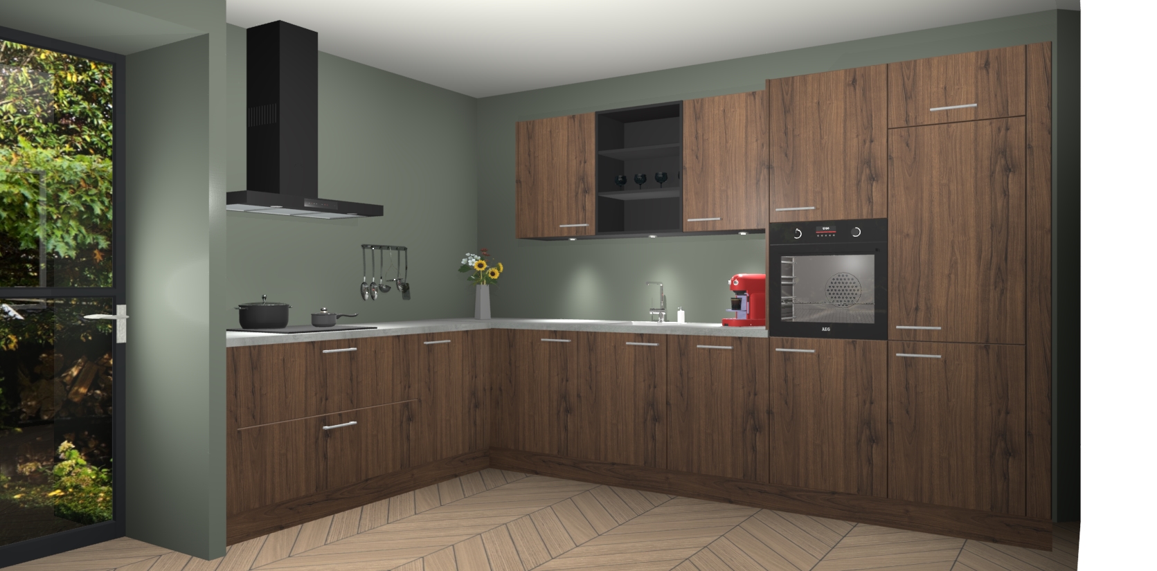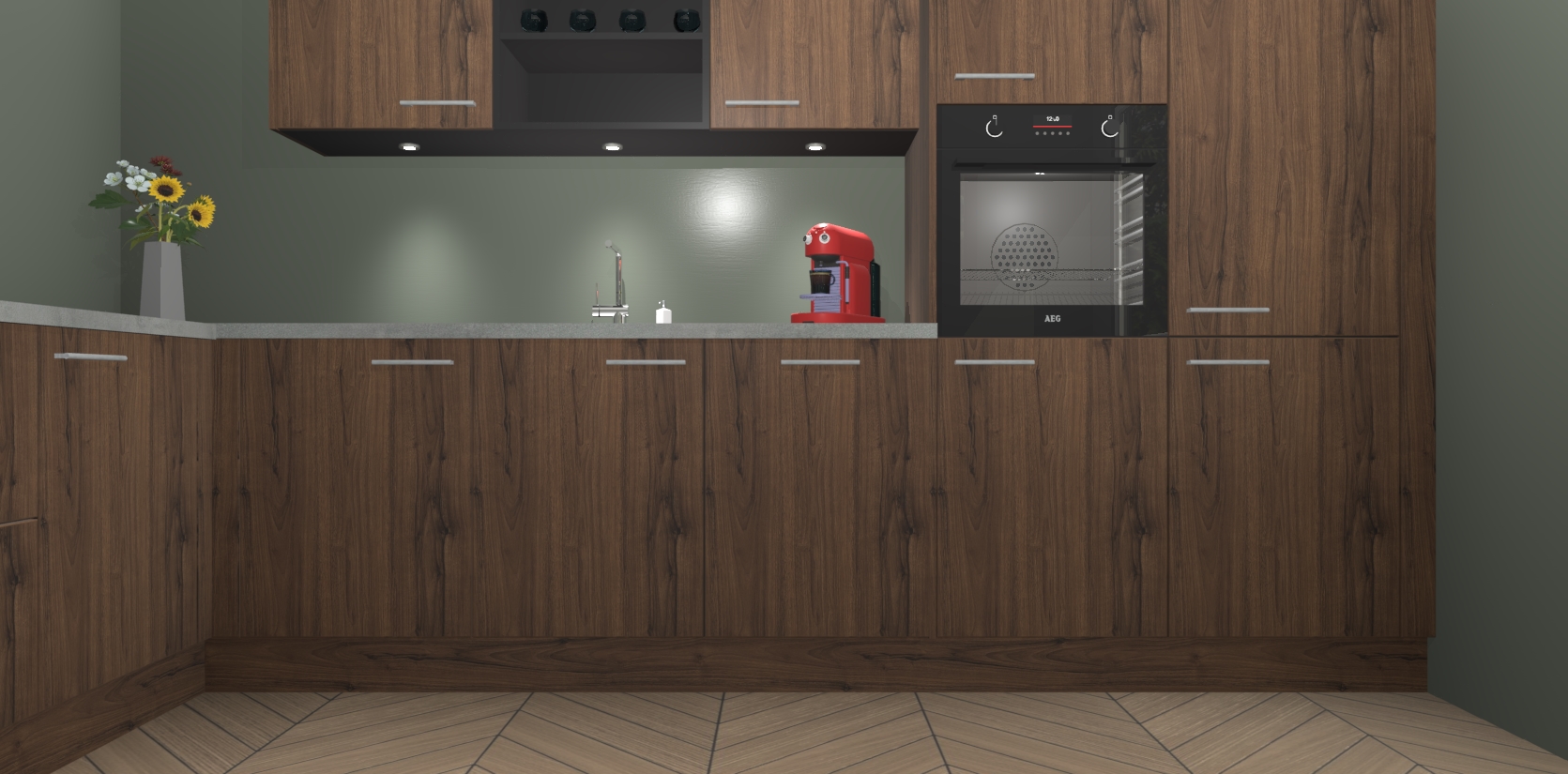 De Noten keuken Gotenburg is zo ontworpen dat u alle mogelijke vormen van opslagruimte kunt genieten. Bovendien heeft u meteen toegang tot vijf ingebouwde apparaten: een oven, inductiekookplaat, afzuigkap, vaatwasser en koelkast. Gewoon upgraden naar AEG na bestelling? Dit kan heel gemakkelijk worden geregeld. De deuren sluiten zacht dankzij zachtsluitende scharnieren en ze houden warmte vast terwijl ze uitzonderlijk stil blijven wanneer ze worden geopend of gesloten.