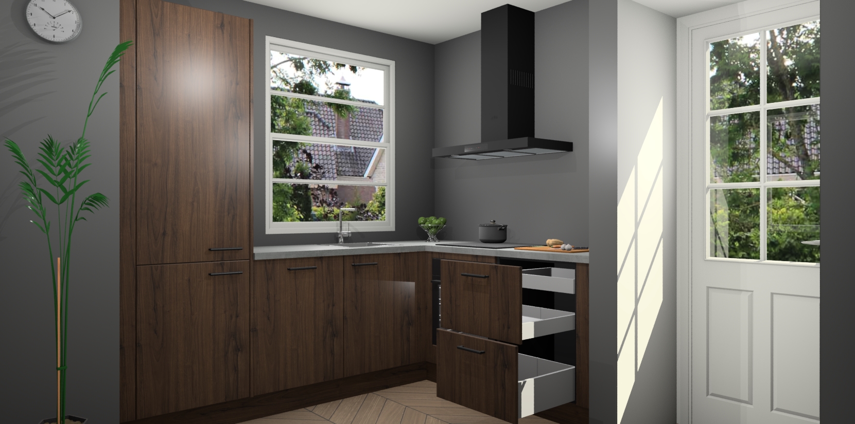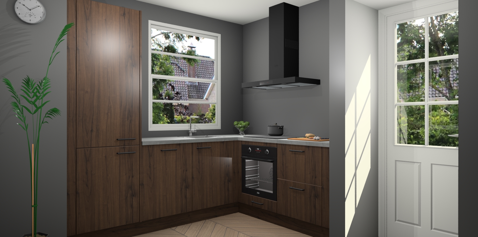 Wilt u een echte aanwinst voor uw keuken, maar bent u op zoek naar iets specialers dan de standaardkeukens? Kies dan voor de Noten keuken Harbin! Dit prachtige hoekkeukenontwerp geeft u alle ruimte om optimaal te genieten van heerlijk koken. Het uitmuntende afwerkingsniveau, de fraaie houtstructuur en de sfeervolle zwarte grepen maken van de Noten keuken Harbin de perfecte keuze voor zowel enthousiaste thuiskoks als design-minded interieurliefhebbers.