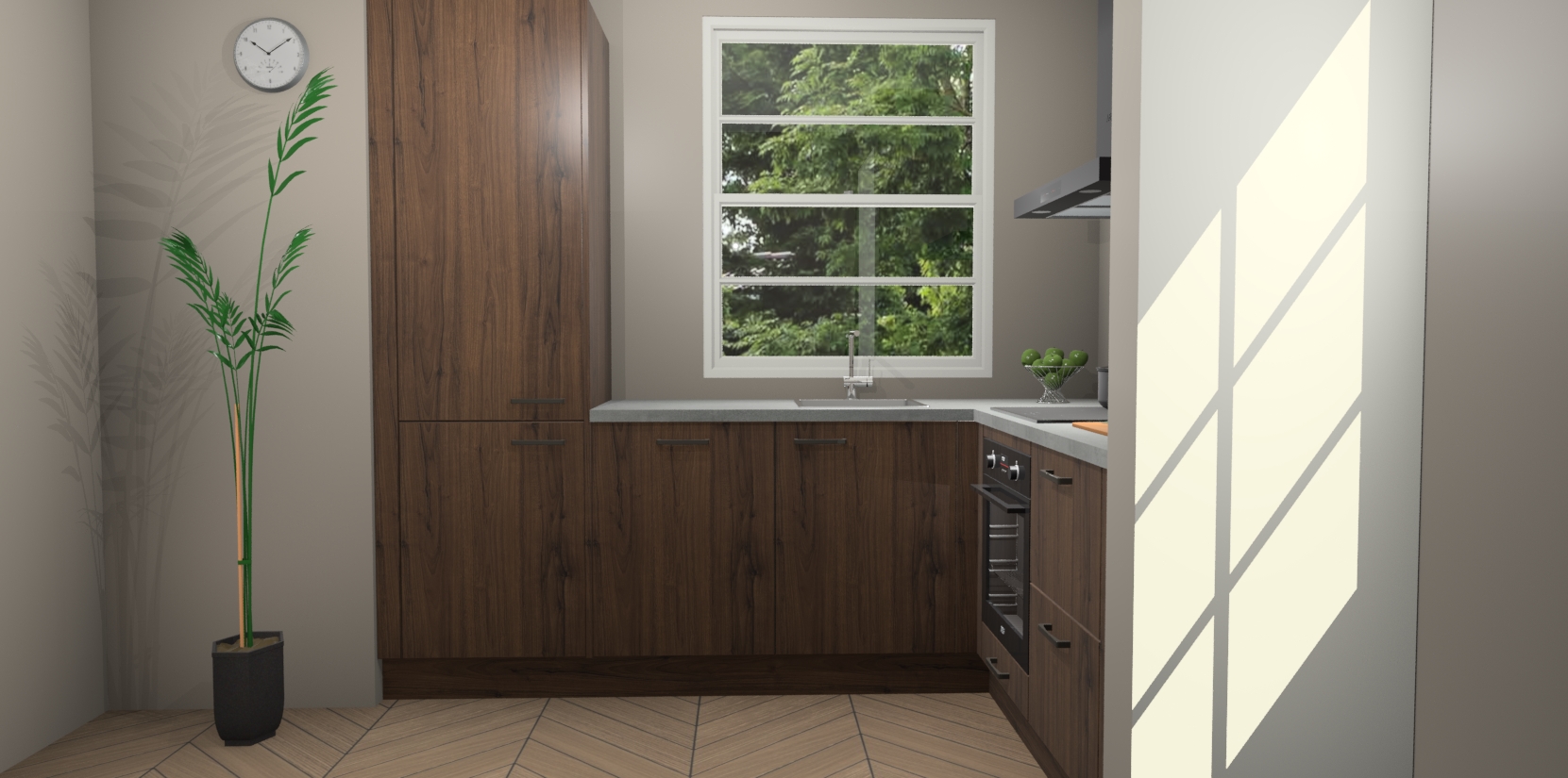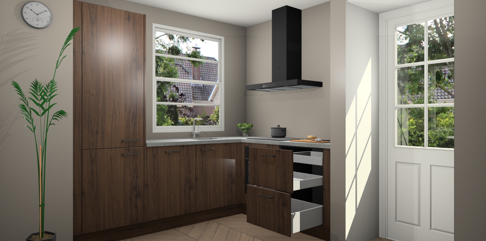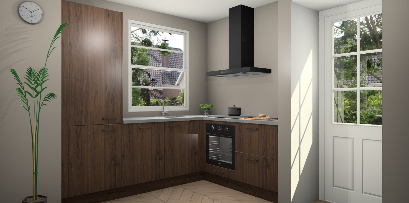 Wilt u een echte aanwinst voor uw keuken, maar bent u op zoek naar iets specialers dan de standaardkeukens? Kies dan voor de Noten keuken Harbin! Dit prachtige hoekkeukenontwerp geeft u alle ruimte om optimaal te genieten van heerlijk koken. Het uitmuntende afwerkingsniveau, de fraaie houtstructuur en de sfeervolle zwarte grepen maken van de Noten keuken Harbin de perfecte keuze voor zowel enthousiaste thuiskoks als design-minded interieurliefhebbers.