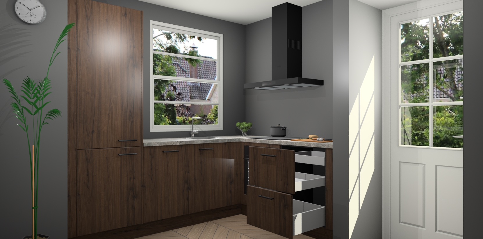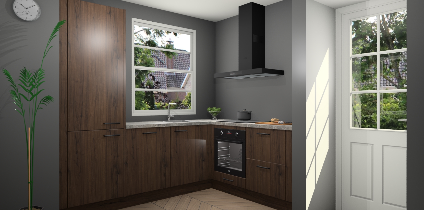 Wilt u een echte aanwinst voor uw keuken, maar bent u op zoek naar iets specialers dan de standaardkeukens? Kies dan voor de Noten keuken Harbin! Dit prachtige hoekkeukenontwerp geeft u alle ruimte om optimaal te genieten van heerlijk koken. Het uitmuntende afwerkingsniveau, de fraaie houtstructuur en de sfeervolle zwarte grepen maken van de Noten keuken Harbin de perfecte keuze voor zowel enthousiaste thuiskoks als design-minded interieurliefhebbers.