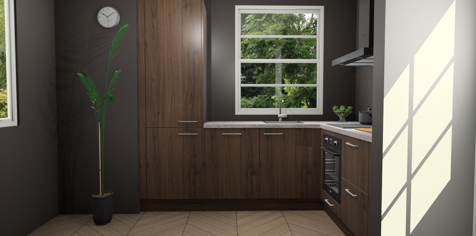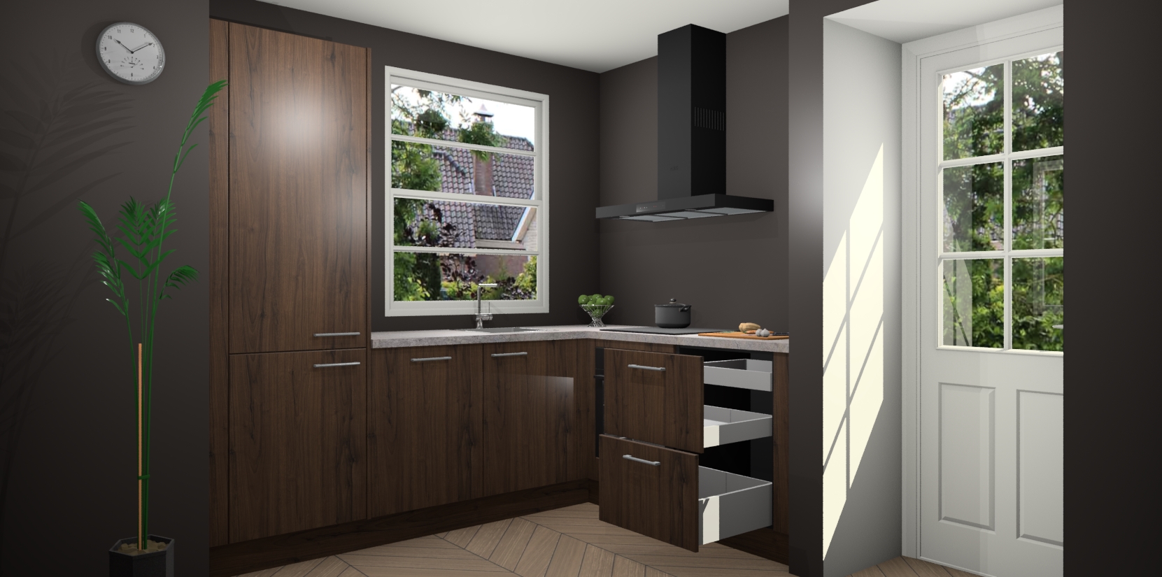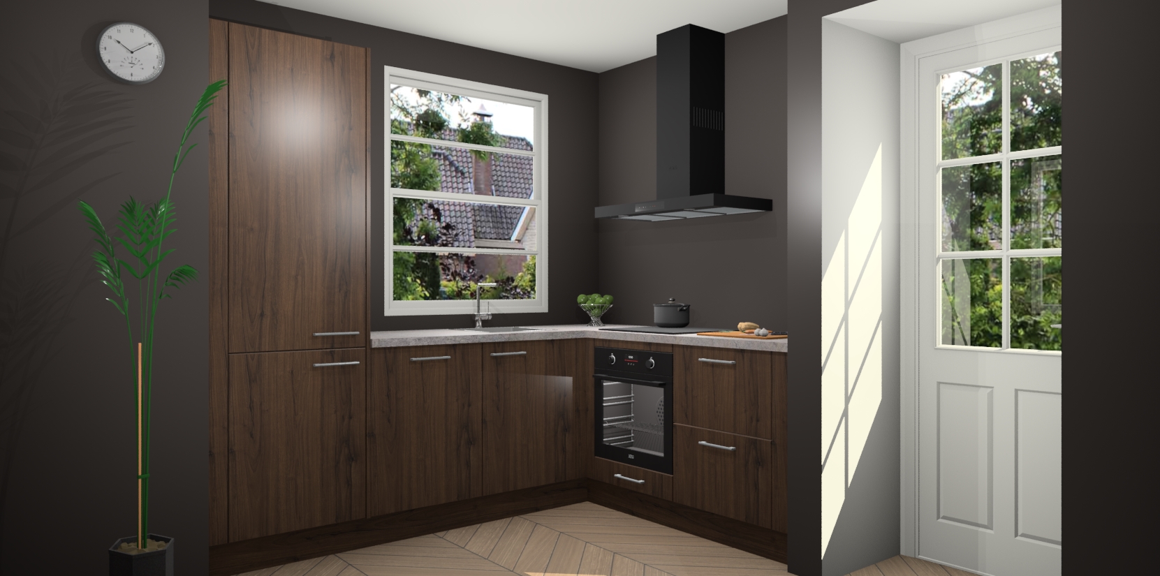Wilt u een echte aanwinst voor uw keuken, maar bent u op zoek naar iets specialers dan de standaardkeukens? Kies dan voor de Noten keuken Harbin! Dit prachtige hoekkeukenontwerp geeft u alle ruimte om optimaal te genieten van heerlijk koken. Het uitmuntende afwerkingsniveau, de fraaie houtstructuur en de sfeervolle zwarte grepen maken van de Noten keuken Harbin de perfecte keuze voor zowel enthousiaste thuiskoks als design-minded interieurliefhebbers.