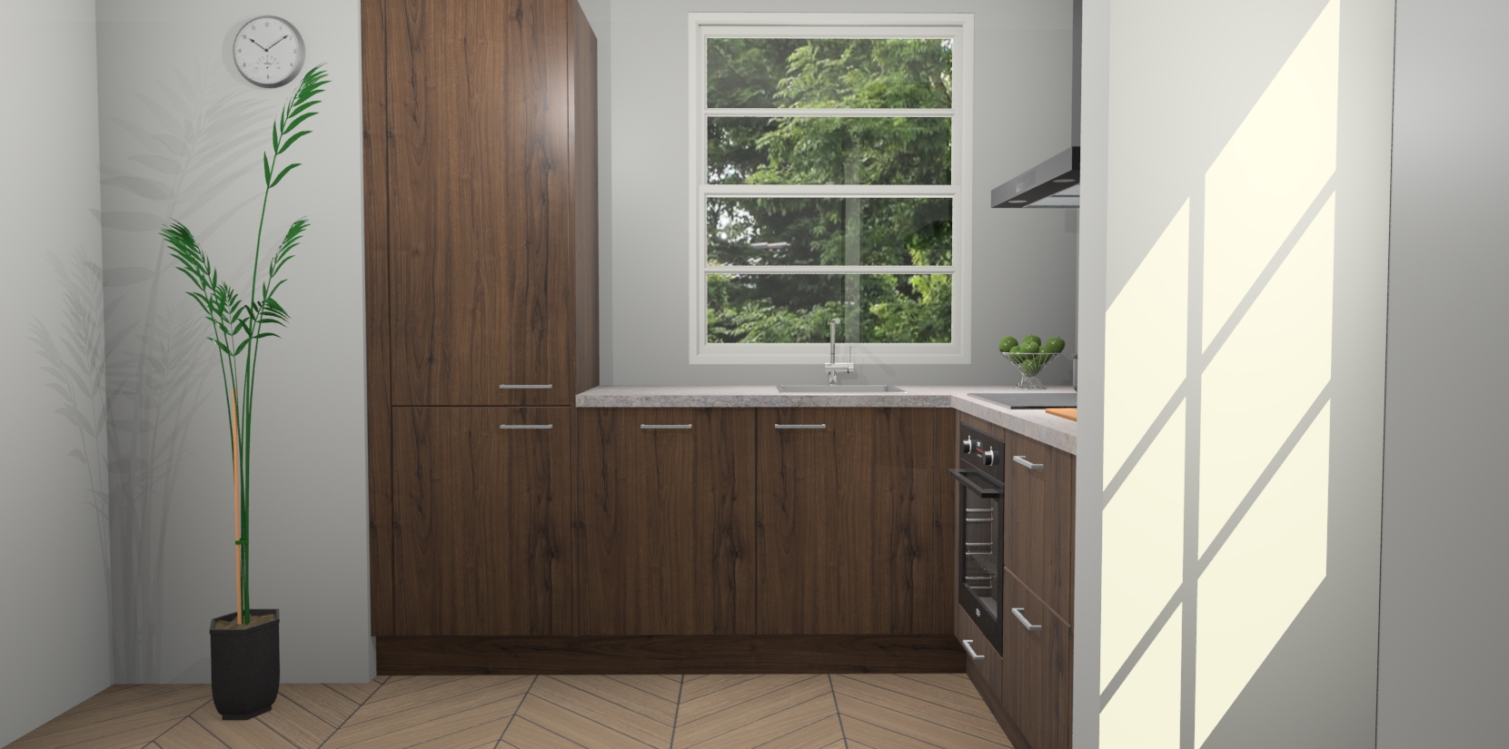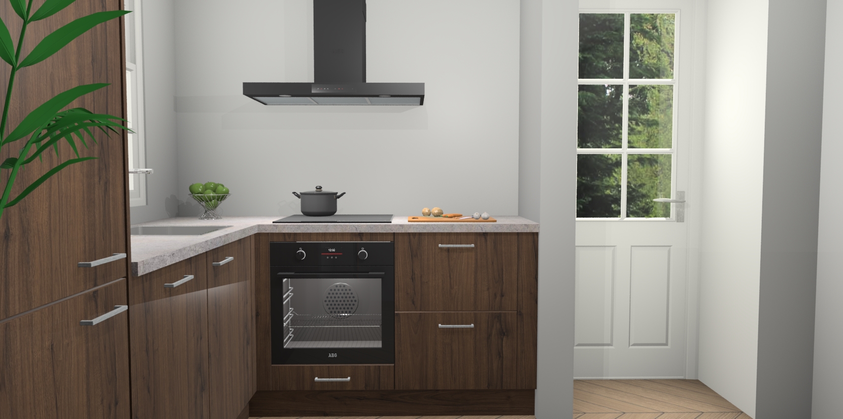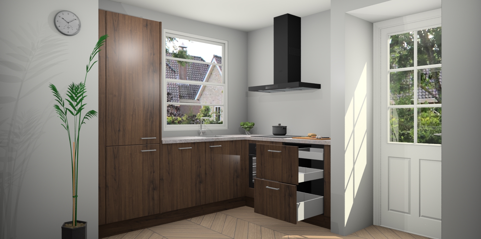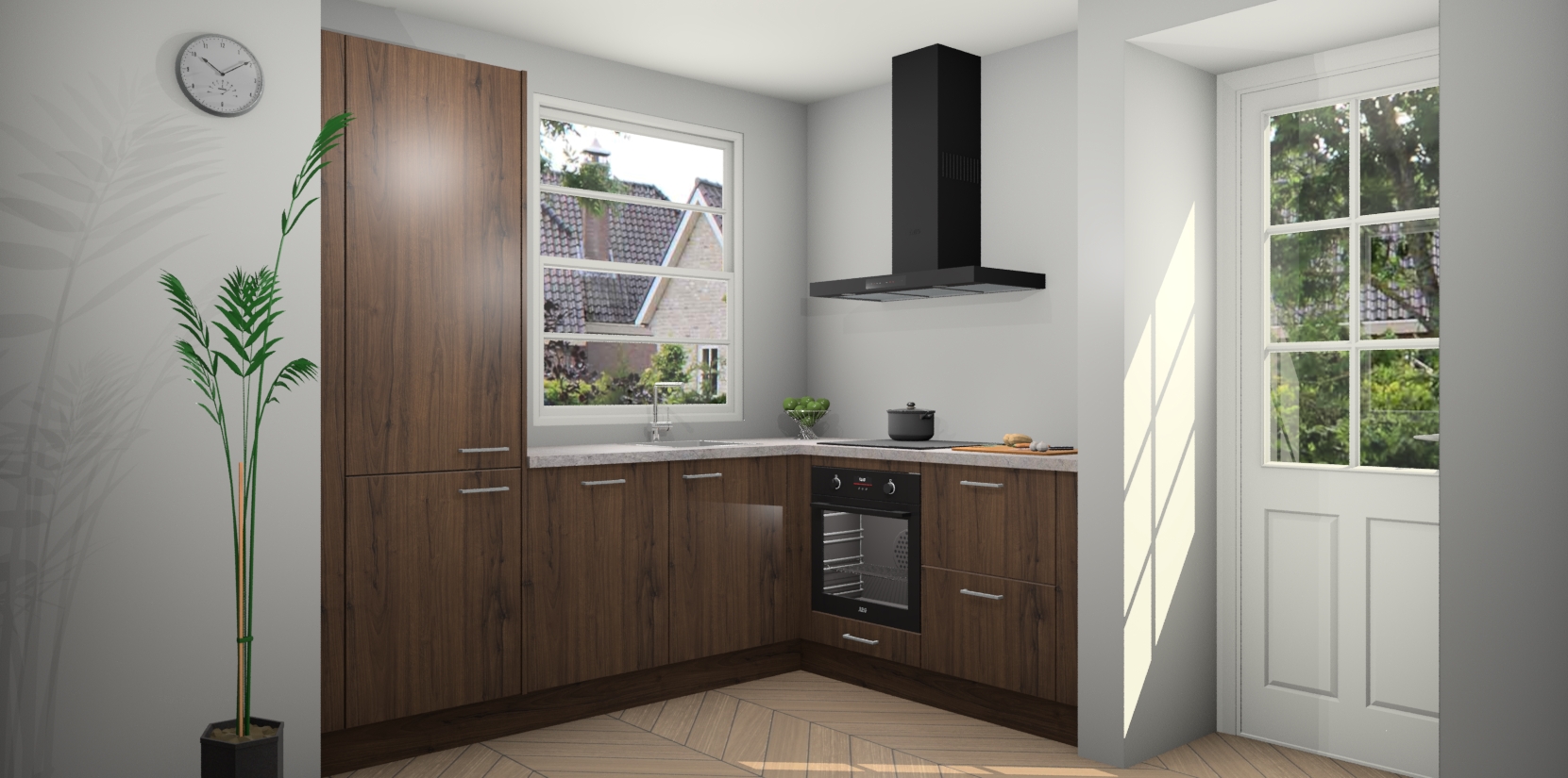 Wilt u een echte aanwinst voor uw keuken, maar bent u op zoek naar iets specialers dan de standaardkeukens? Kies dan voor de Noten keuken Harbin! Dit prachtige hoekkeukenontwerp geeft u alle ruimte om optimaal te genieten van heerlijk koken. Het uitmuntende afwerkingsniveau, de fraaie houtstructuur en de sfeervolle zwarte grepen maken van de Noten keuken Harbin de perfecte keuze voor zowel enthousiaste thuiskoks als design-minded interieurliefhebbers.
