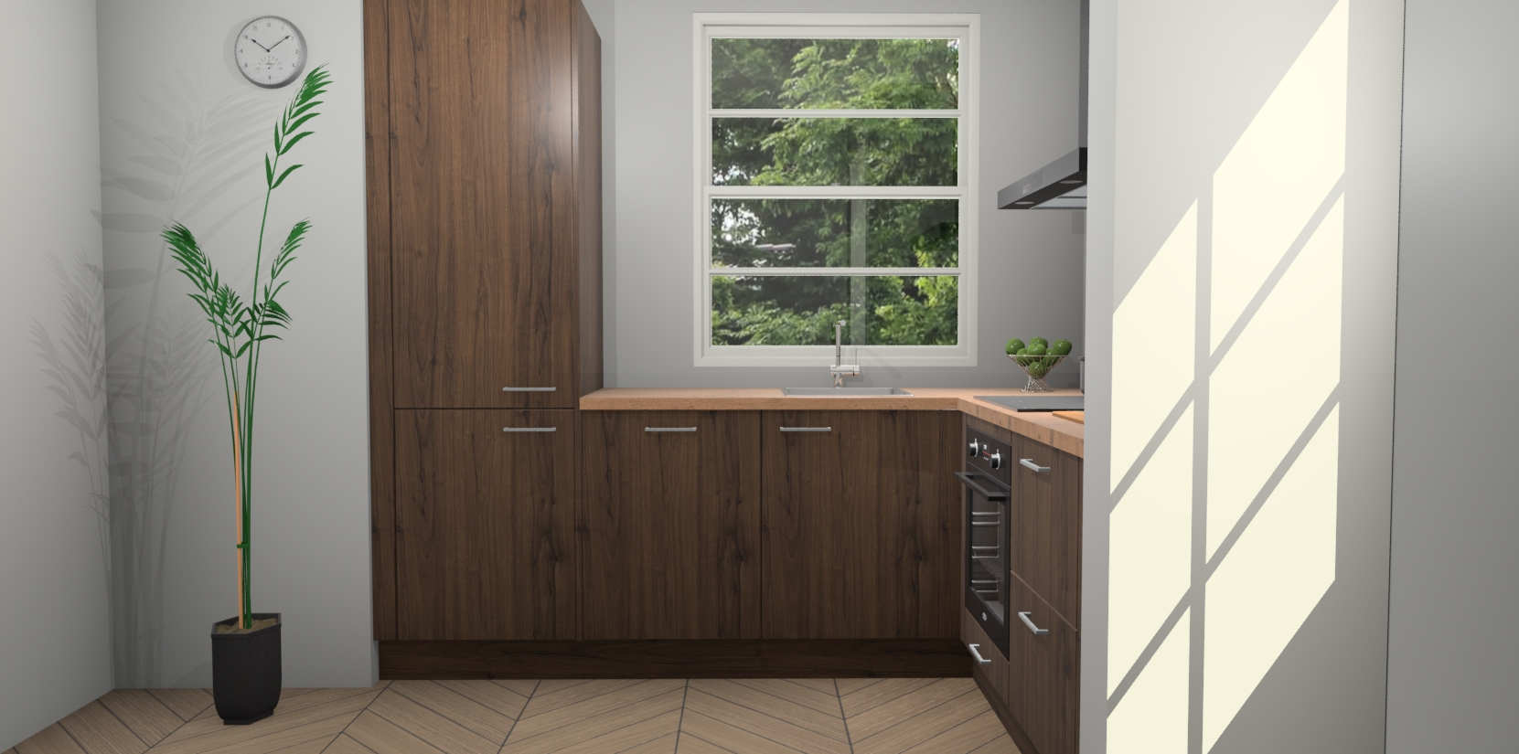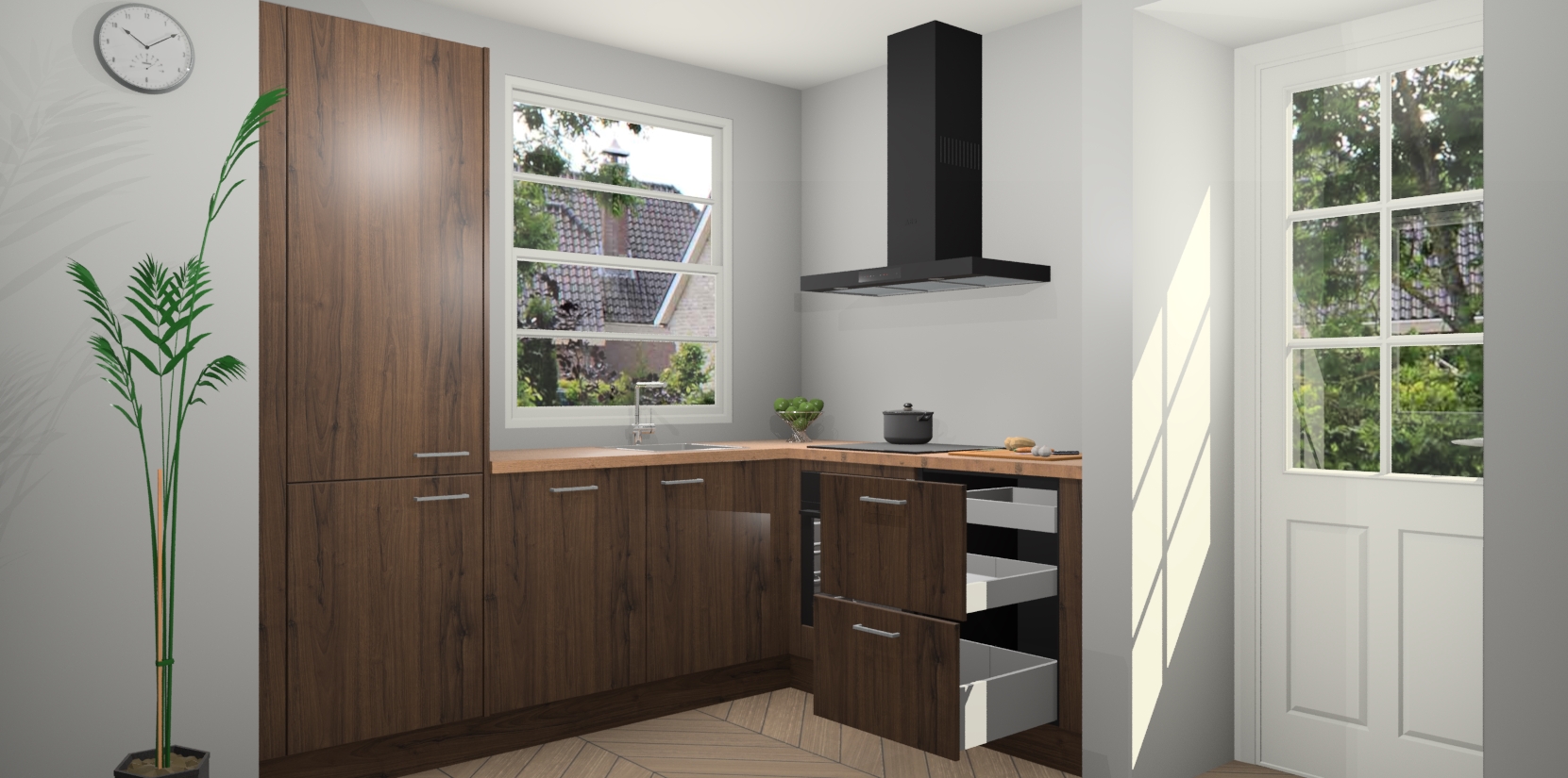 Wilt u een echte aanwinst voor uw keuken, maar bent u op zoek naar iets specialers dan de standaardkeukens? Kies dan voor de Noten keuken Harbin! Dit prachtige hoekkeukenontwerp geeft u alle ruimte om optimaal te genieten van heerlijk koken. Het uitmuntende afwerkingsniveau, de fraaie houtstructuur en de sfeervolle zwarte grepen maken van de Noten keuken Harbin de perfecte keuze voor zowel enthousiaste thuiskoks als design-minded interieurliefhebbers.