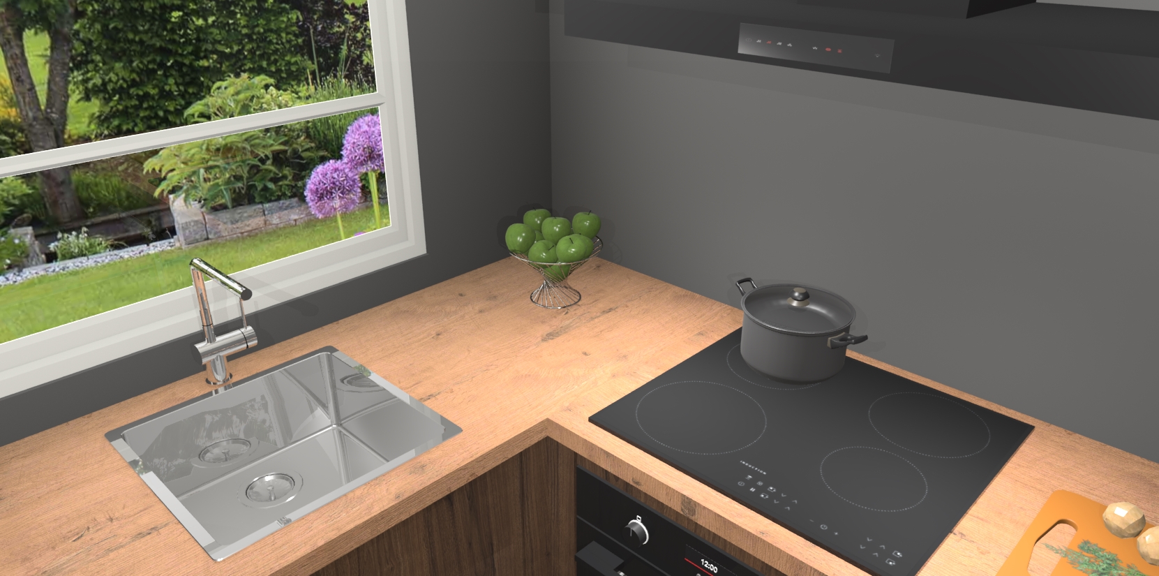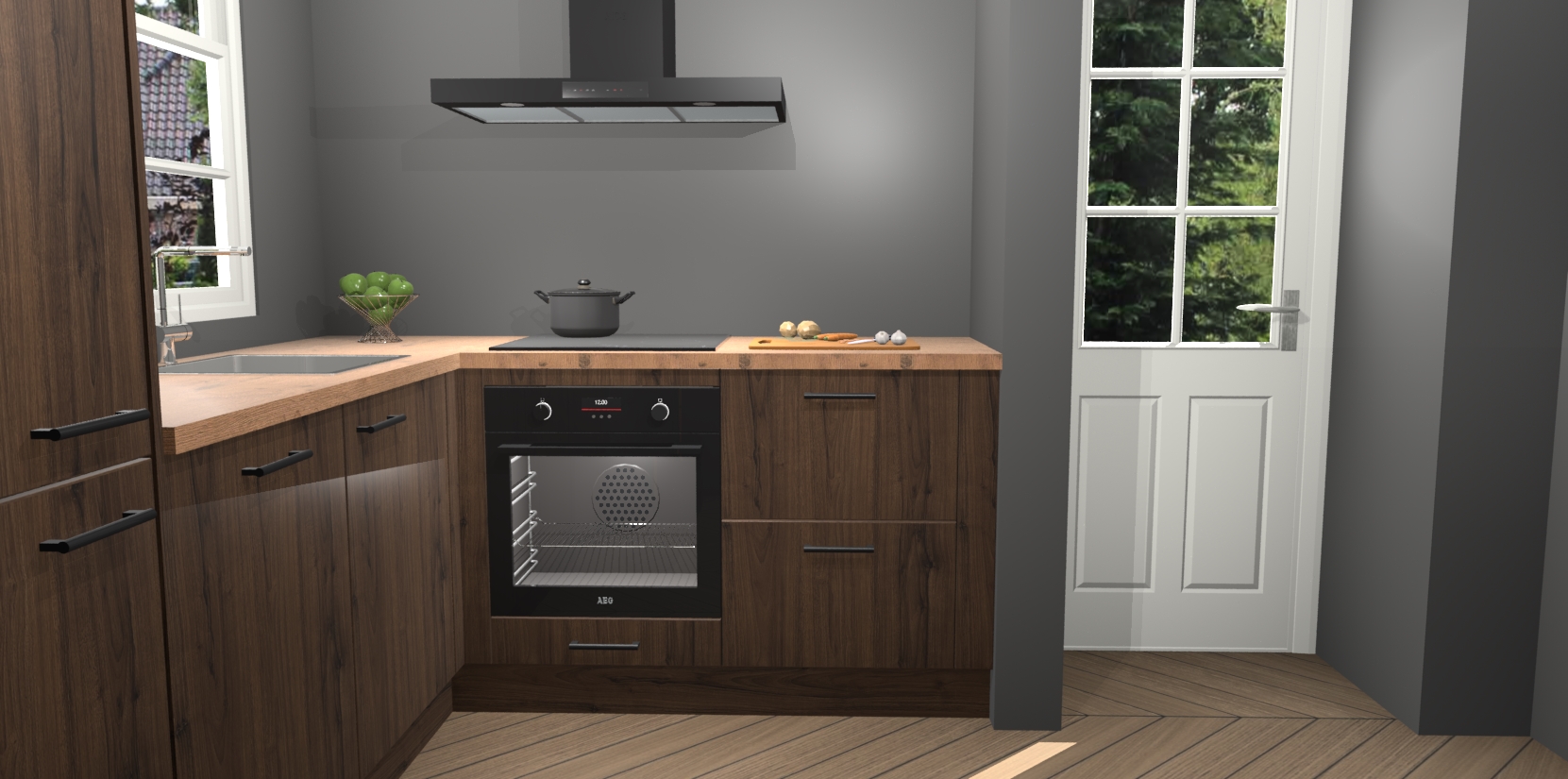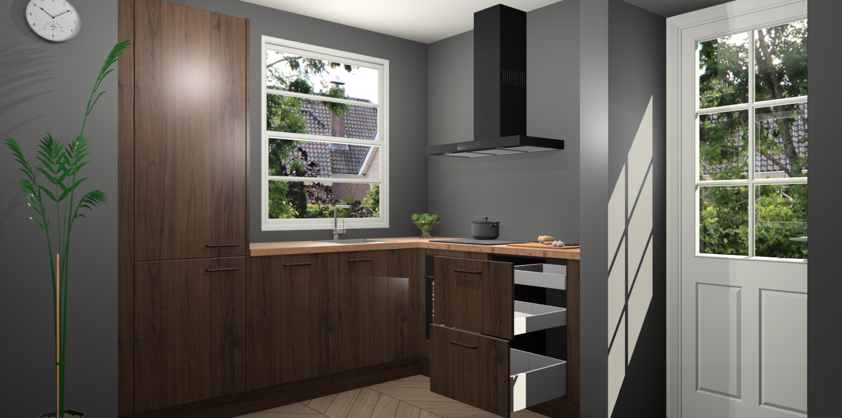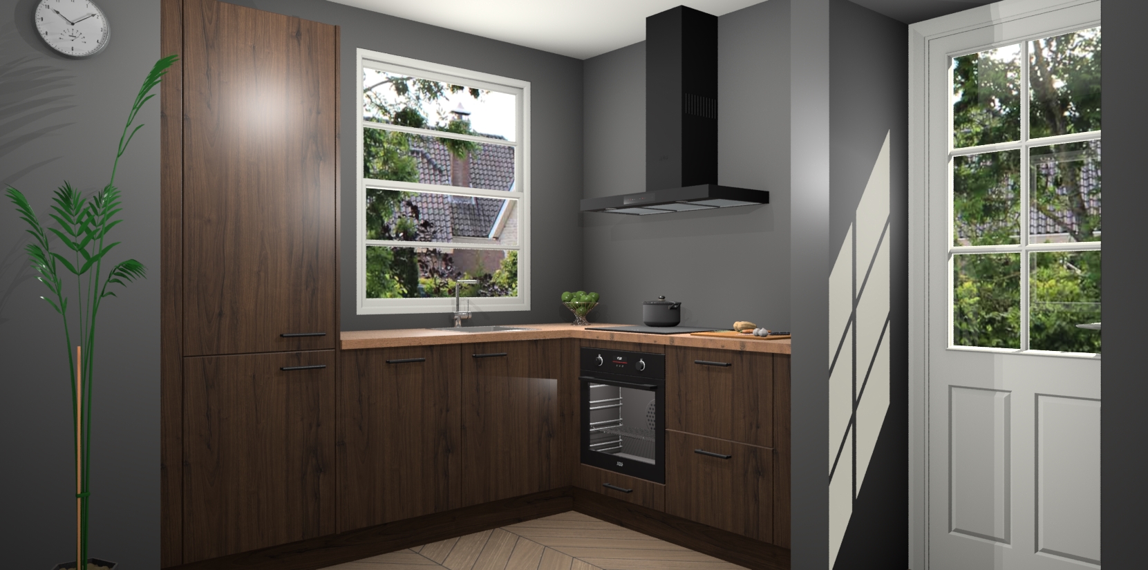 Wilt u een echte aanwinst voor uw keuken, maar bent u op zoek naar iets specialers dan de standaardkeukens? Kies dan voor de Noten keuken Harbin! Dit prachtige hoekkeukenontwerp geeft u alle ruimte om optimaal te genieten van heerlijk koken. Het uitmuntende afwerkingsniveau, de fraaie houtstructuur en de sfeervolle zwarte grepen maken van de Noten keuken Harbin de perfecte keuze voor zowel enthousiaste thuiskoks als design-minded interieurliefhebbers.