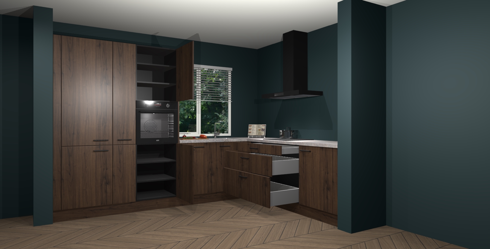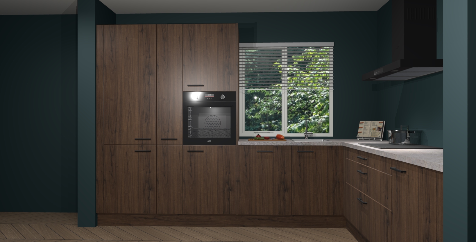 Met een modern, tijdloos design en ruime opslagruimte, zult u zich in no-time thuis voelen in uw nieuwe keuken. Uw leven wordt eenvoudiger met de soft-close deuren die voor het ultieme stille comfort zorgen - geen geluid dat u stoort terwijl u kookt. Ook is de keuken voorzien van 5 ingebouwde apparaten: een oven, inductie kookplaat, afzuigkap, vaatwasser en koelkast. Deze kunnen gemakkelijk na bestelling worden bijgewerkt naar AEG - waardoor uw luxe ervaring compleet is.