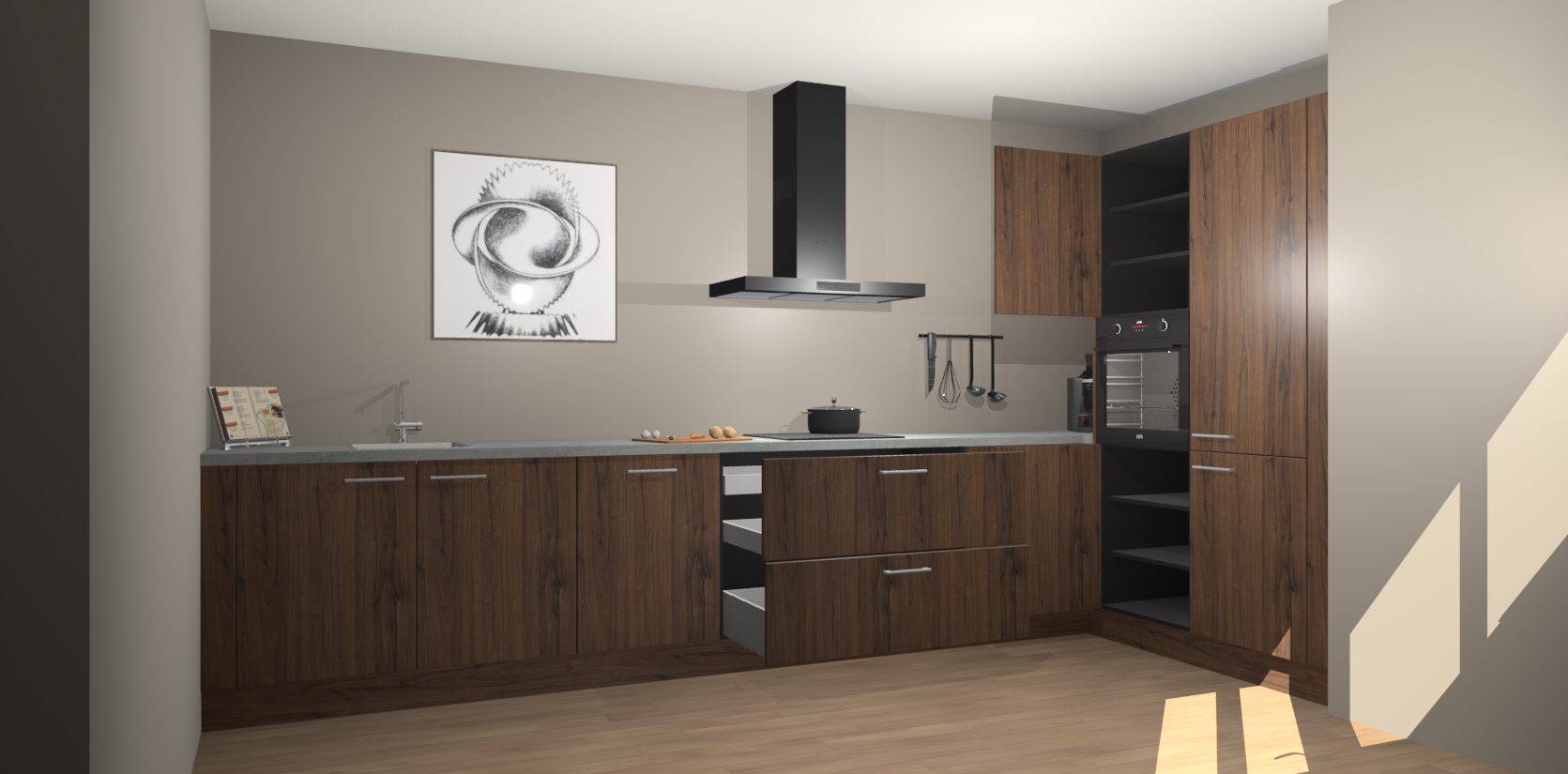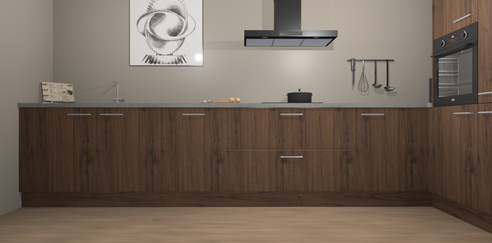 Welkom bij de Noten keuken Khao Lak. Deze prachtige keuken zal de komende jaren het middelpunt van de belangstelling in uw huis zijn. Uitgerust met vijf inbouwapparaten komt u nooit kookgereedschap tekort. Bovendien geeft de warme houtlook elke ruimte een uitnodigende en tijdloze uitstraling.