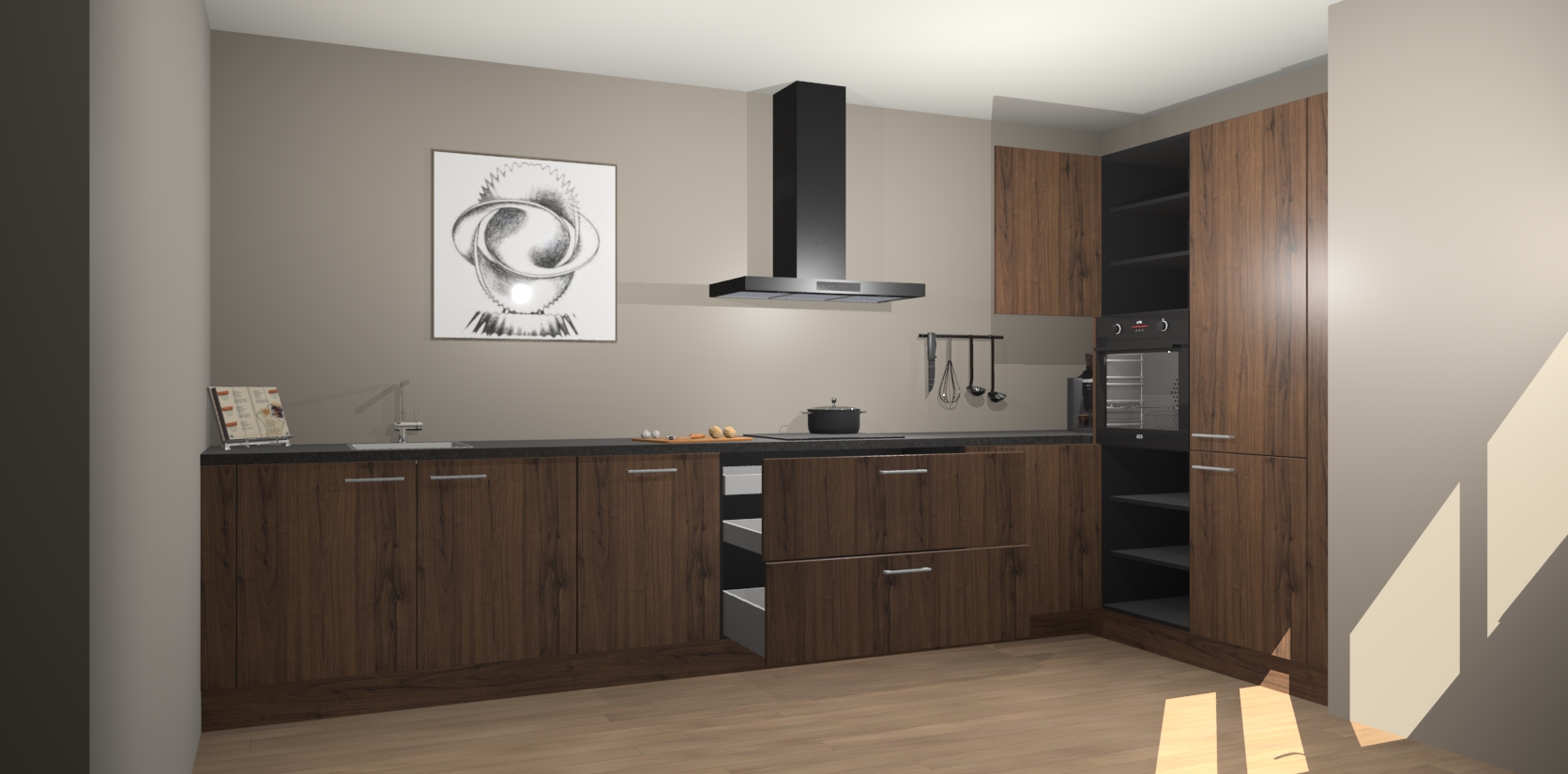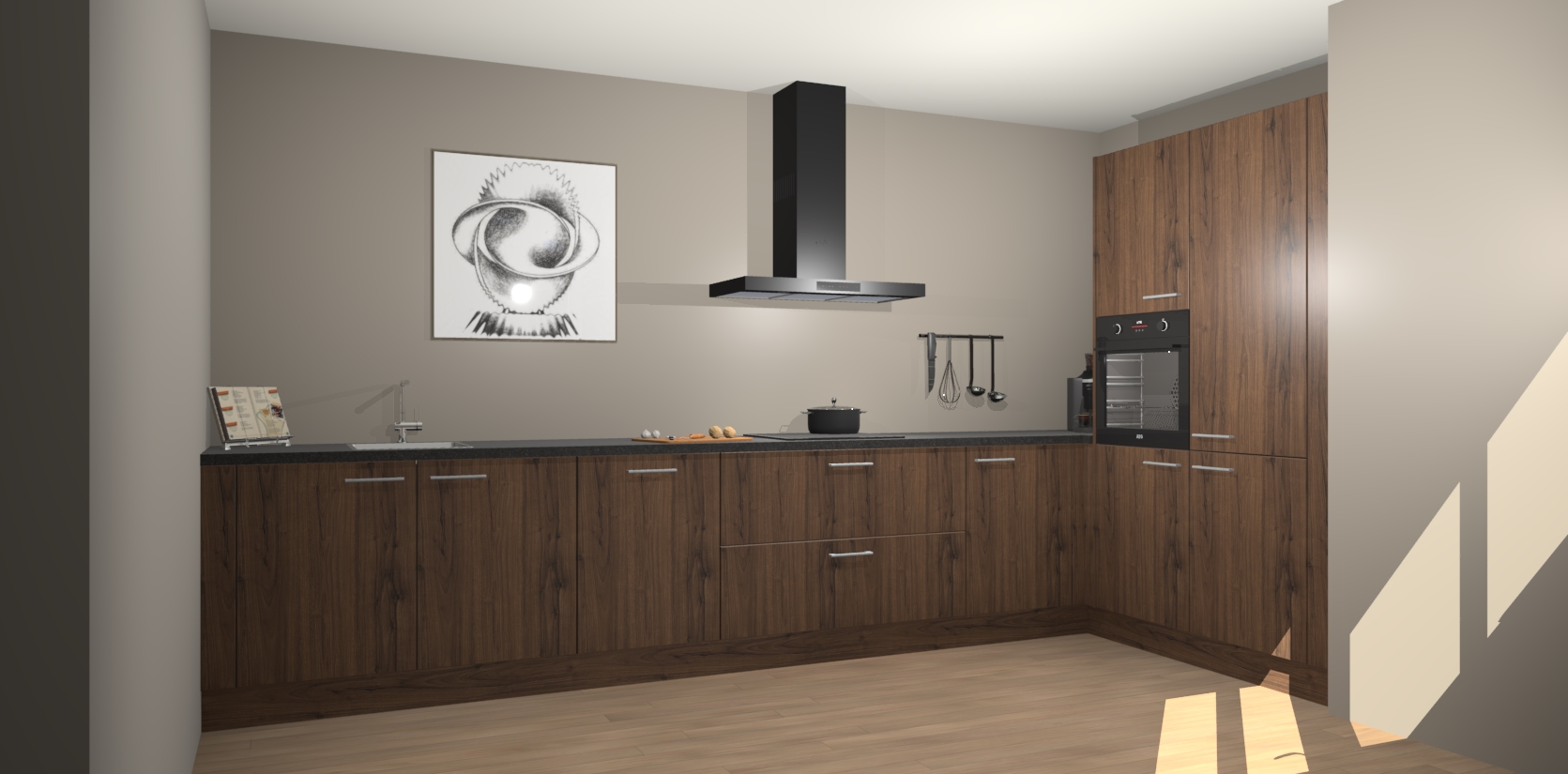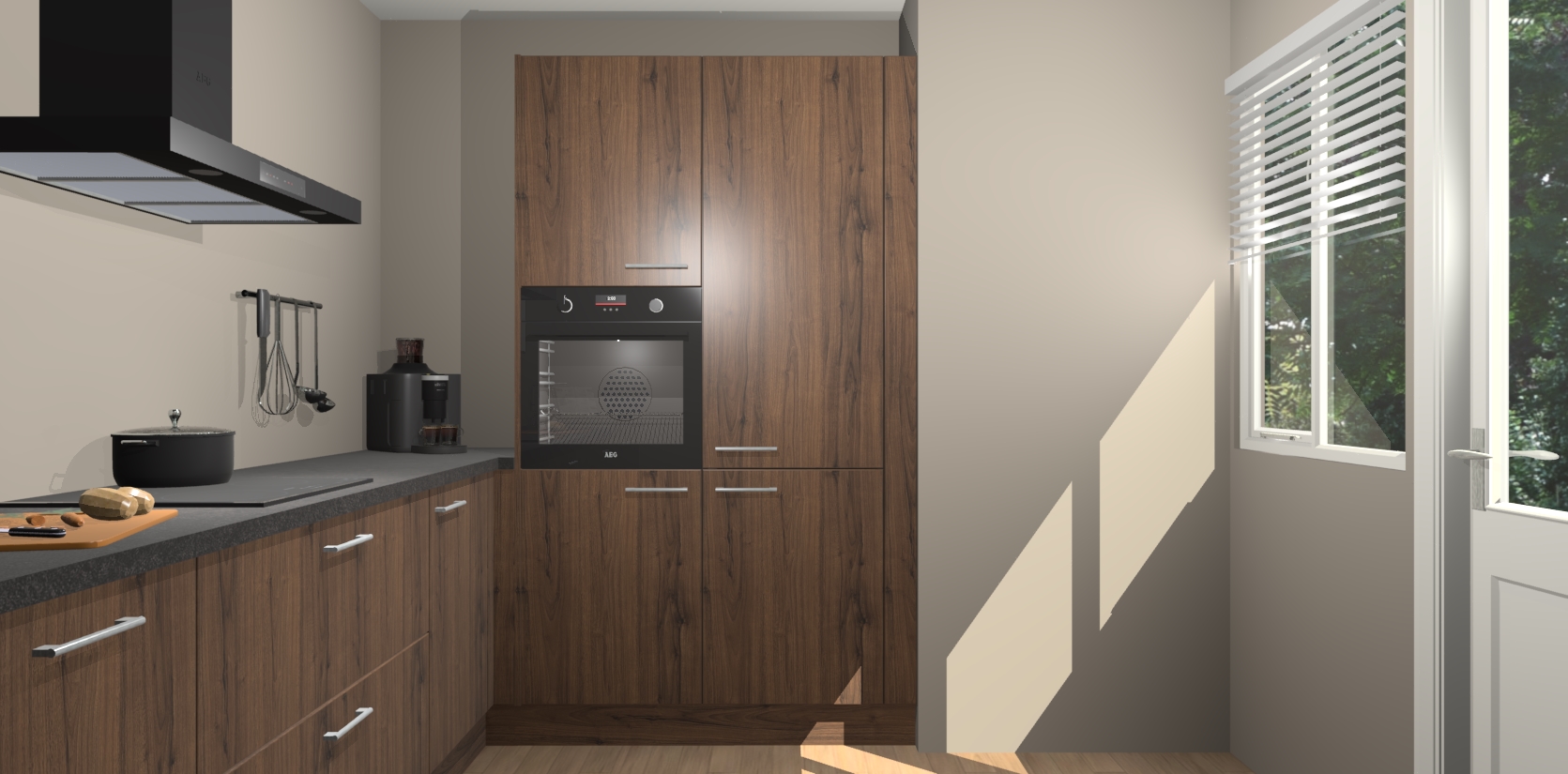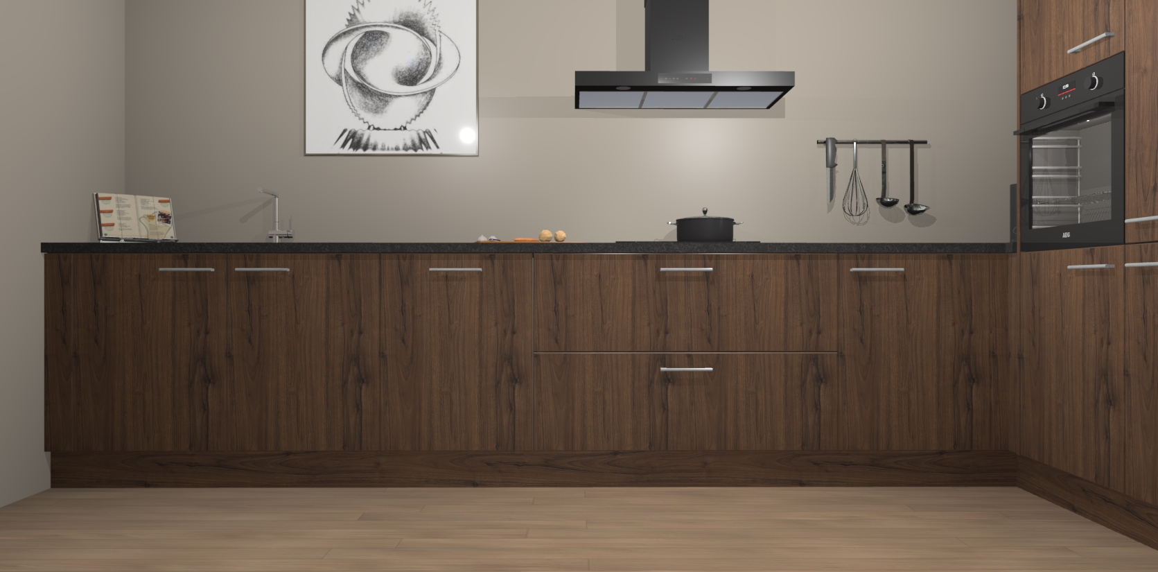 Welkom bij de Noten keuken Khao Lak. Deze prachtige keuken zal de komende jaren het middelpunt van de belangstelling in uw huis zijn. Uitgerust met vijf inbouwapparaten komt u nooit kookgereedschap tekort. Bovendien geeft de warme houtlook elke ruimte een uitnodigende en tijdloze uitstraling.