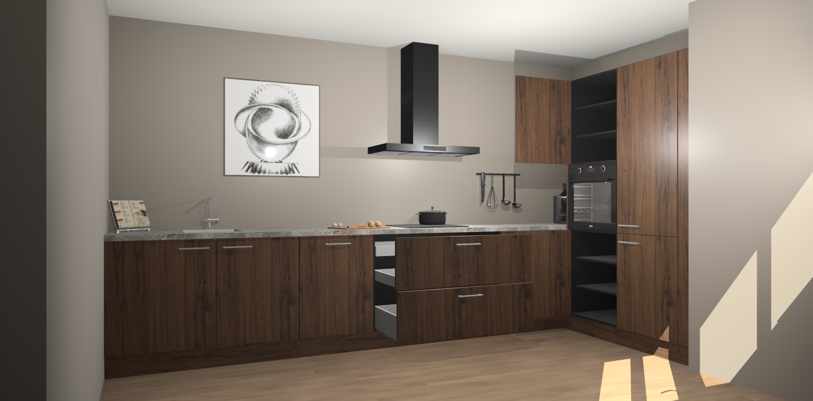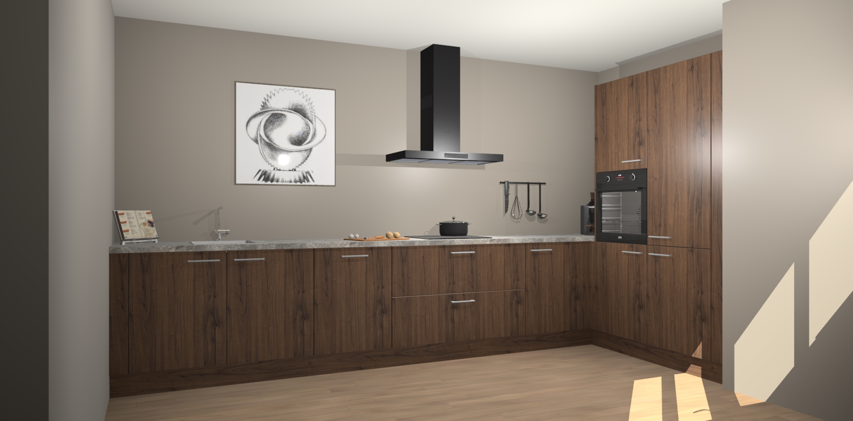 Welkom bij de Noten keuken Khao Lak. Deze prachtige keuken zal de komende jaren het middelpunt van de belangstelling in uw huis zijn. Uitgerust met vijf inbouwapparaten komt u nooit kookgereedschap tekort. Bovendien geeft de warme houtlook elke ruimte een uitnodigende en tijdloze uitstraling.
