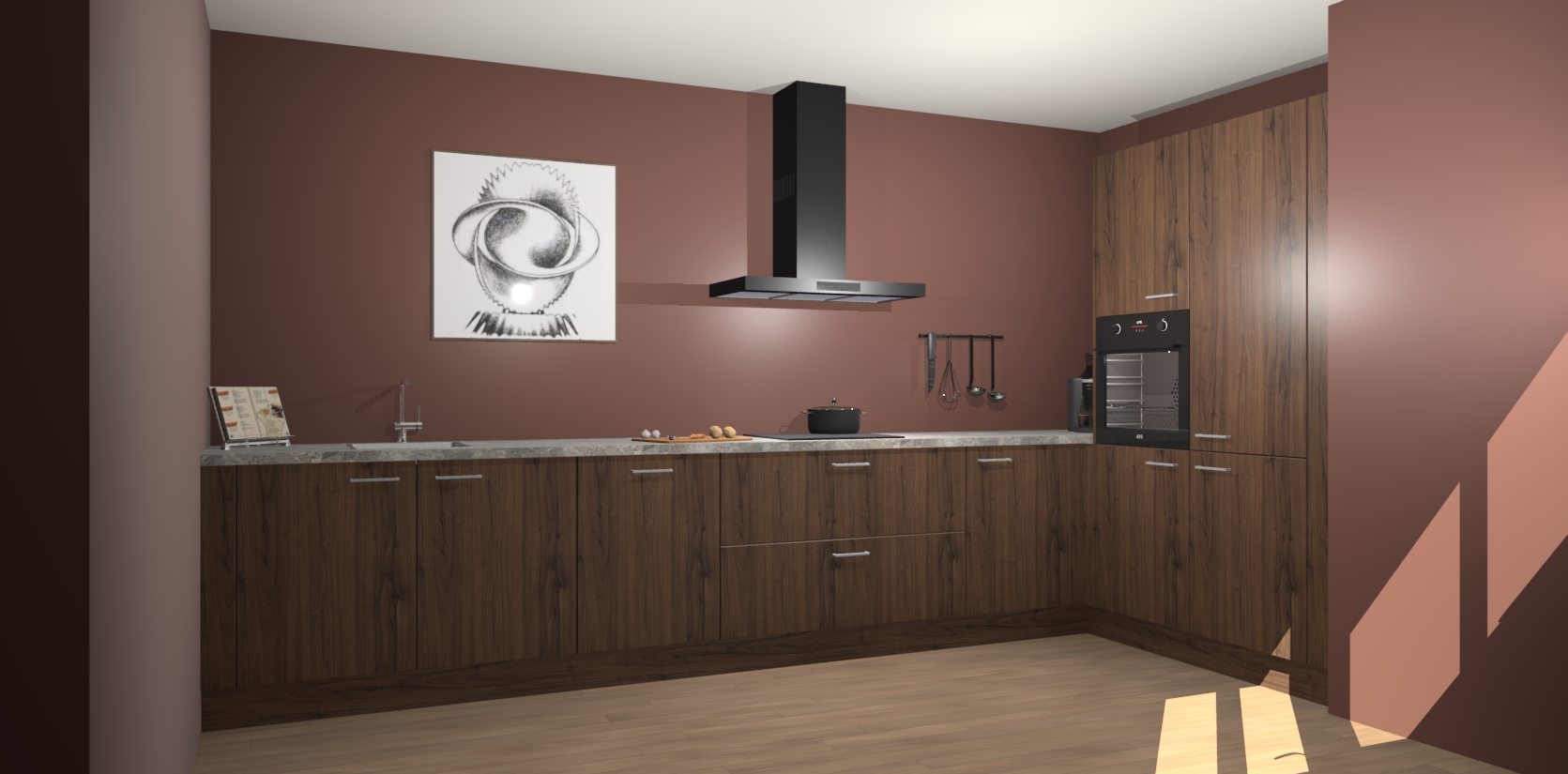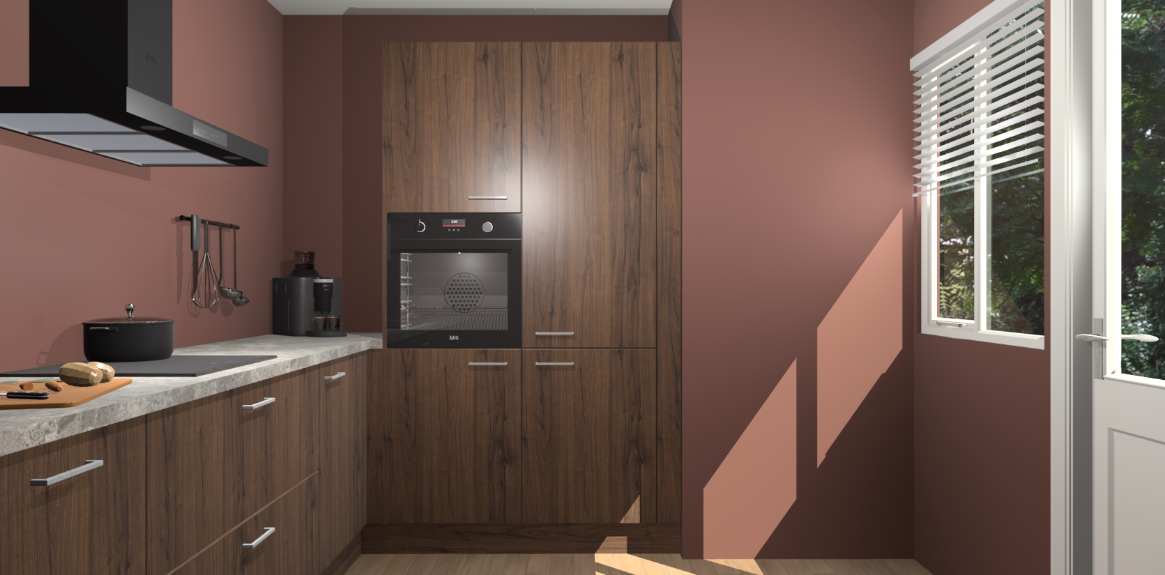 Welkom bij de Noten keuken Khao Lak. Deze prachtige keuken zal de komende jaren het middelpunt van de belangstelling in uw huis zijn. Uitgerust met vijf inbouwapparaten komt u nooit kookgereedschap tekort. Bovendien geeft de warme houtlook elke ruimte een uitnodigende en tijdloze uitstraling.