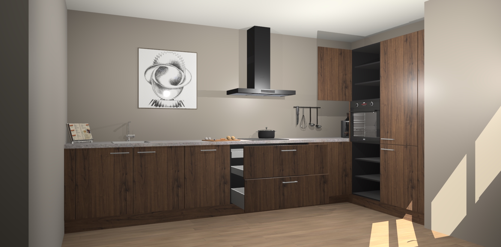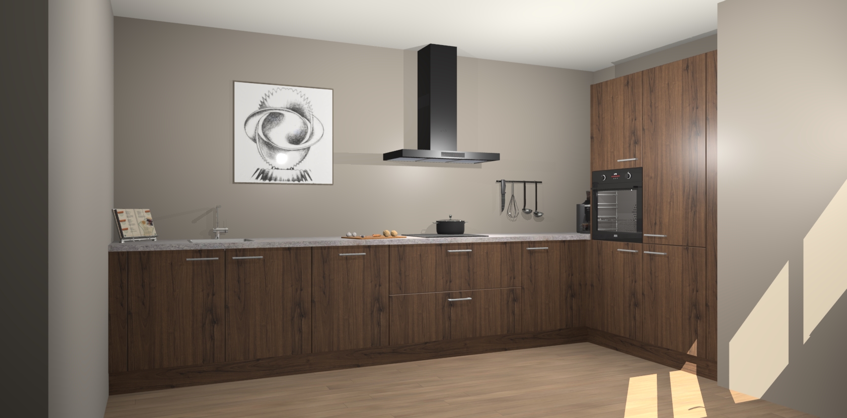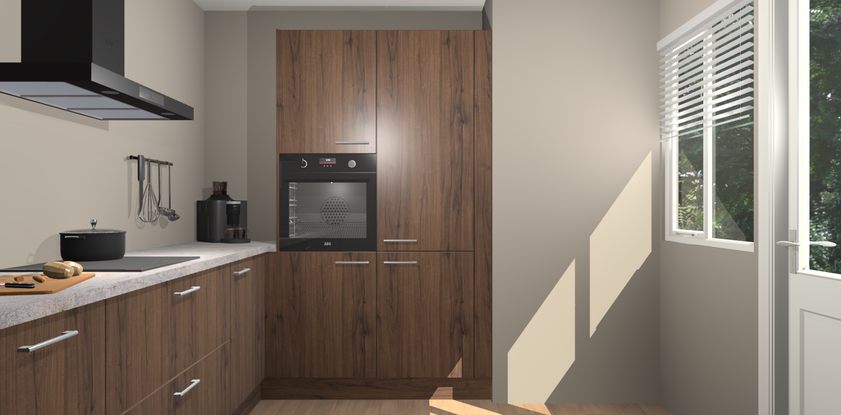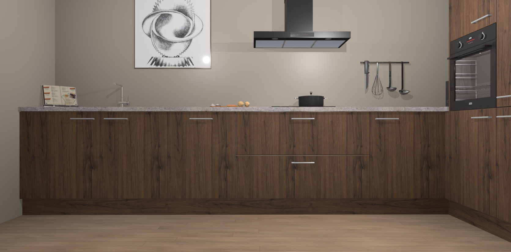 Welkom bij de Noten keuken Khao Lak. Deze prachtige keuken zal de komende jaren het middelpunt van de belangstelling in uw huis zijn. Uitgerust met vijf inbouwapparaten komt u nooit kookgereedschap tekort. Bovendien geeft de warme houtlook elke ruimte een uitnodigende en tijdloze uitstraling.